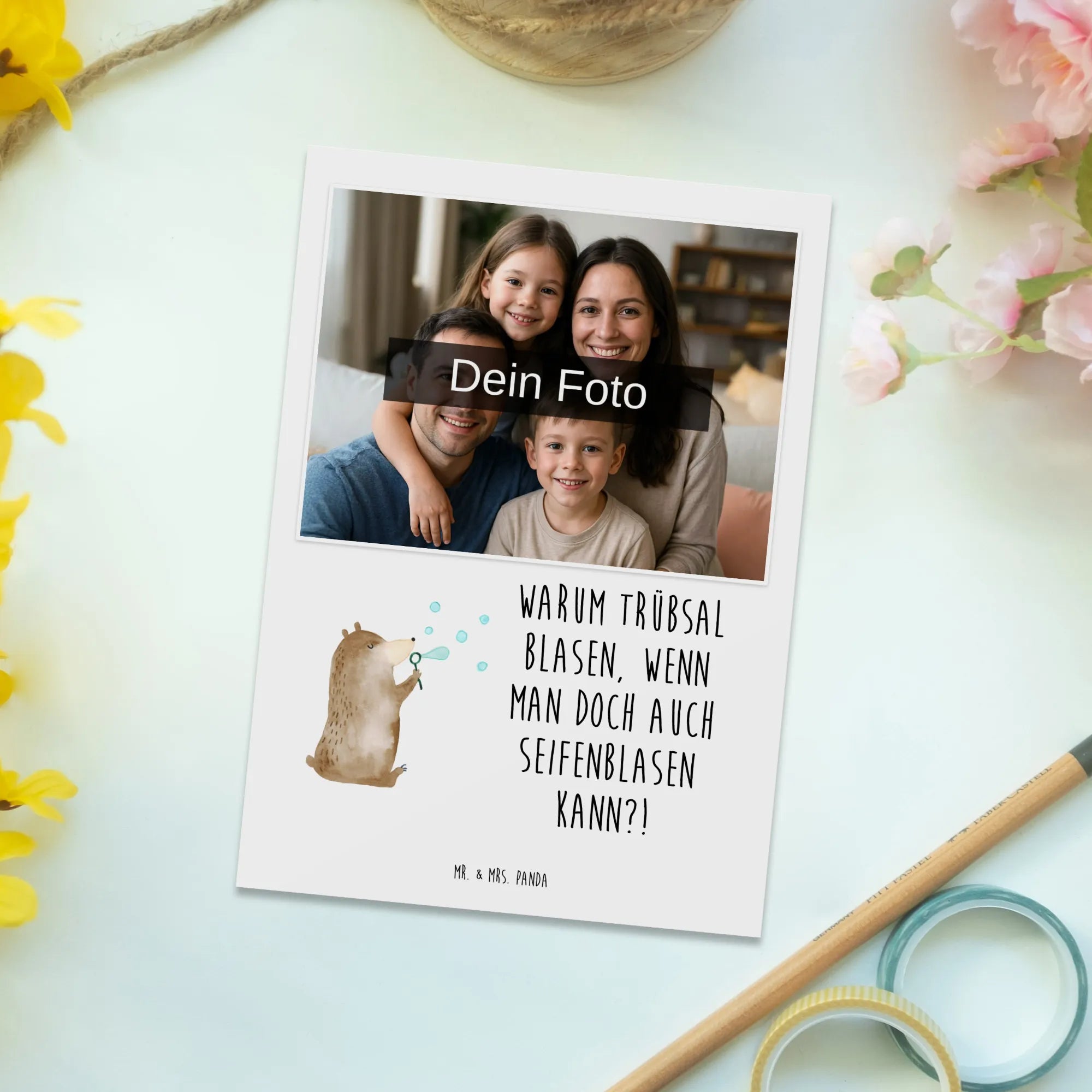 Suchst du nach dem perfekten Geschenk, das nicht nur süß, sondern auch persönlich ist? Dann ist die personalisierte Foto Postkarte mit dem entzückenden Motiv "Bär Seifenblasen" von Mr. & Mrs. Panda genau das richtige für dich! Diese Postkarte vereint Freude und ein bisschen Humor – perfekt für jeden Anlass!