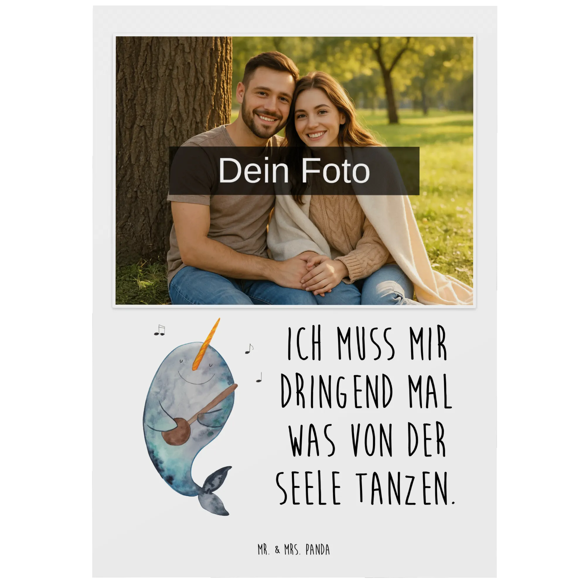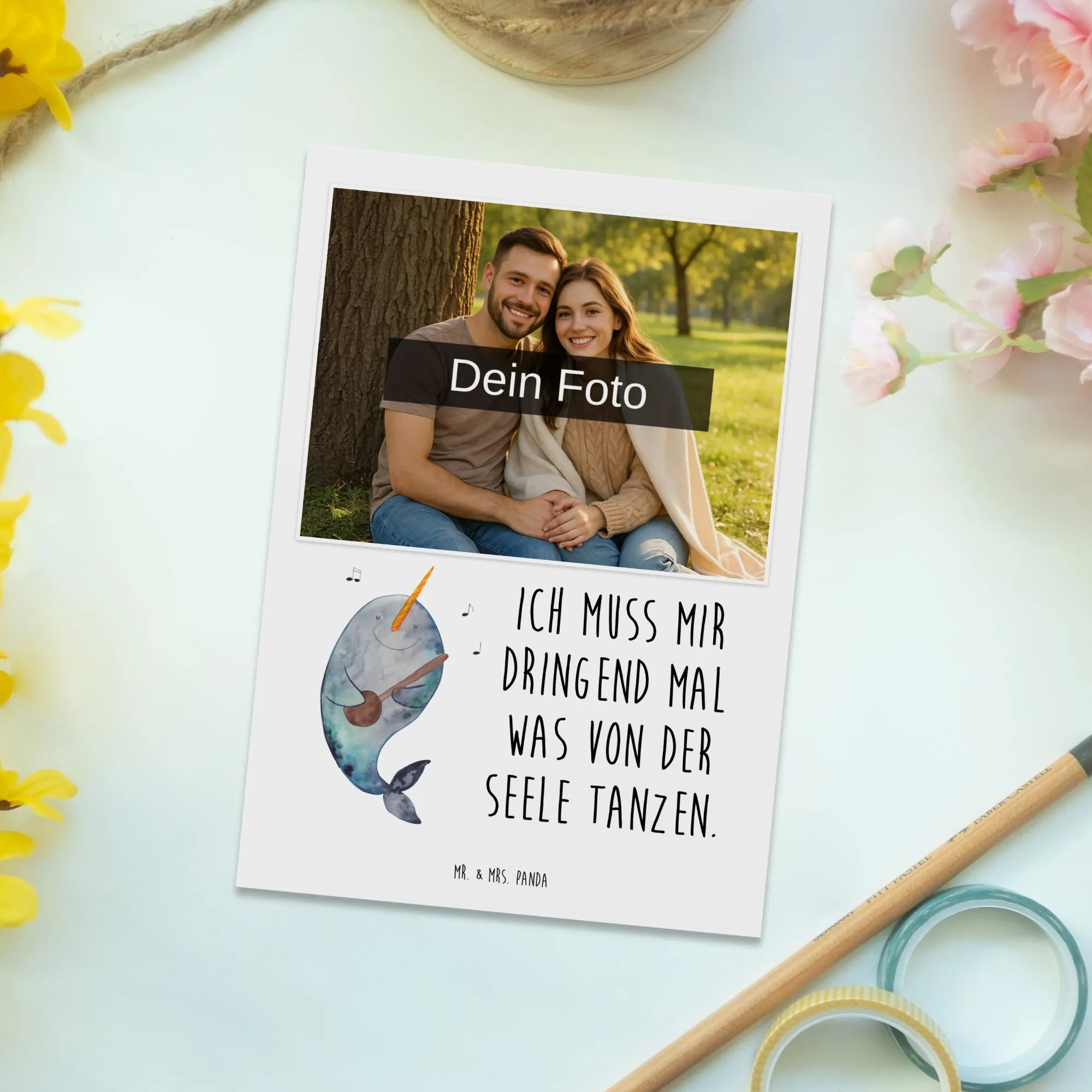 Die personalisierte Foto Postkarte mit dem fröhlichen Narwal und seiner Gitarre ist das perfekte Geschenk für all jene, die die Faszination des Meeres und die Freude am Tanzen lieben. Mit dem Motto "Ich muss mir dringend mal was von der Seele tanzen" bringt diese Karte ein Lächeln auf jedes Gesicht.