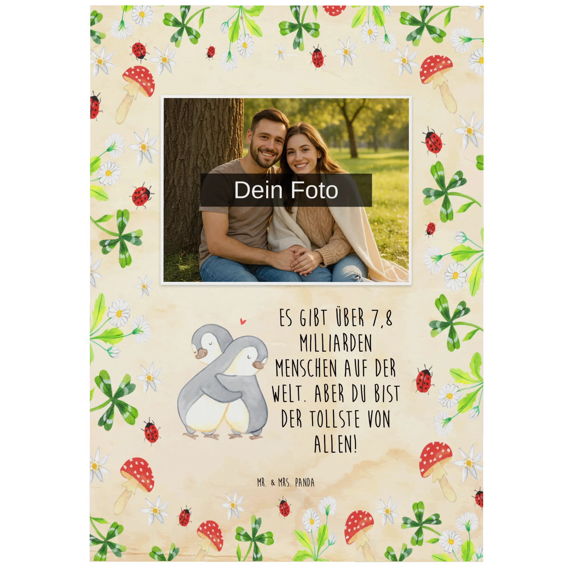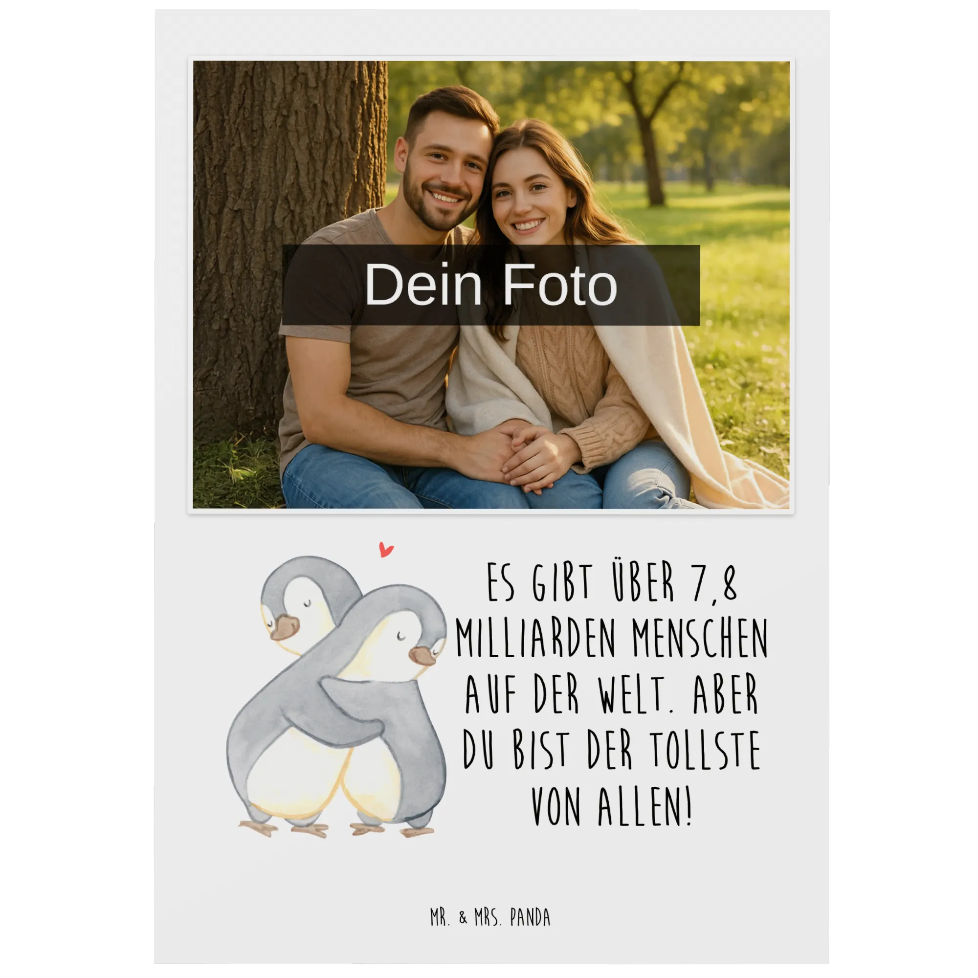 Personalisierte Foto Postkarte „Pinguine Kuscheln“ – ein kleines Liebeswunder von Mr. & Mrs. Panda! Die beiden Pinguine kuscheln innig, ein rotes Herz schwebt über ihnen und strahlt Wärme und Verbundenheit aus. Kombiniert mit deinem eigenen Foto und dem liebenswerten Spruch „Es gibt über 7,8 Milliarden Menschen auf der Welt. Aber du bist der Tollste von allen!“ wird diese Postkarte zum perfekten Liebesgeschenk für Valentinstag, Jahrestag, Hochzeitstag oder einfach als süße Überraschung für die Freundin, den Freund oder den Ehemann. ❤️