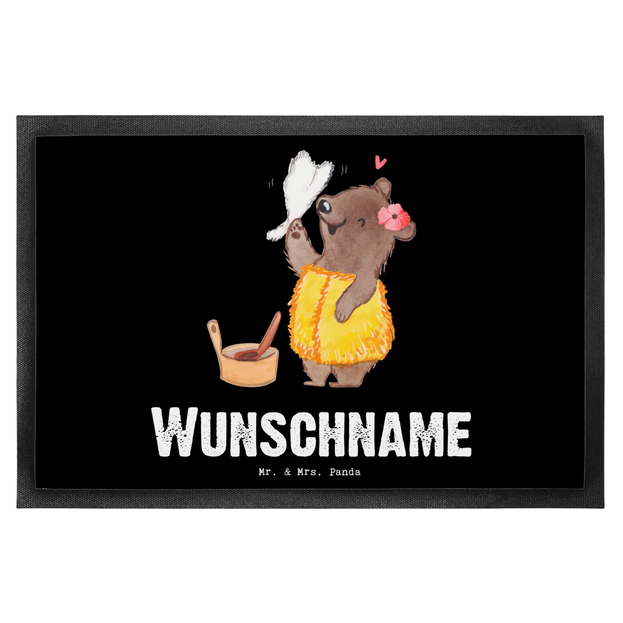 Entdecke die liebevoll gestaltete personalisierte Fußmatte "Saunameisterin mit Herz" aus der Kollektion Berufe von Mr. & Mrs. Panda!