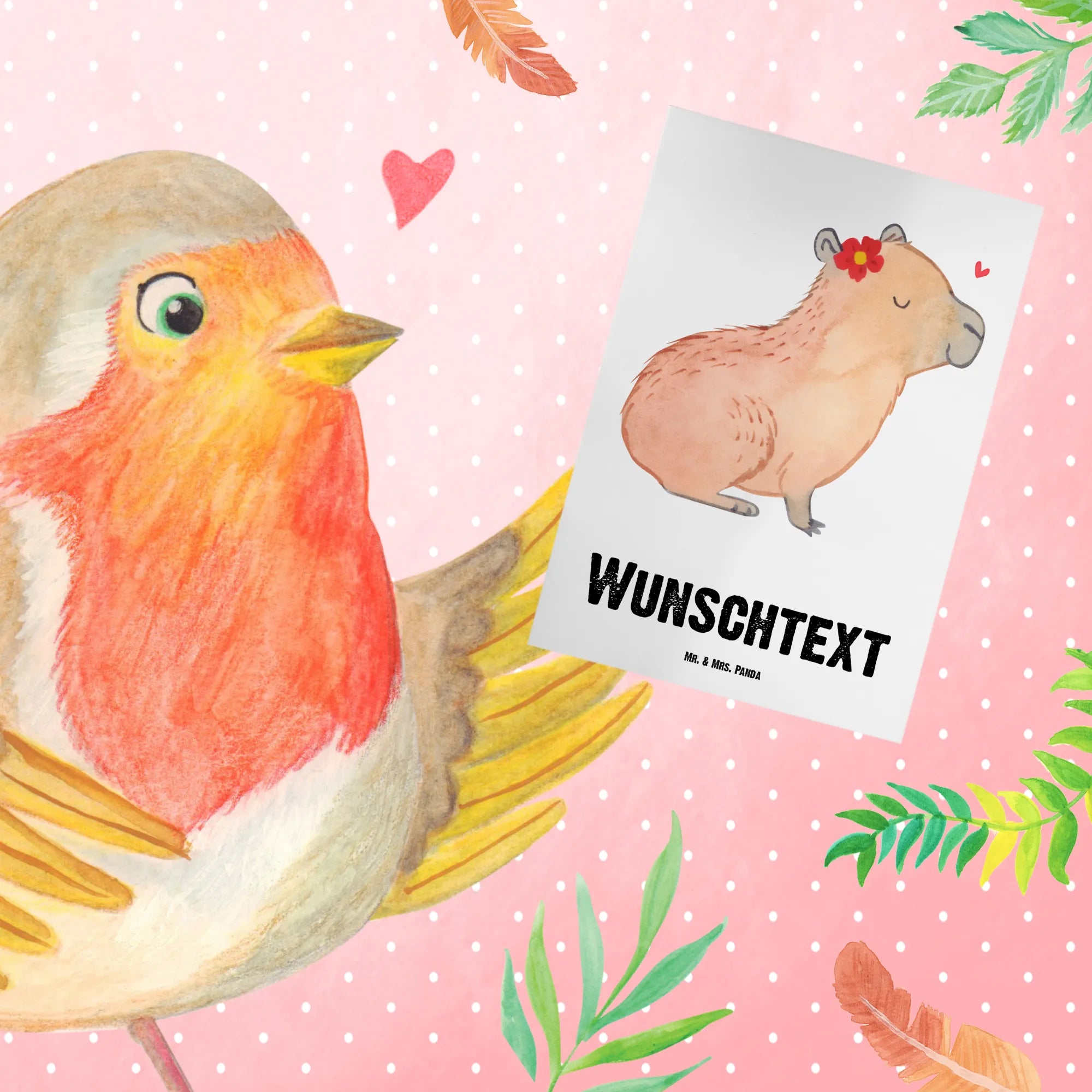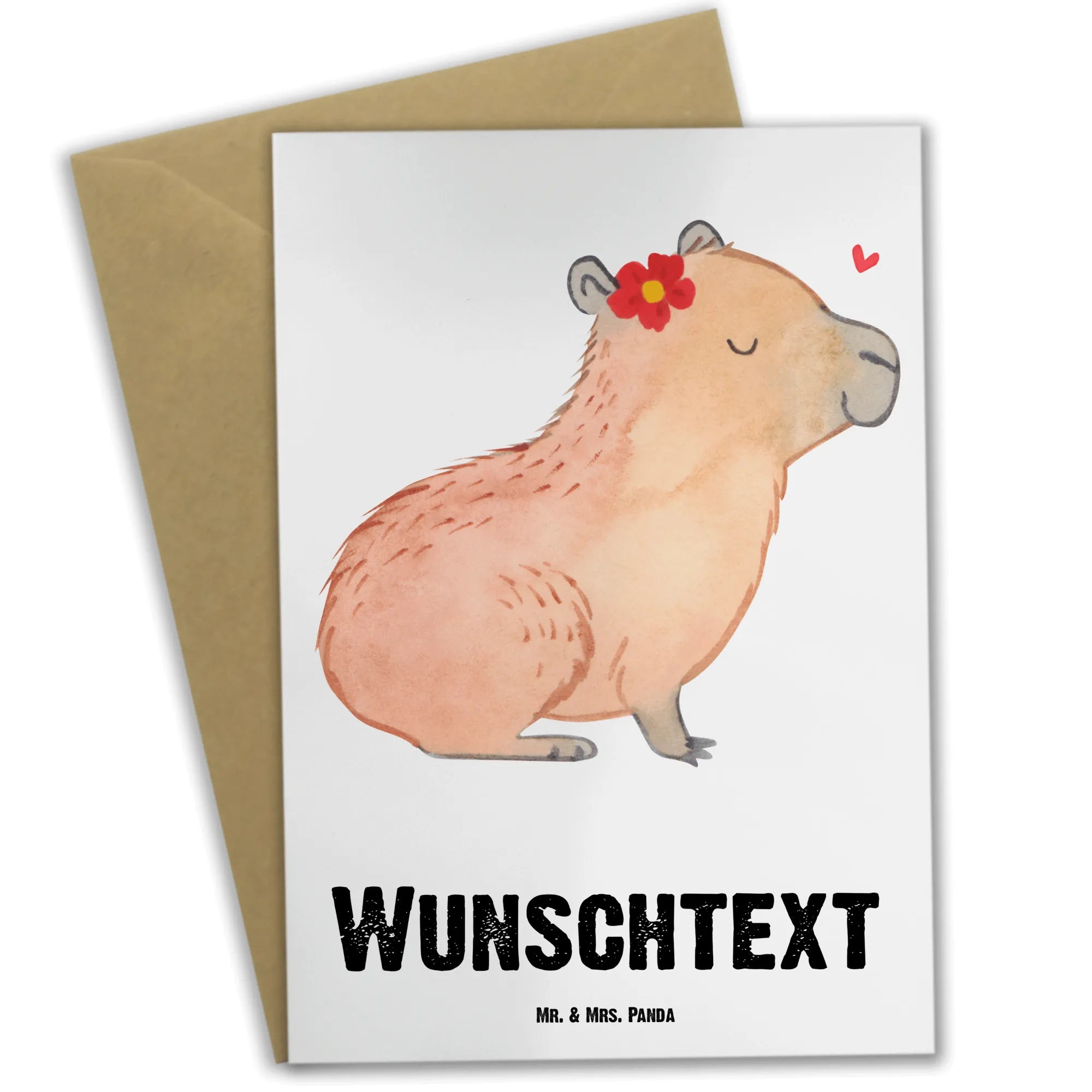 Jedes Mal, wenn der Empfänger die Karte öffnet, wird er in die bunte und fröhliche Welt des Capybaras entführt, das mit einer süßen Blume im Haar und einem kleinen Herz dargestellt ist. Die Illustration strahlt Wärme und Zufriedenheit aus und ermutigt dazu, das Leben von seiner schönsten Seite zu sehen.