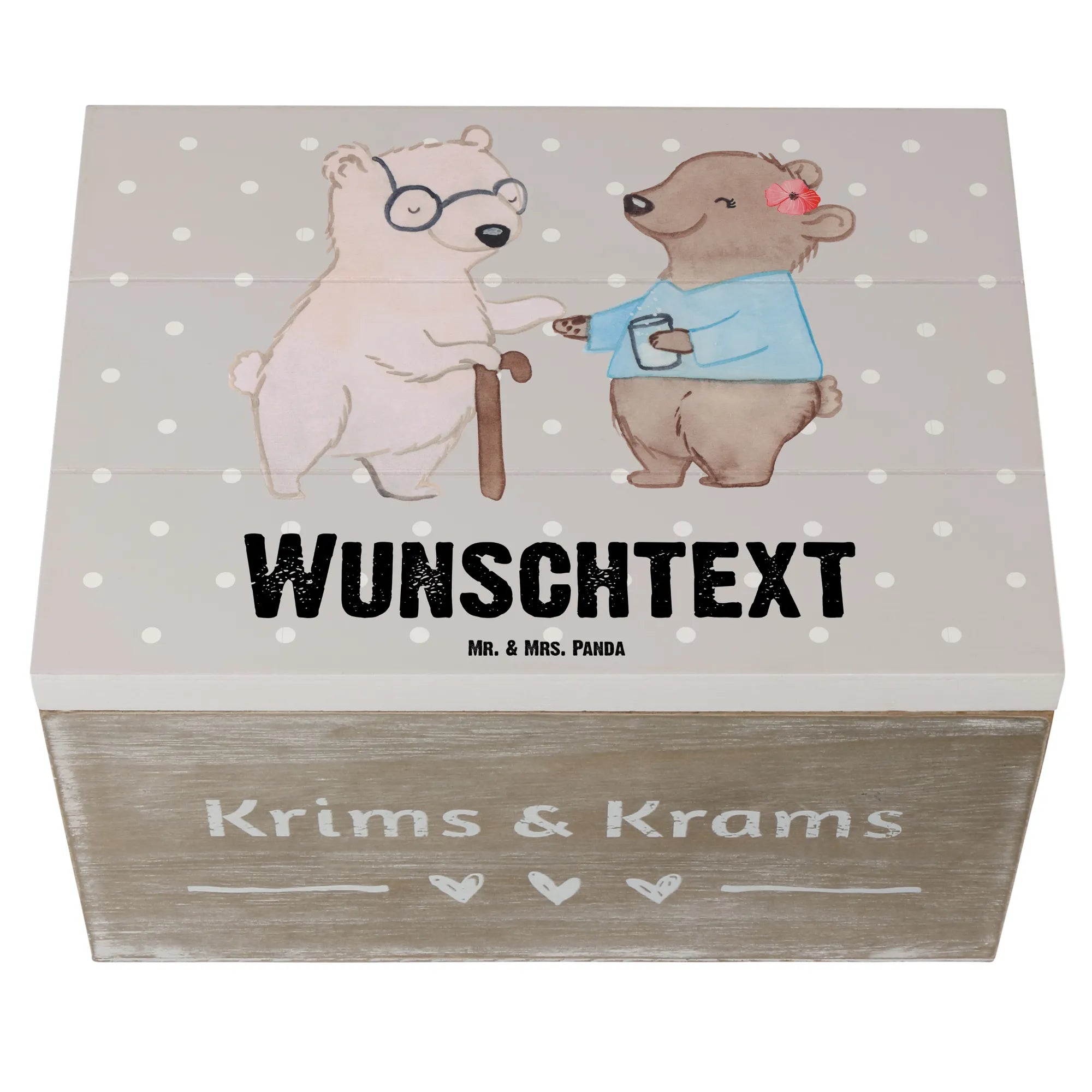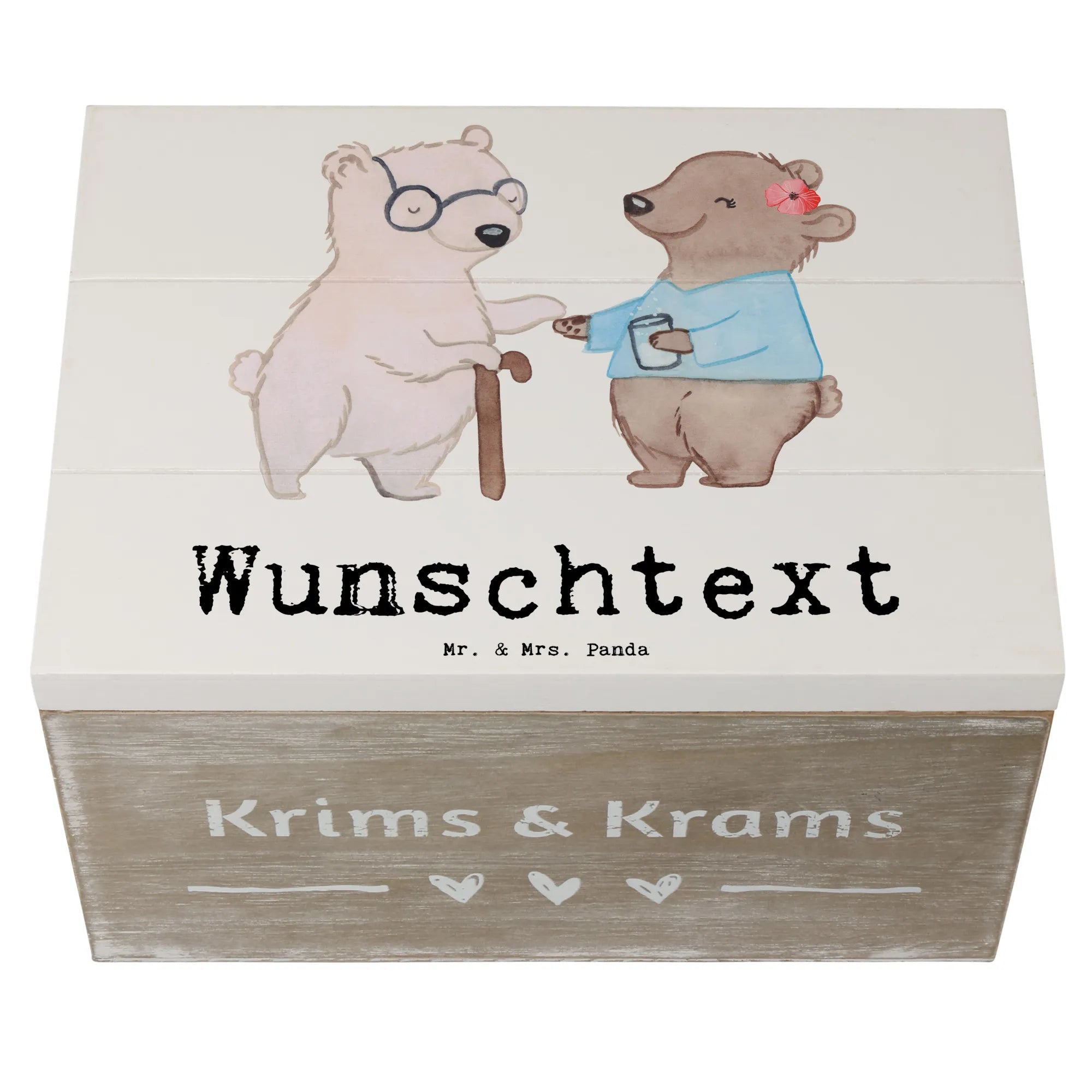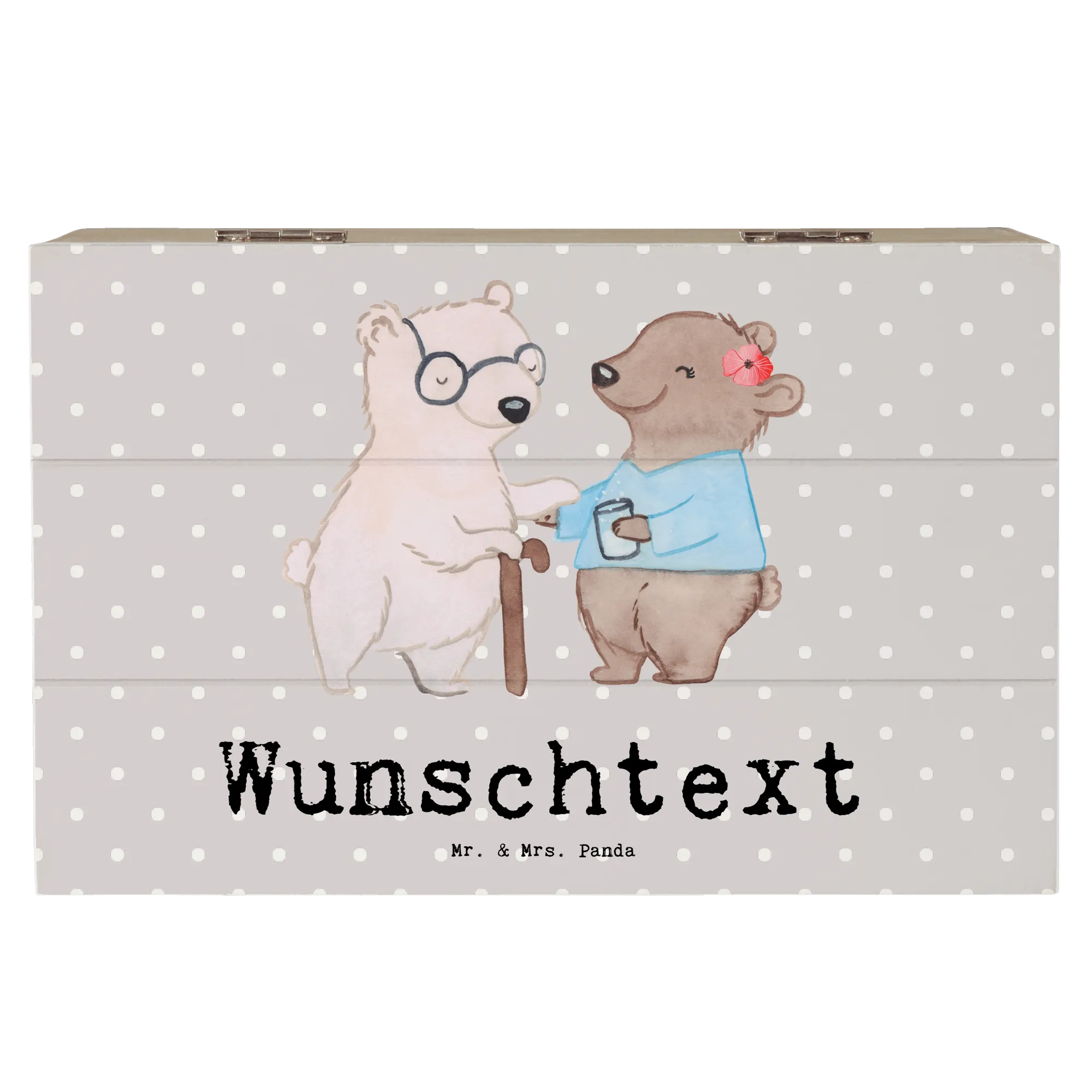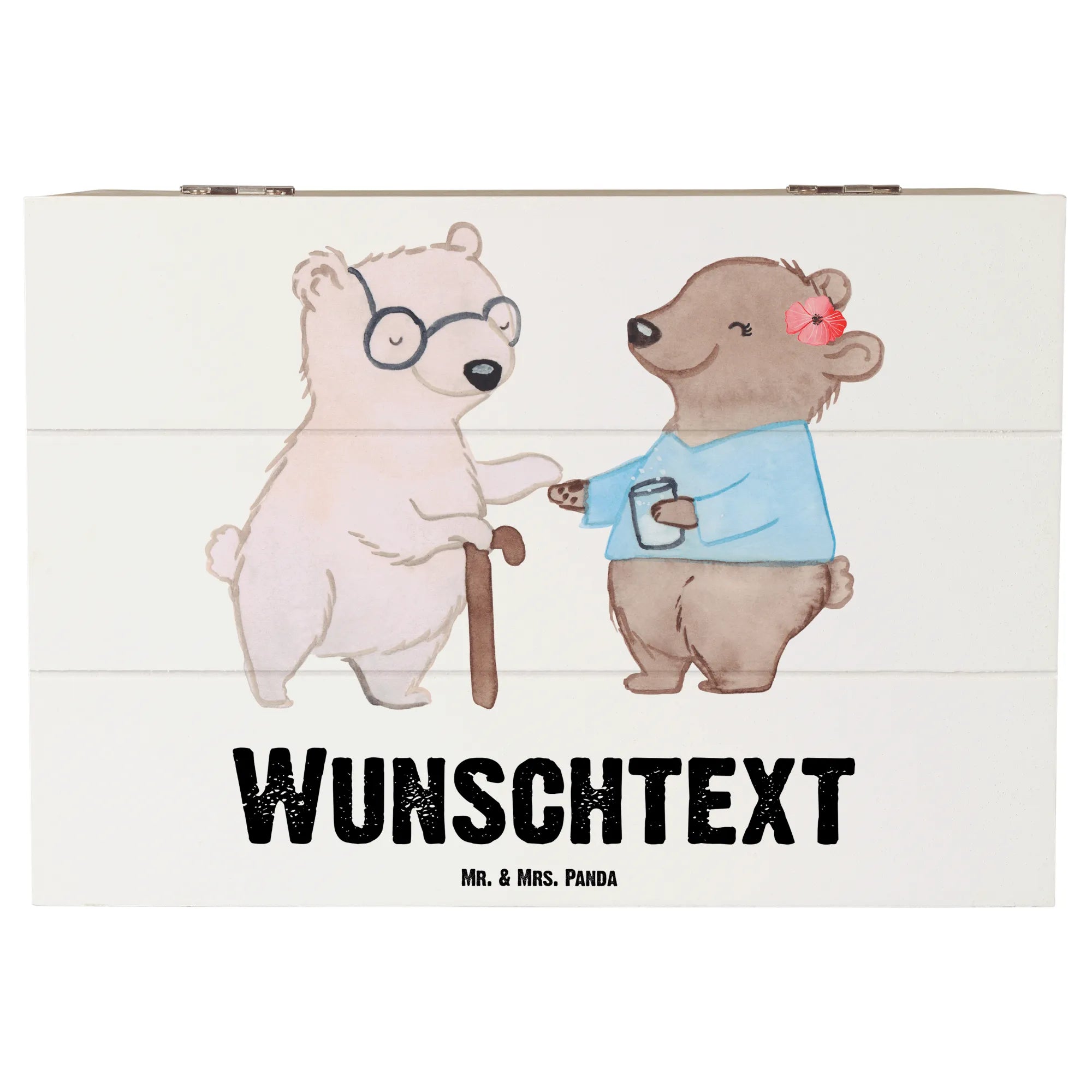 Die personalisierte Holzkiste Altenpflegerin mit Herz von Mr. & Mrs. Panda ist das ideale Geschenk für alle, die in der Pflege arbeiten oder diese wunderbare Berufsgruppe unterstützen möchten. Egal ob zur bestandenen Ausbildung, zum Ruhestand oder einfach um "Danke" zu sagen – diese Kiste ist mehr als nur ein normales Geschenk. Sie trägt eine liebevolle Botschaft: "Du bist nur ein halber Mensch, wenn du keine Altenpflegerin bist." Mit einem zauberhaften Design, das einen niedlichen Bären zeigt, der einer senioren Bärenfigur eine Hand reicht, strahlt diese Kiste Herz und Fürsorge aus.