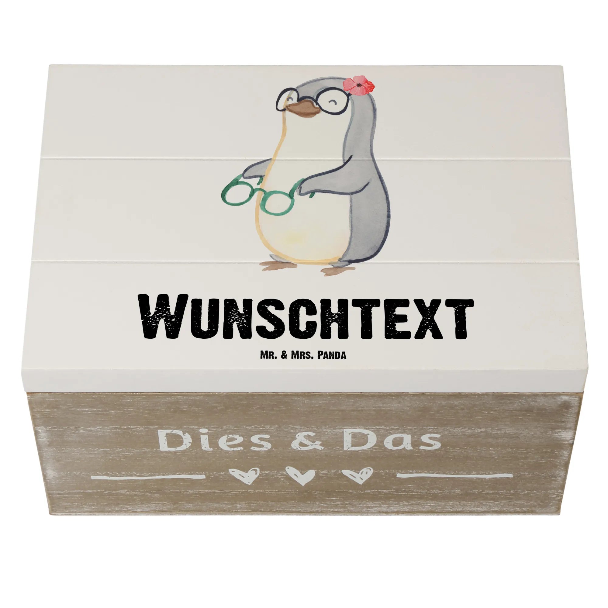 Entdecke die wunderbare Welt der personalisierten Holzkiste von Mr. & Mrs. Panda! Unsere wunderschöne Holzkiste mit dem Motiv Augenoptikerin mit Herz ist das perfekte Geschenk für alle, die im Bereich Augenheilkunde arbeiten oder eine große Leidenschaft für Brillen und Augenoptik haben. Mit einem liebevoll gestalteten Pinguin, der stolz seine angepasste Brille in der Hand hält, bringt die Kiste nicht nur ein Lächeln auf dein Gesicht, sondern auch die Herzen deiner Liebsten zum Schmelzen.