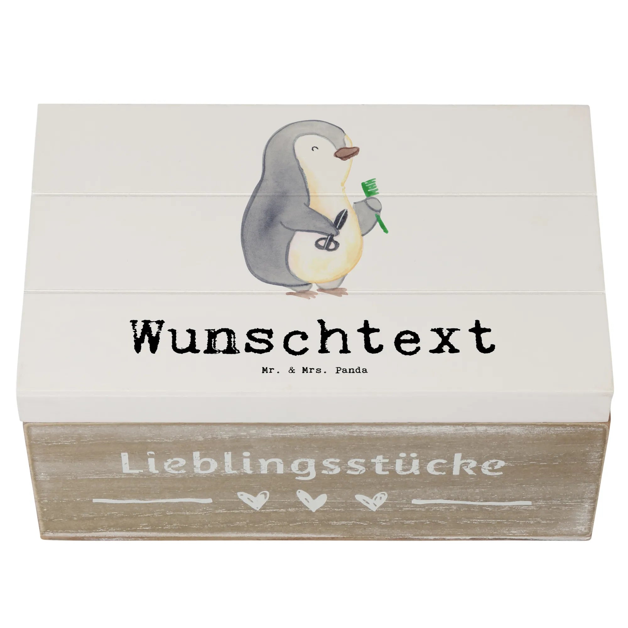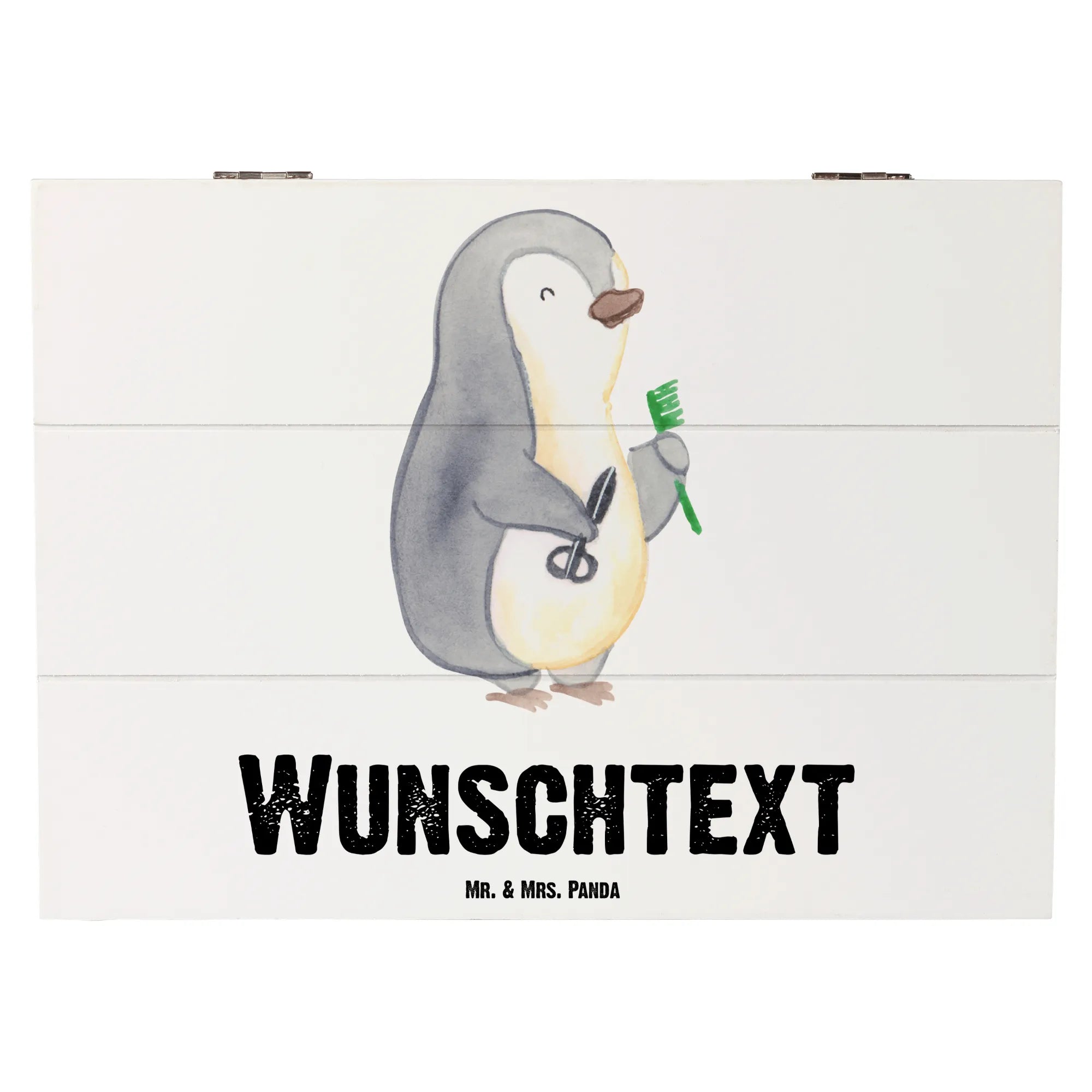 Die personalisierte Holzkiste "Hairstylist mit Herz" von Mr. & Mrs. Panda ist das perfekte Geschenk für Haarstylisten und alle Liebhaber des Friseurhandwerks. Mit einem niedlichen Motiv – einem fröhlichen Pinguin, der als Hairstylist mit einem Kamm in der Hand posiert – bringt diese Kiste eine liebevolle Note in jeden Friseursalon oder zu Hause.