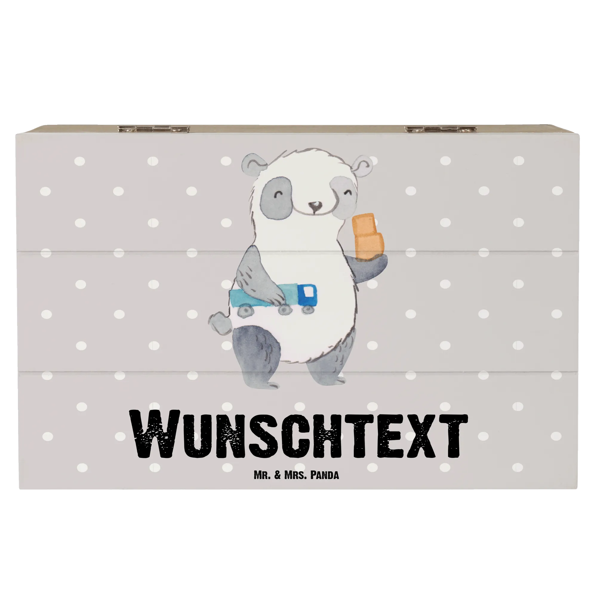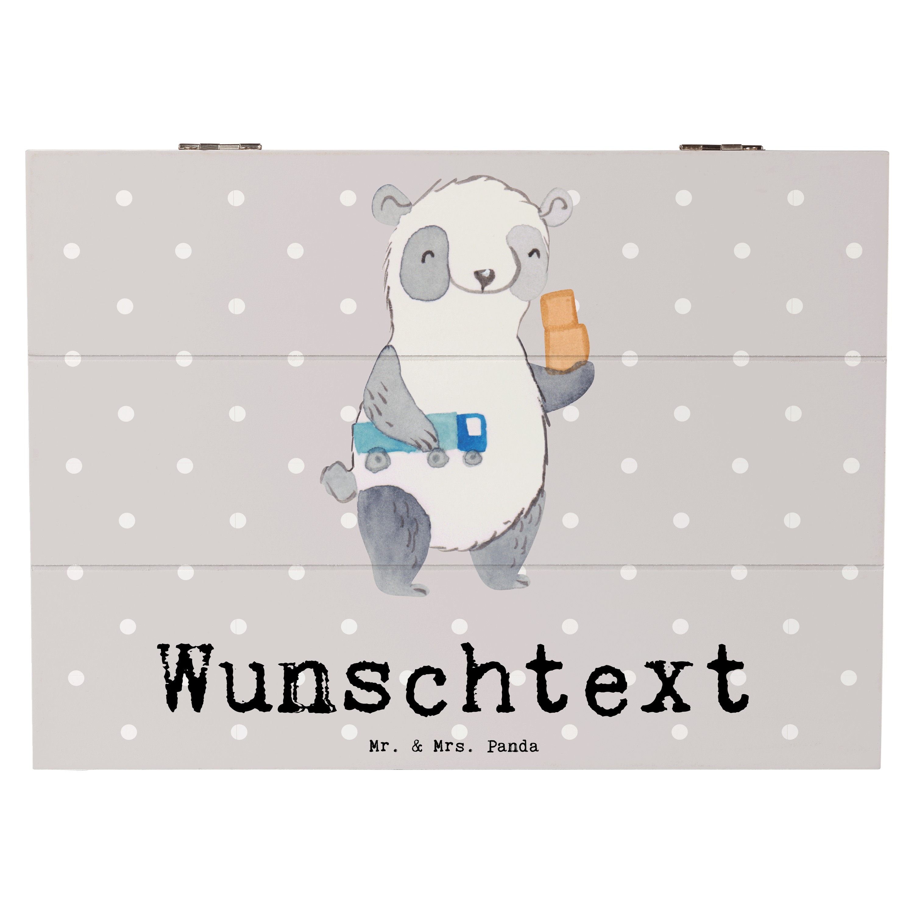 Das hübsche Motiv – ein süßer Panda mit einem Spielzeug-Lkw und Kartons – lädt dazu ein, die fantasievollen Geschichten der Umzüger und Möbelpacker zu erzählen. Durch die Möglichkeit, die Kiste mit einem individuellen Namen oder Text zu personalisieren, wird sie zu einem ganz besonderen Hingucker, der jedem Beschenkten zeigt, wie einzigartig er ist.