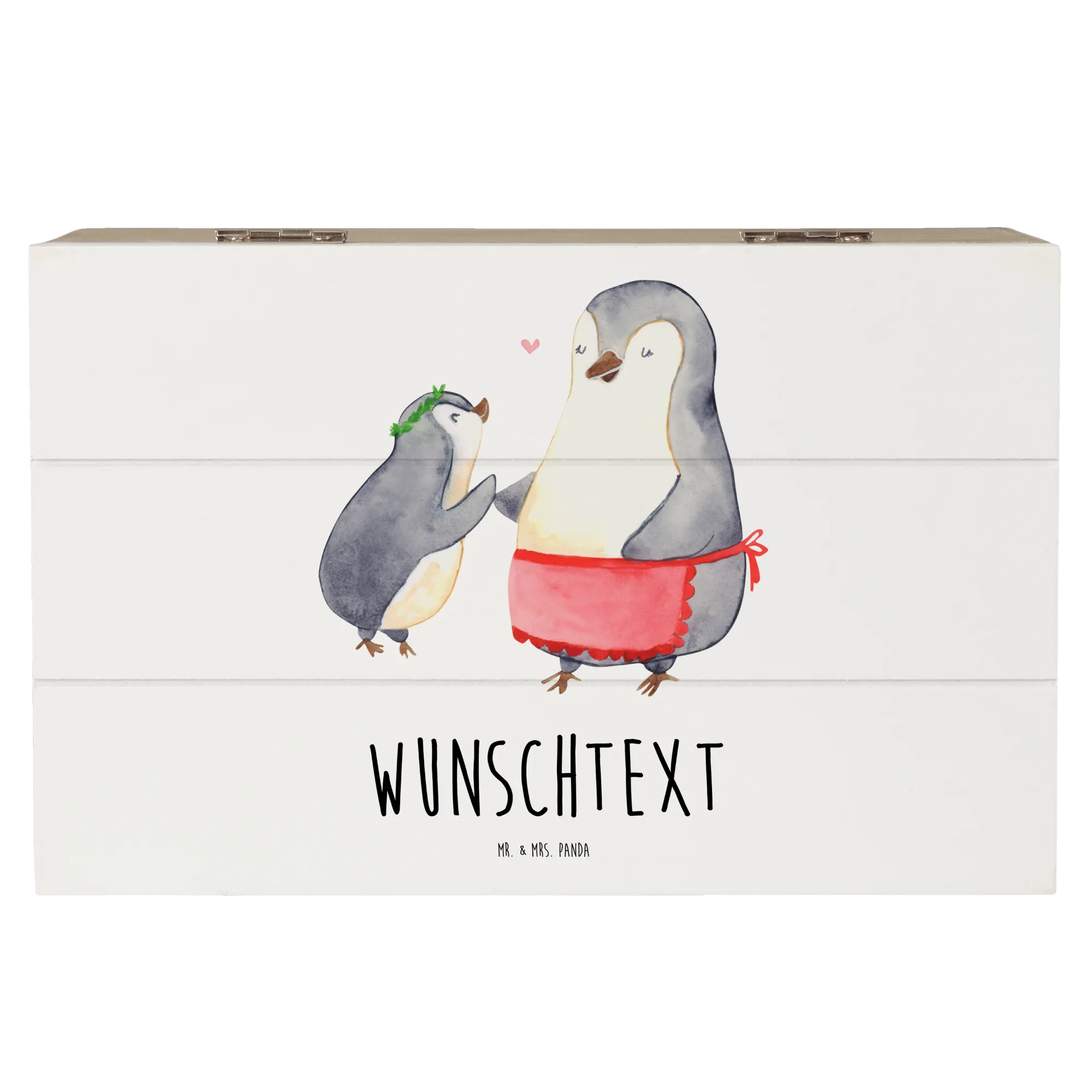 Ob zum Muttertag, Geburtstag oder einfach nur so – diese Kiste ist eine einzigartige Möglichkeit, deiner Mama zu zeigen, wie wichtig sie für dich ist. Mit einem ansprechenden Design, das einen Pinguin mit seiner kleinen Begleiterin zeigt, strahlt sie Wärme und Geborgenheit aus. Der größere Pinguin, der stolz eine rote Schürze trägt, repräsentiert die liebevolle Mutter, die immer für ihr Kind da ist. Das Herz zwischen den beiden symbolisiert die tiefe Beziehung, die sie verbindet.