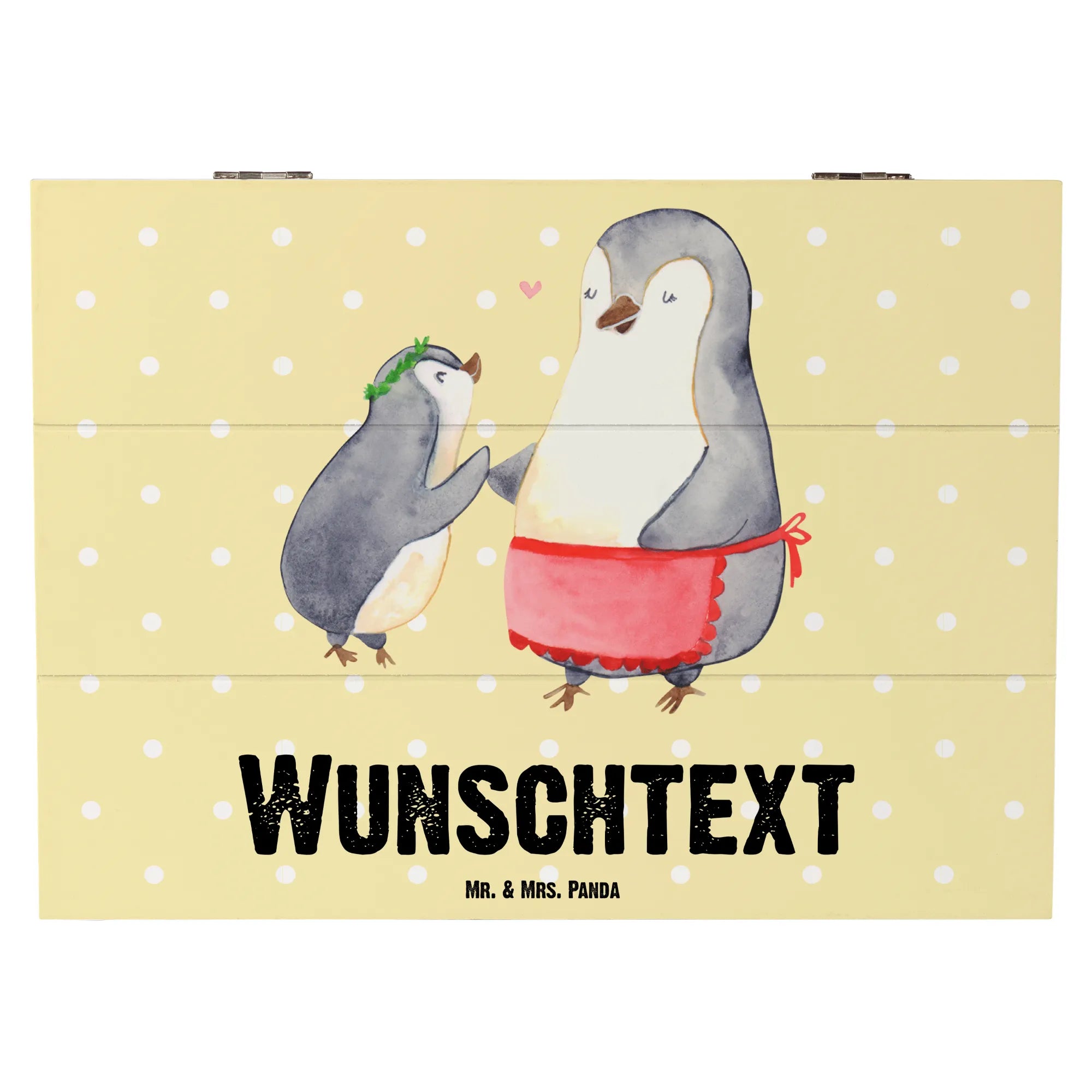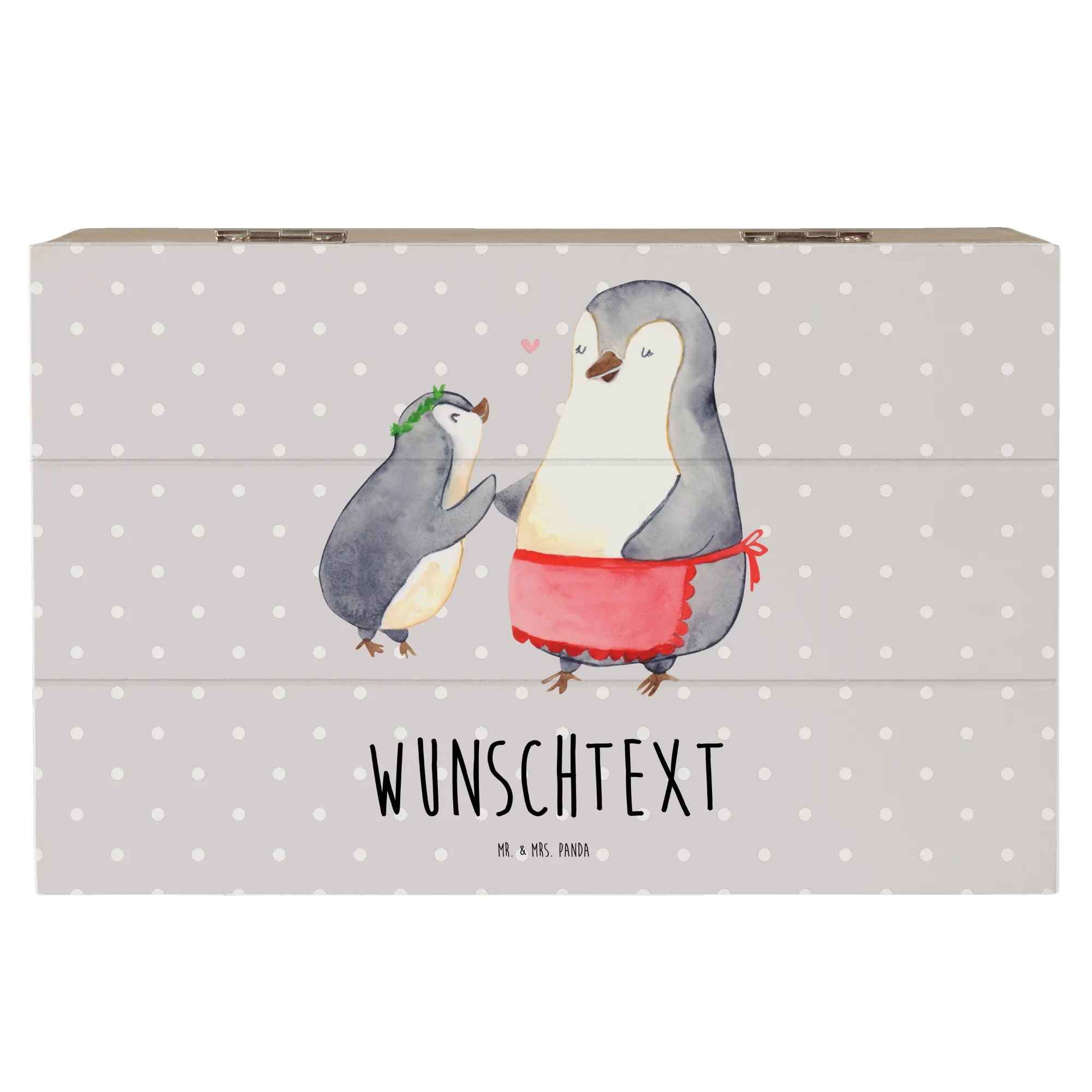 Die personalisierte Holzkiste Pinguin mit Kind von Mr. & Mrs. Panda ist das ideale Geschenk für alle, die ihrer Mutter, Mama, oder Mutti etwas ganz Besonderes schenken möchten. Ob zum Geburtstag, zum Muttertag oder einfach nur, um Danke zu sagen – diese wunderschöne Erinnerungsbox ist perfekt für jeden Anlass. Das zauberhafte Motiv zeigt zwei Pinguine in einer liebevollen Umarmung: die große Mama-Pinguin mit roter Schürze und das kleine Kind mit einem grünen Kranz. Zwischen ihnen schwebt ein kleines Herz, das die besondere Beziehung zwischen Mutter und Kind symbolisiert. Die Größe der Kiste (25 x 18 cm) bietet genug Platz, um wertvolle Erinnerungen, Fotos oder kleine Schätze aufzubewahren.