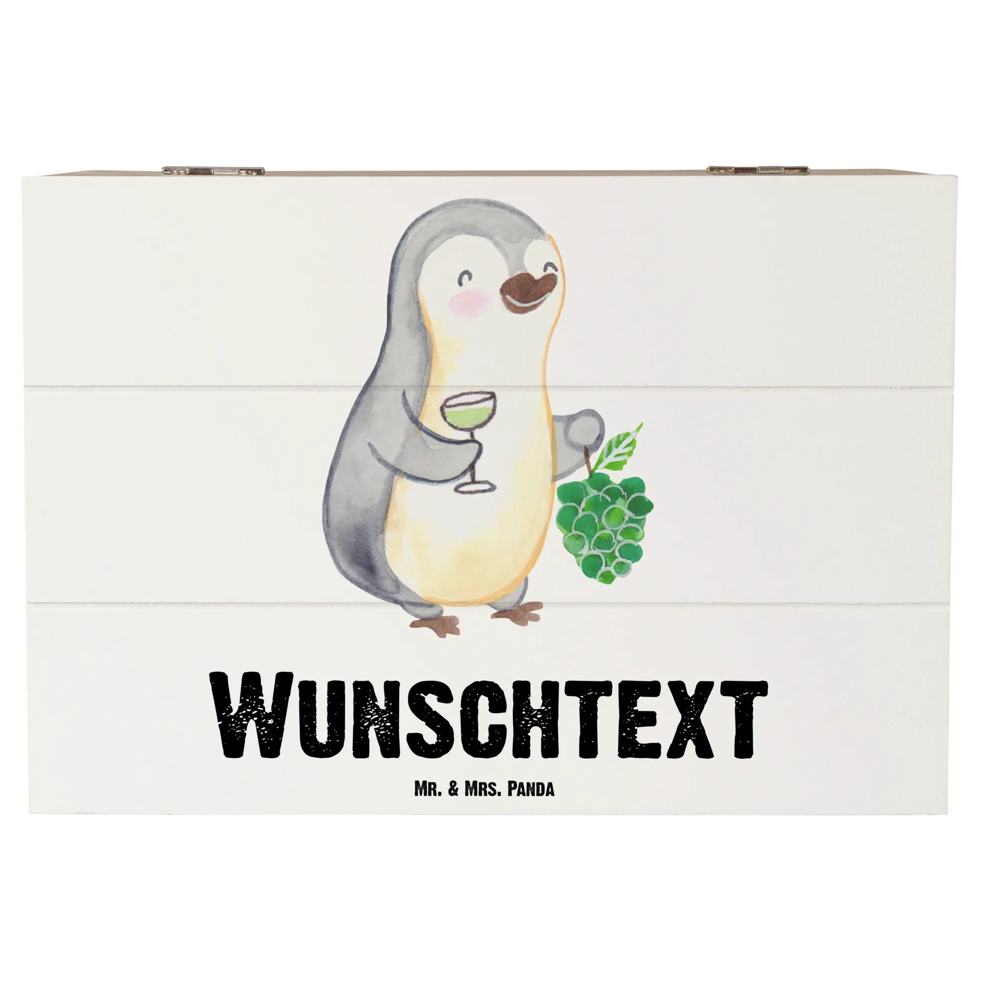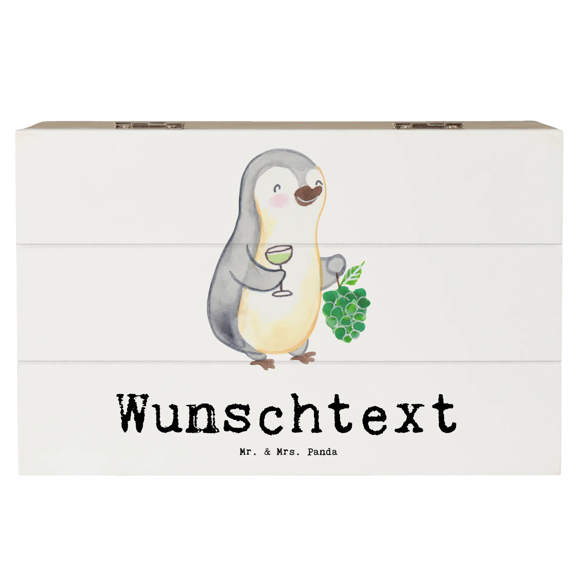 Die personalisierte Holzkiste "Sommelier mit Herz" von Mr. & Mrs. Panda ist das ideale Geschenk für Weinliebhaber, die sowohl stimmungsvolle Momente als auch den Genuss von feinen Weinen zelebrieren wollen. Durch das liebevoll gezeichnete Motiv eines süßen Pinguins mit Weintrauben und einem gefüllten Weinglas ist diese Kiste nicht nur schön, sondern auch besonders bedeutungsvoll. Perfekt geeignet für Kollegen, Freunde oder Familienmitglieder, die als Sommelier oder Weinliebhaber tätig sind.