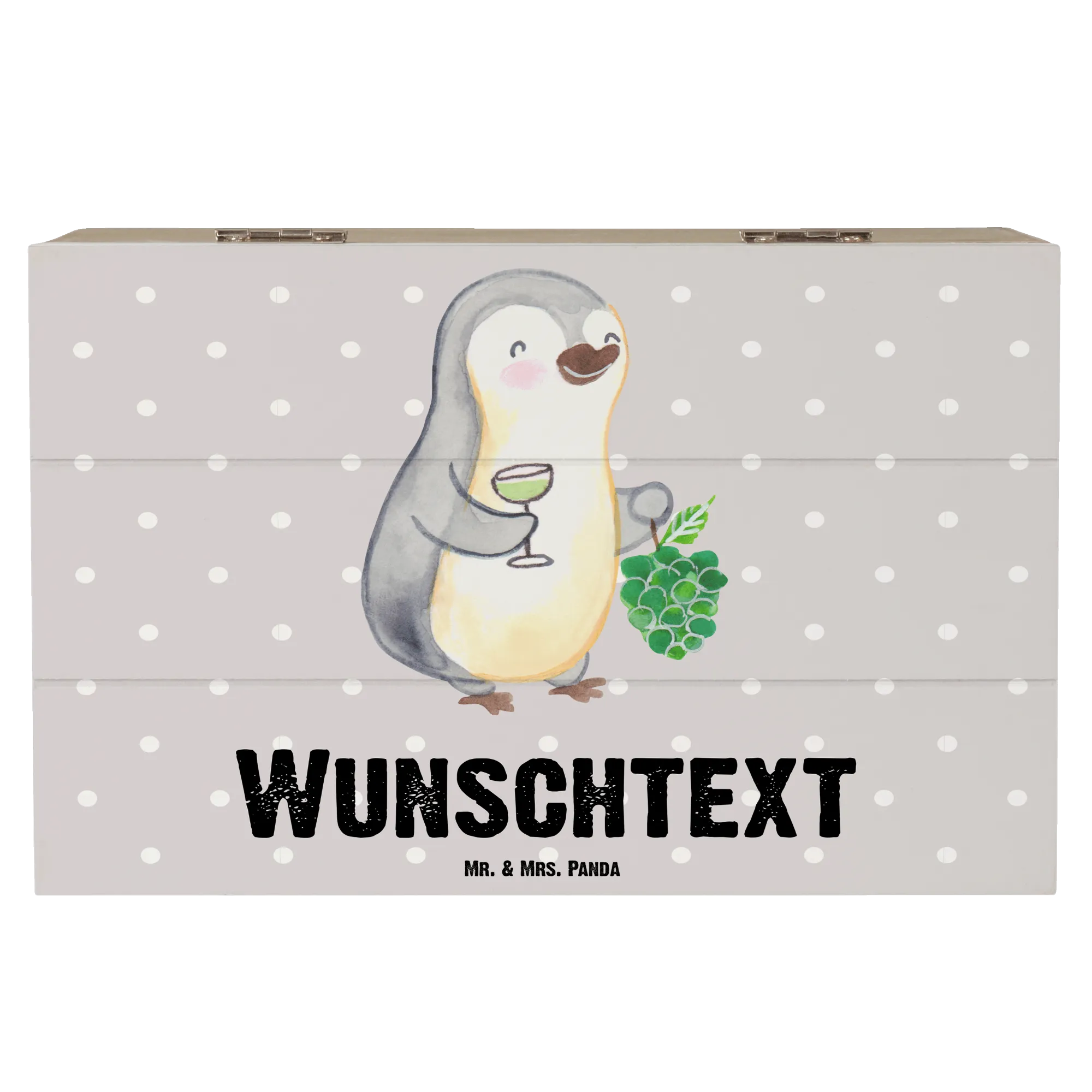 Das bezaubernde Motiv zeigt einen fröhlichen Pinguin mit Weintrauben und einem gefüllten Weinglas, ergänzt durch den witzigen Spruch "Du bist nur ein halber Mensch, wenn du kein Winzer bist." Diese Kiste ist ein herrliches Geschenk für Arbeitskollegen, Mitarbeiter oder Freunde, besonders wenn sie ihren Abschied, das Jubiläum oder einfach einen besonderen Moment feiern möchten.