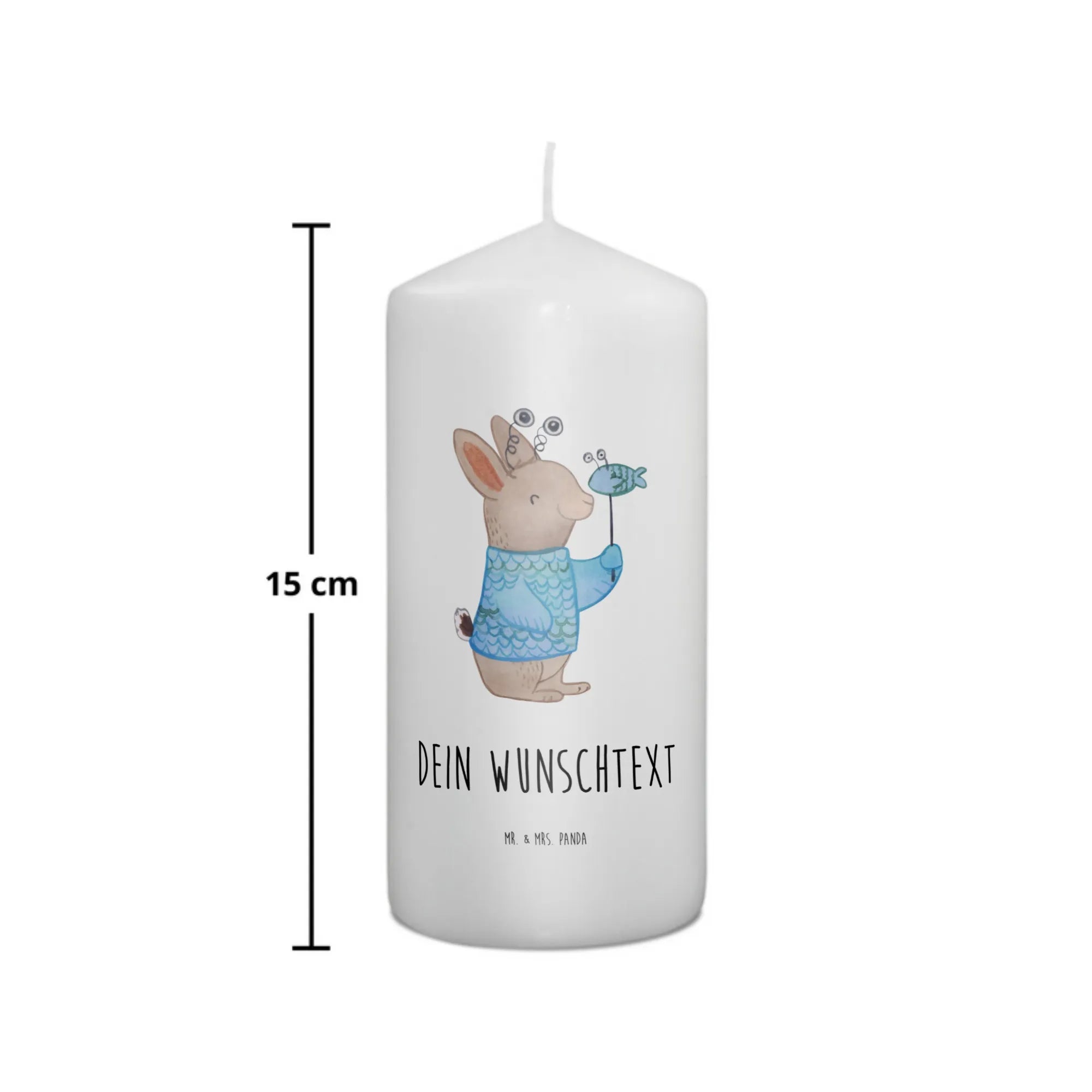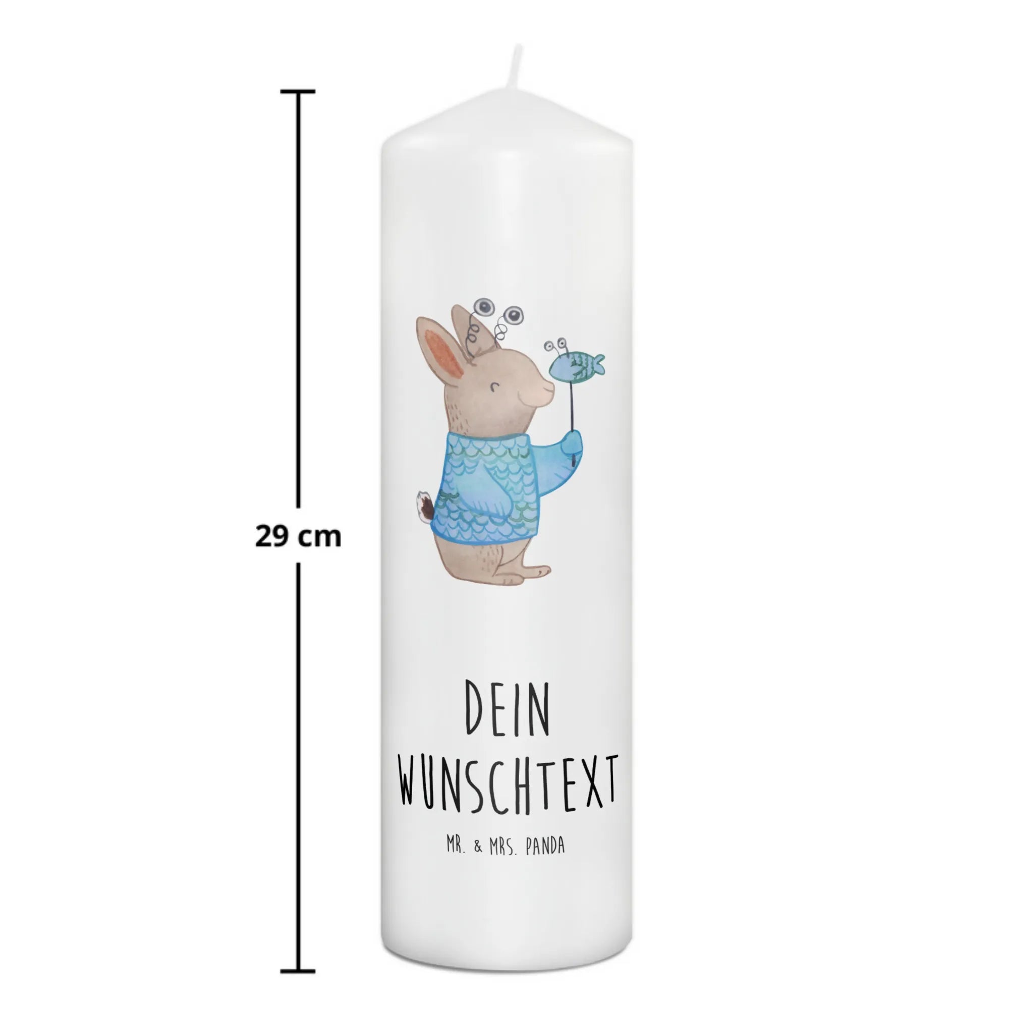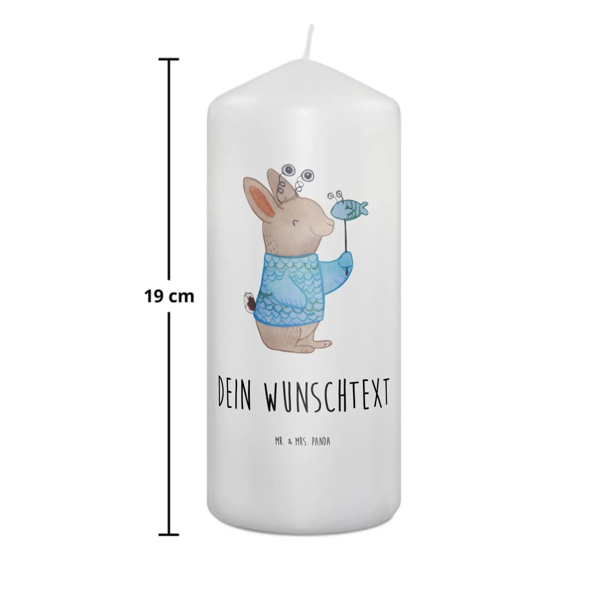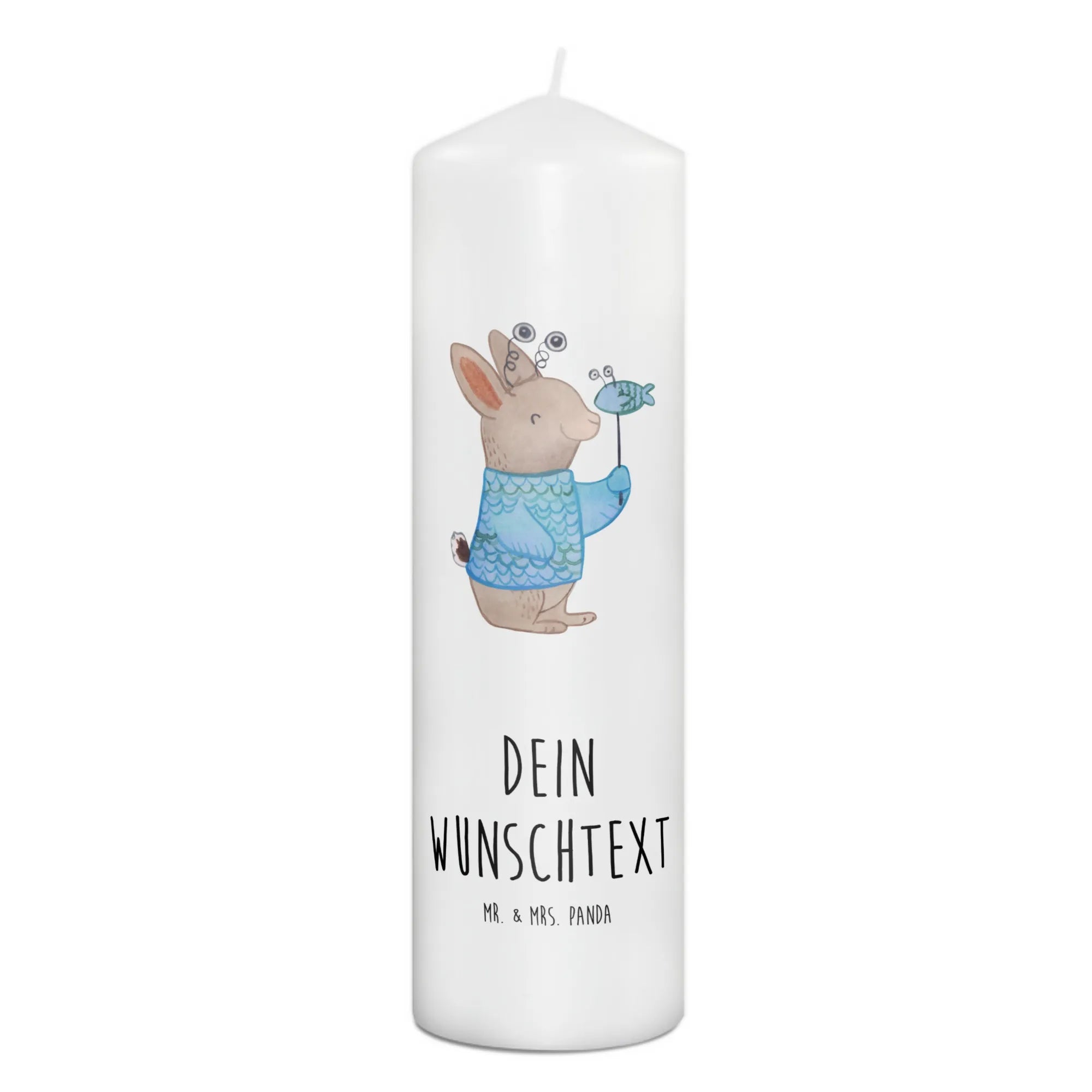 Die liebevoll handgezeichnete Illustration zeigt ein niedliches Kaninchen, das mit einem fröhlichen Lächeln seinen Fisch in den Händen hält. Das Design erlaubt es dir, diese Kerze mit deinem Wunschtext zu personalisieren. Die Maße von 190 mm x 80 mm und das hochwertige Paraffinwachs garantieren eine ultralange Brenndauer, sodass du lange Freude daran hast.