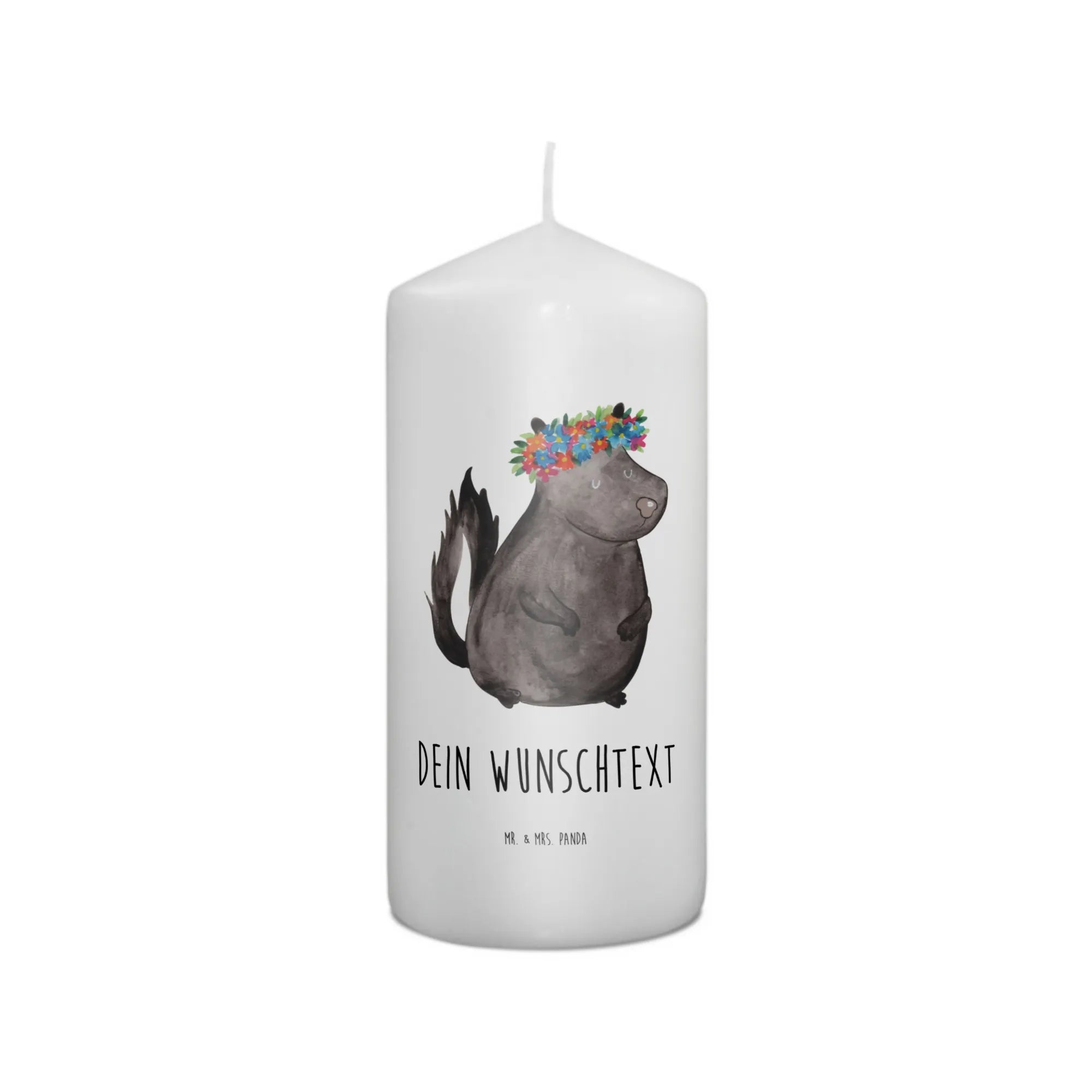 Mit ihrem fröhlichen Motiv eines süßen Stinktiers, das mit bunten Blumen geschmückt ist, kannst du deiner Kreativität freien Lauf lassen. Du kannst die Kerze mit einem Wunschnamen oder einem persönlichen Spruch gestalten und so ein ganz individuelles Geschenk kreieren.