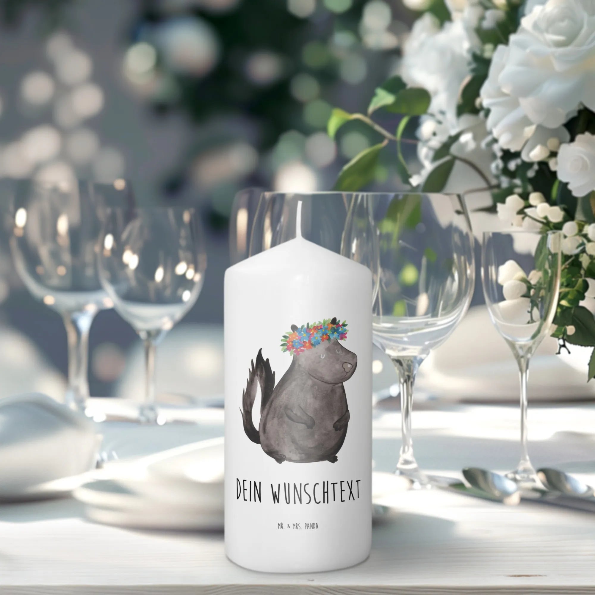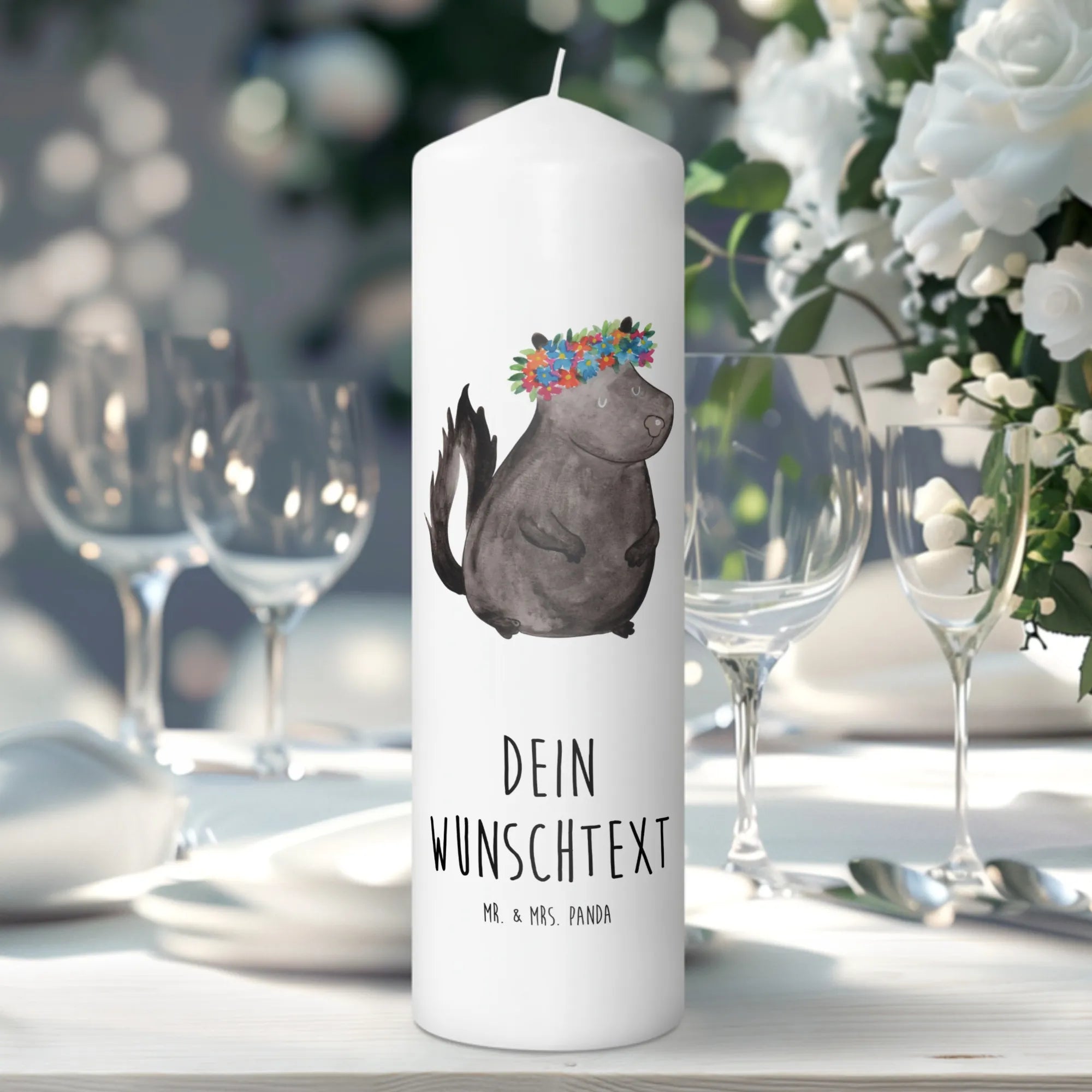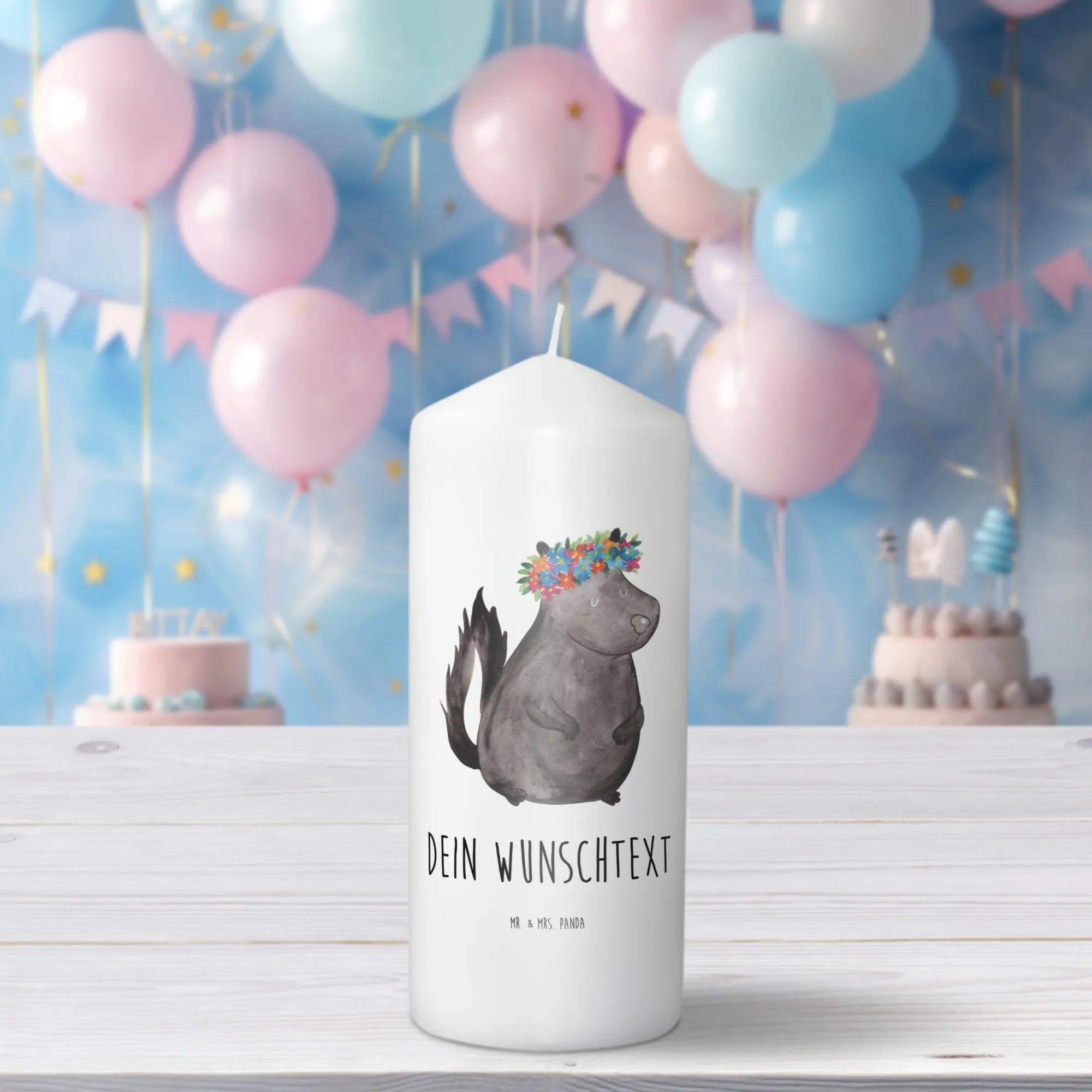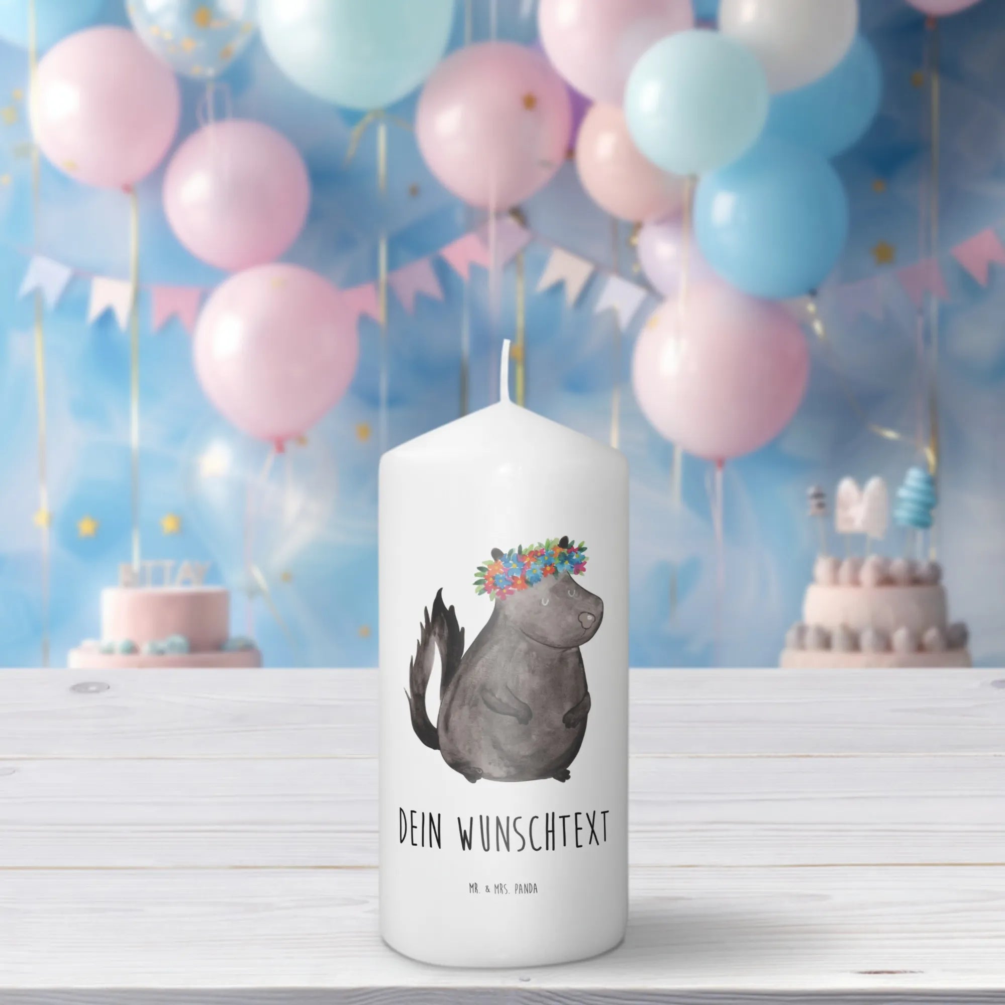 Die personalisierte Kerze "Stinktier Blumenmädchen" von Mr. & Mrs. Panda ist das perfekte Geschenk für viele besondere Anlässe. Mit dem niedlichen Aquarellmotiv eines Stinktiers, das einen bunten Blumenkranz trägt, zaubert diese Kerze jedem ein Lächeln ins Gesicht. Ob zur Taufe, Kommunion oder zum Geburtstag, diese Kerze verschönert jeden Moment und sorgt für eine besondere Stimmung.