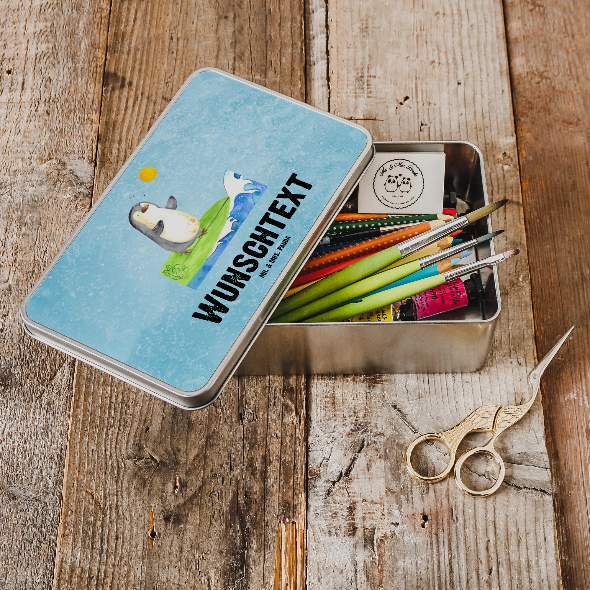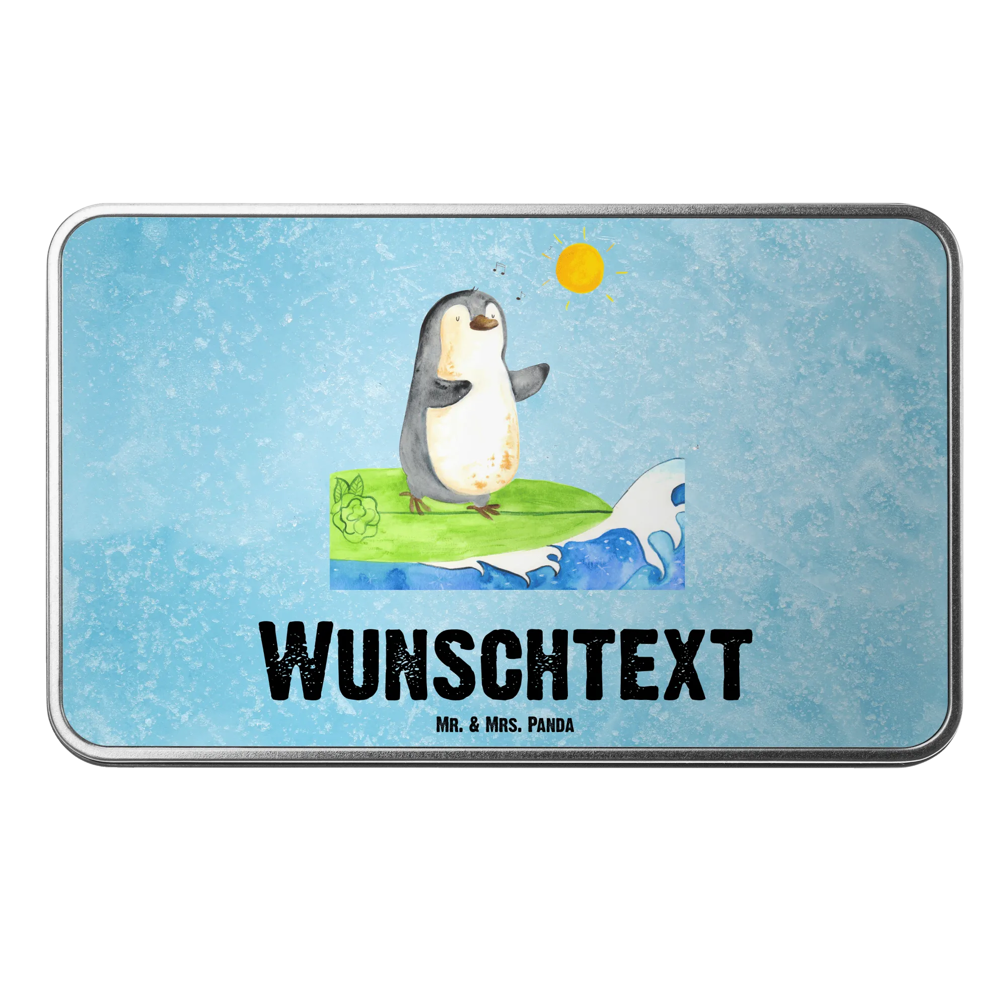 Du bist auf der Suche nach einem ganz besonderen Geschenk? Dann ist die personalisierte Metalldose mit dem Pinguin Surfer-Motiv von Mr. & Mrs. Panda genau das Richtige für dich!