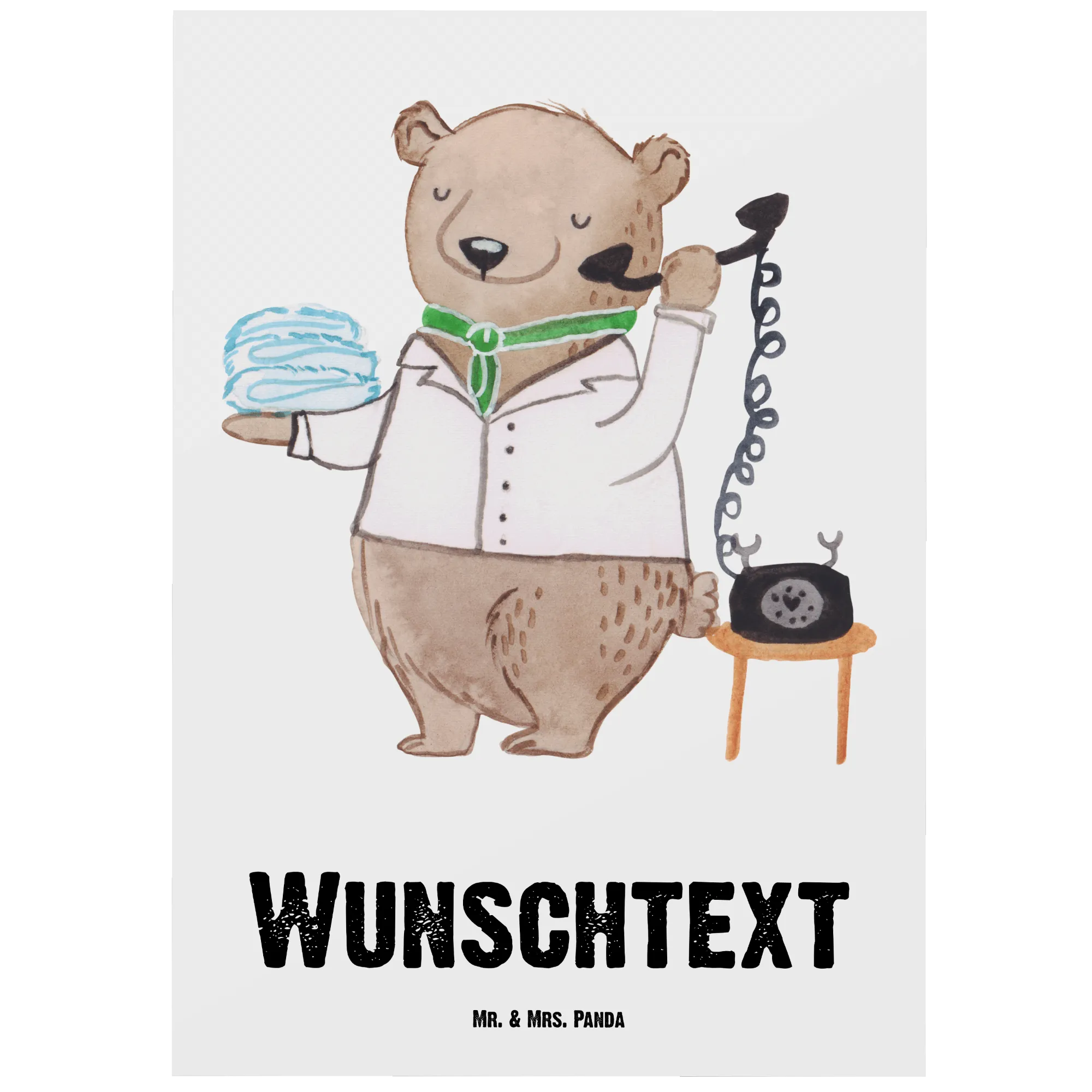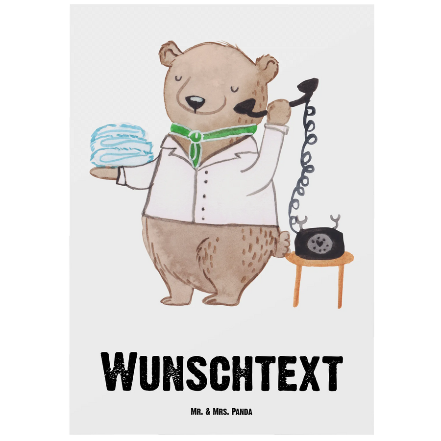 Entdecke die perfekte personalisierte Postkarte "Hotelkauffrau mit Herz" von Mr. & Mrs. Panda. Diese einzigartige Karte ist nicht nur ein toller Gruß, sondern auch ein liebevolles Geschenk für alle, die im Hotelgewerbe arbeiten. Mit einem charmanten, handgezeichneten Motiv eines weiblichen Bären, der ein Telefon in einer Hand und frische Handtücher in der anderen hält, bringt sie Freude und Wertschätzung für die harte Arbeit von Hotelfachangestellten.