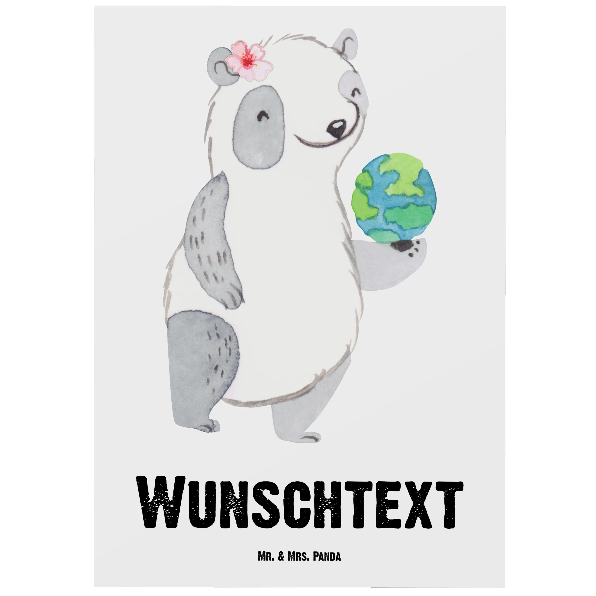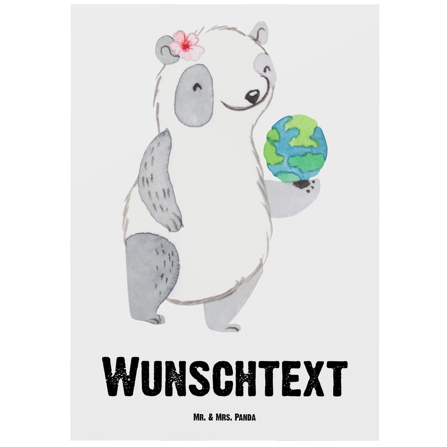Die Postkarte ist nicht nur personalisierbar mit deinem Wunschtext oder Namen, sondern auch mit einer blanko Rückseite für deine eigenen Worte versehen. Sie wurde aus hochwertigem Karton gefertigt und hat eine hochglänzende Vorderseite, die das niedliche Motiv des weiblichen Pandas mit der Weltkugel zum Strahlen bringt.
