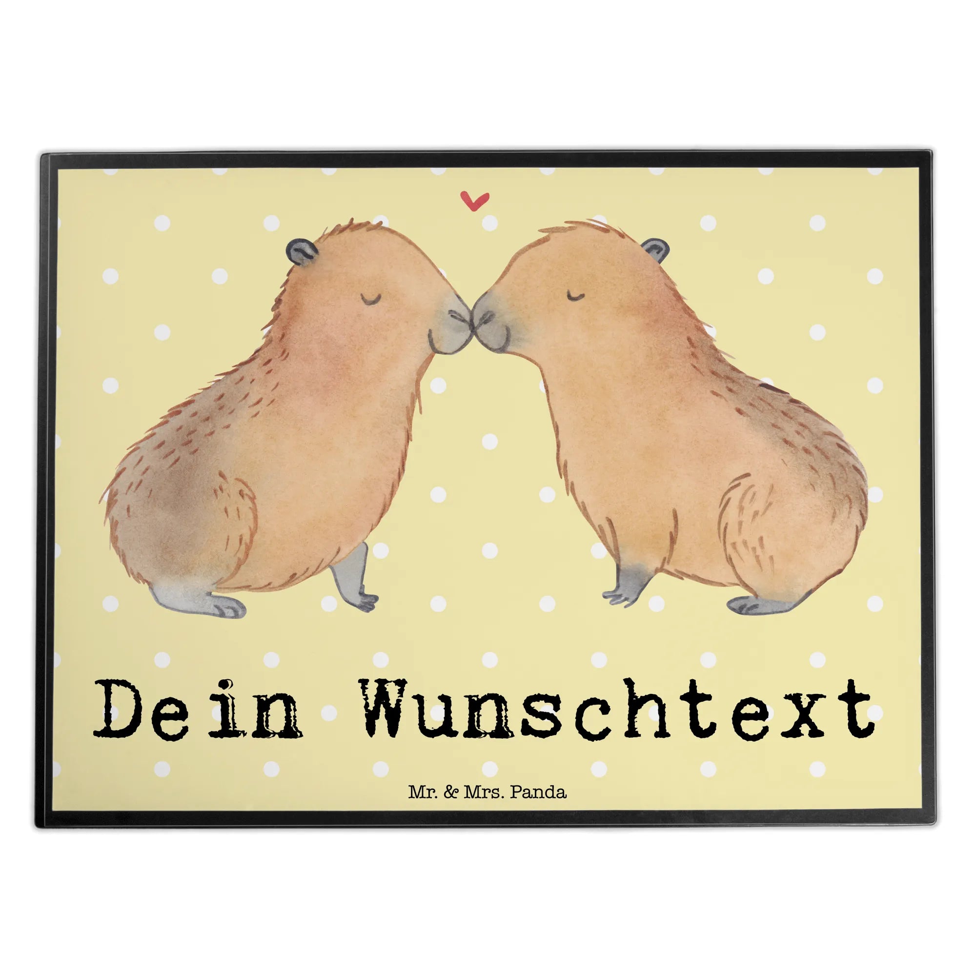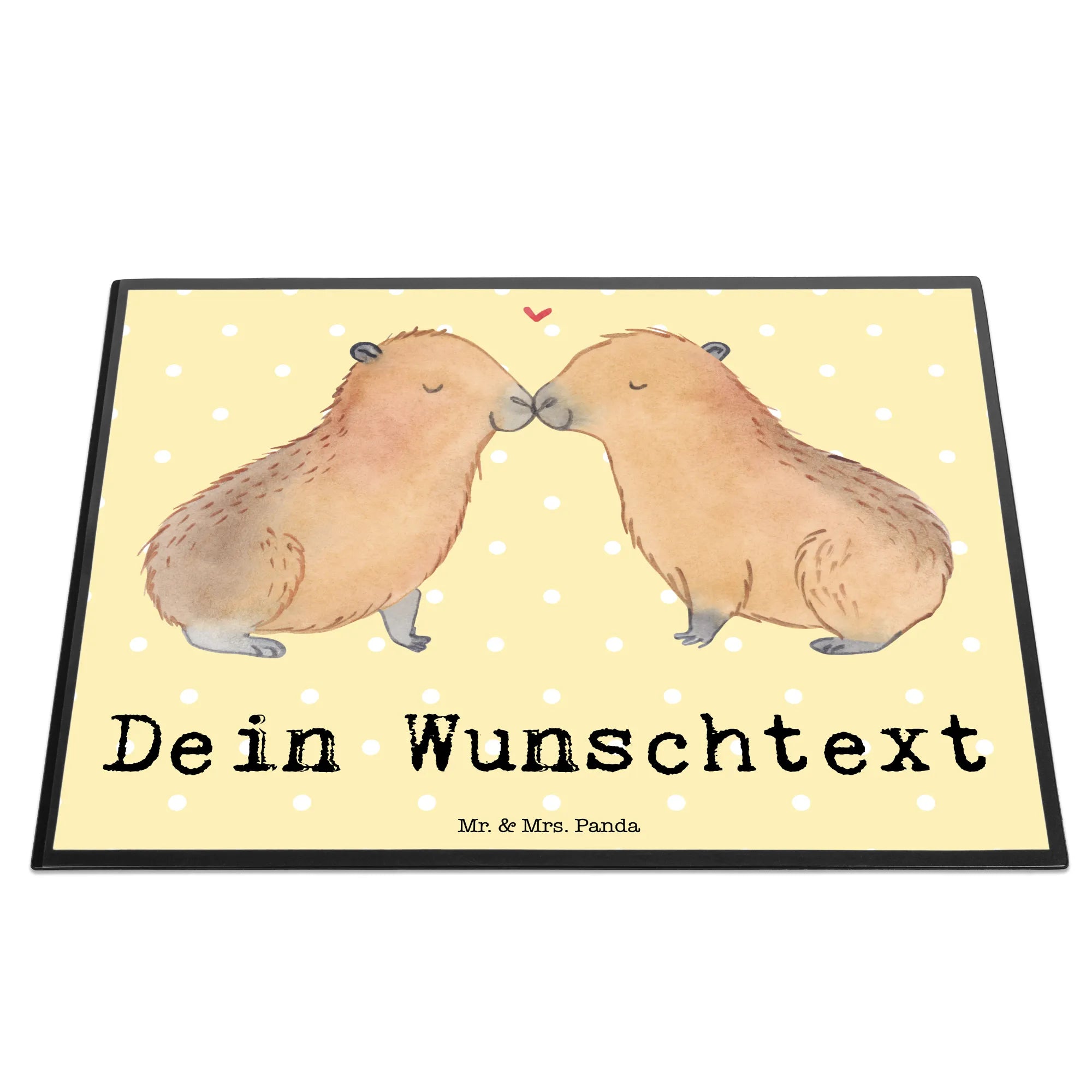 Die personalisierte Schreibtischunterlage mit dem süßen Capybara-Motiv von Mr. & Mrs. Panda ist das perfekte Geschenk für alle Verliebten! Diese liebevoll handgezeichnete Unterlage zeigt ein entzückendes Paar kuschelnder Capybaras, die sich zärtlich an der Nase berühren und ein Herzsymbol über ihnen schwebt.