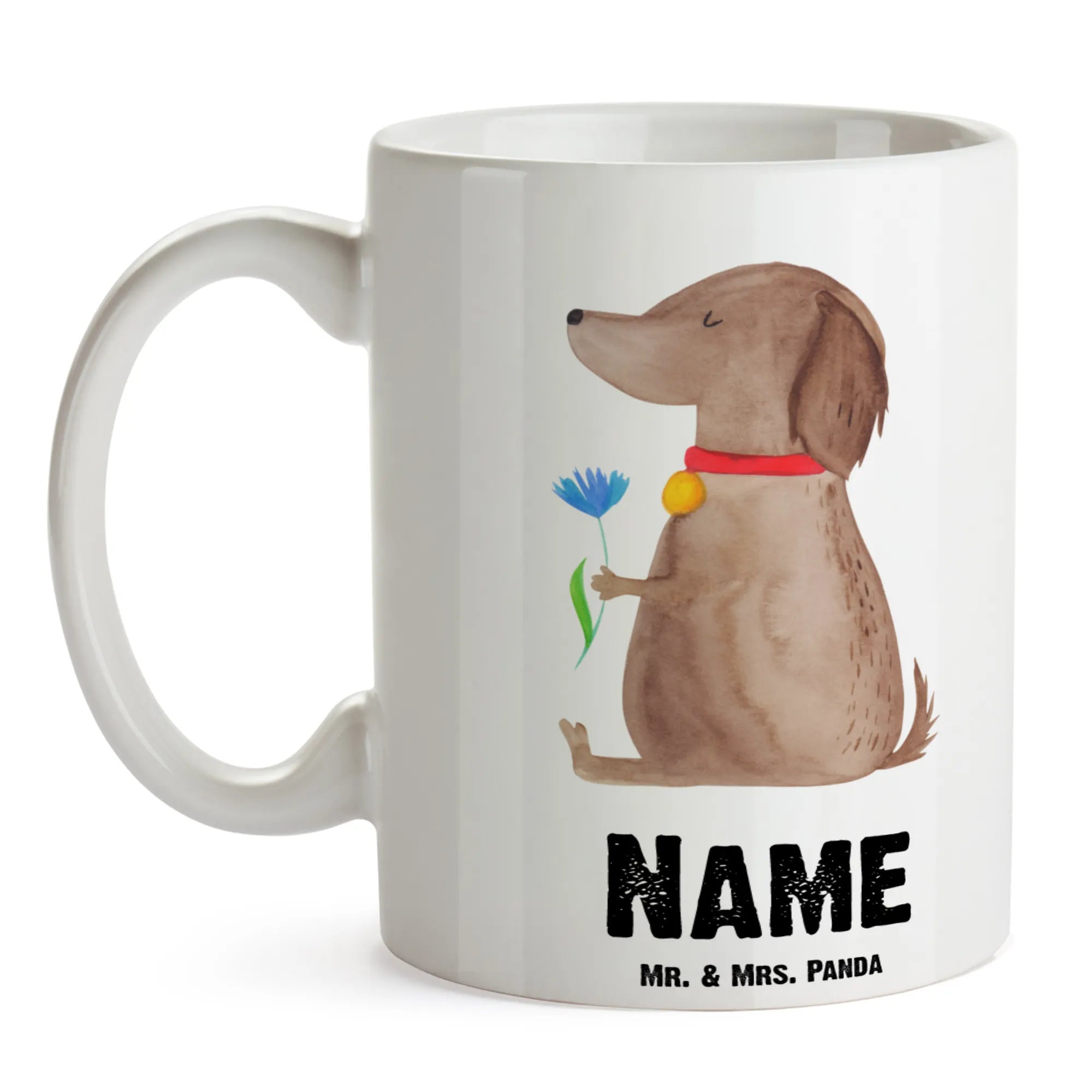 Du suchst nach dem perfekten Geschenk für den Hundeliebhaber in deinem Leben? Die personalisierte Tasse mit dem süßen Hund Blume Motiv aus unserer Hunde Kollektion von Mr. & Mrs. Panda ist genau das, was du brauchst! Diese wunderschöne Keramiktasse wird mit deinem Wunschnamen oder Wunschtext personalisiert und bringt ein Lächeln auf jedes Gesicht. Die Tasse hat ein charmantes Design: Eine süße Hündin mit einer Blume im Fell, das sofort gute Laune verbreitet. Egal, ob für Hundehalter, Frauchen oder einfach für einen Tierliebhaber, diese Tasse wird zur liebsten frühmorgendlichen Begleiterin beim Kaffee oder Tee.