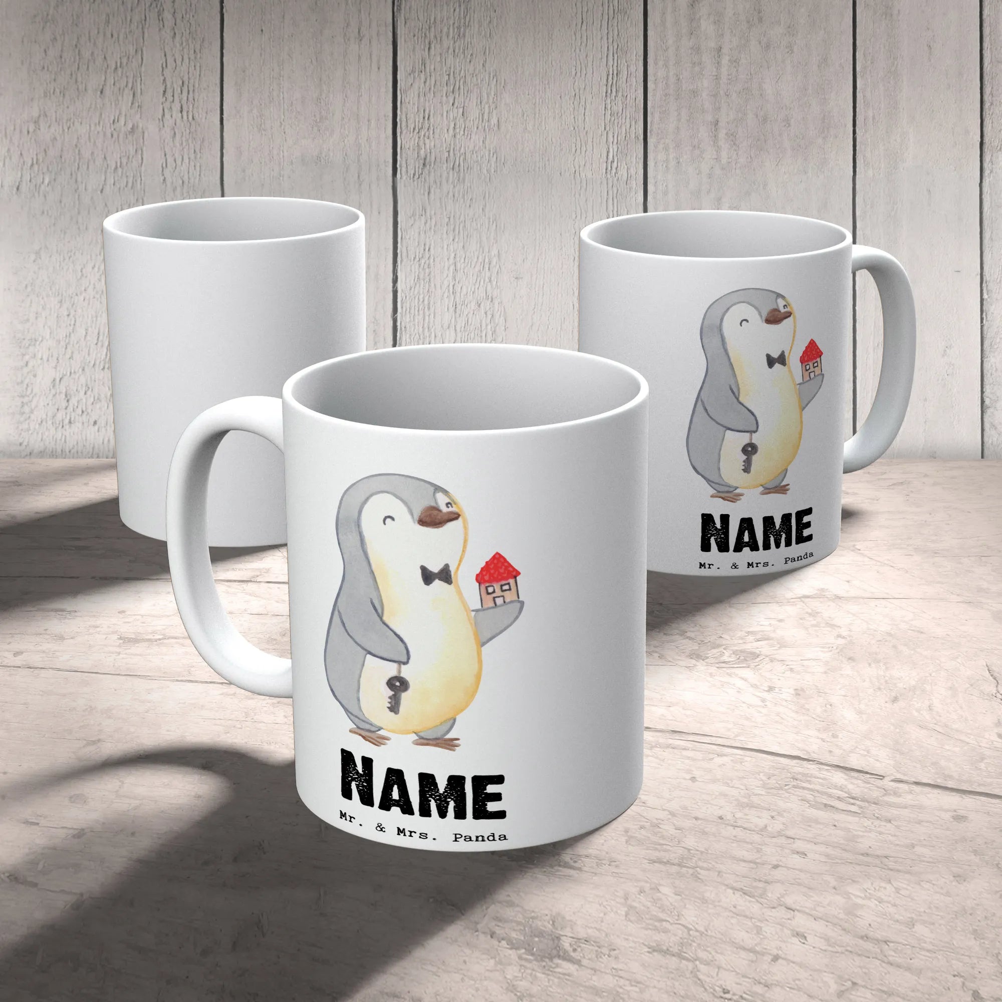 Die personalisierte Tasse "Immobilienkaufmann mit Herz" von Mr. & Mrs. Panda ist das perfekte Geschenk für alle, die mit Leidenschaft im Immobiliengeschäft tätig sind. Mit einem liebevoll gestalteten Motiv, das einen niedlichen Pinguin zeigt, der einen Schlüssel in der einen Hand und ein Haus in der anderen hält, wird diese Tasse zum Hingucker in jedem Büro.