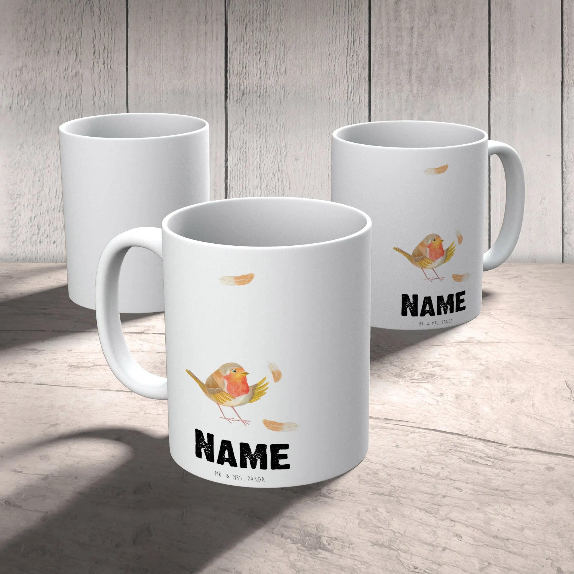 Die personalisierte Tasse "Rotkehlchen mit Federn" aus der bezaubernden Small World Kollektion von Mr. & Mrs. Panda ist das perfekte Geschenk für große und kleine Tierliebhaber. Du kannst sie ganz individuell mit deinem Wunschnamen gestalten und somit ein ganz persönliches Geschenk kreieren. Die Tasse hat eine Füllmenge von 300 ml und ist aus hochwertiger Keramik, die nicht nur langlebig ist, sondern auch spülmaschinen- und mikrowellenfest.