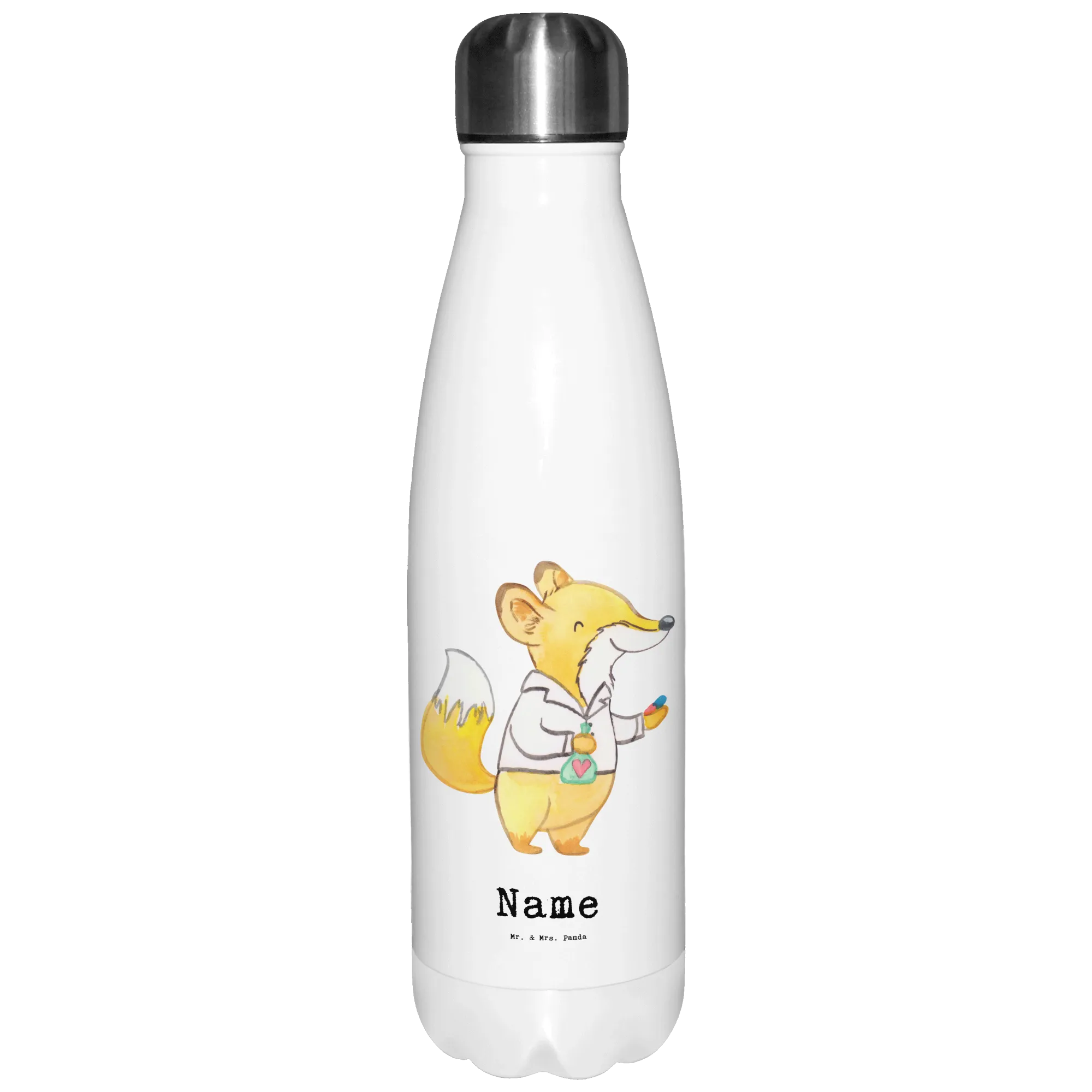 Die personalisierte Thermosflasche "Apotheker mit Herz" von Mr. & Mrs. Panda ist das perfekte Geschenk für Apotheker und Pharmazie-Professionals. Diese einzigartige Flasche kombiniert Funktionalität mit einem liebevollen Design, das direkt aus der kreativen Feder von Mrs. Panda stammt. Mit süßen Aquarellmotiven zeigt die Flasche einen charmanten Fuchs im weißen Kittel, der bereit ist, Dank zu sagen. Egal, ob zum Berufsabschied, zur Eröffnung einer neuen Apotheke oder einfach als kleine Aufmerksamkeit zwischendurch, diese Thermosflasche bringt Freude und Wertschätzung.