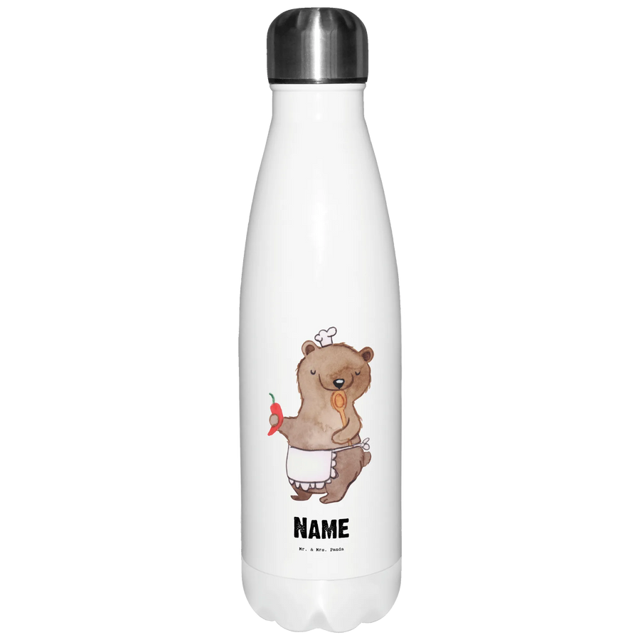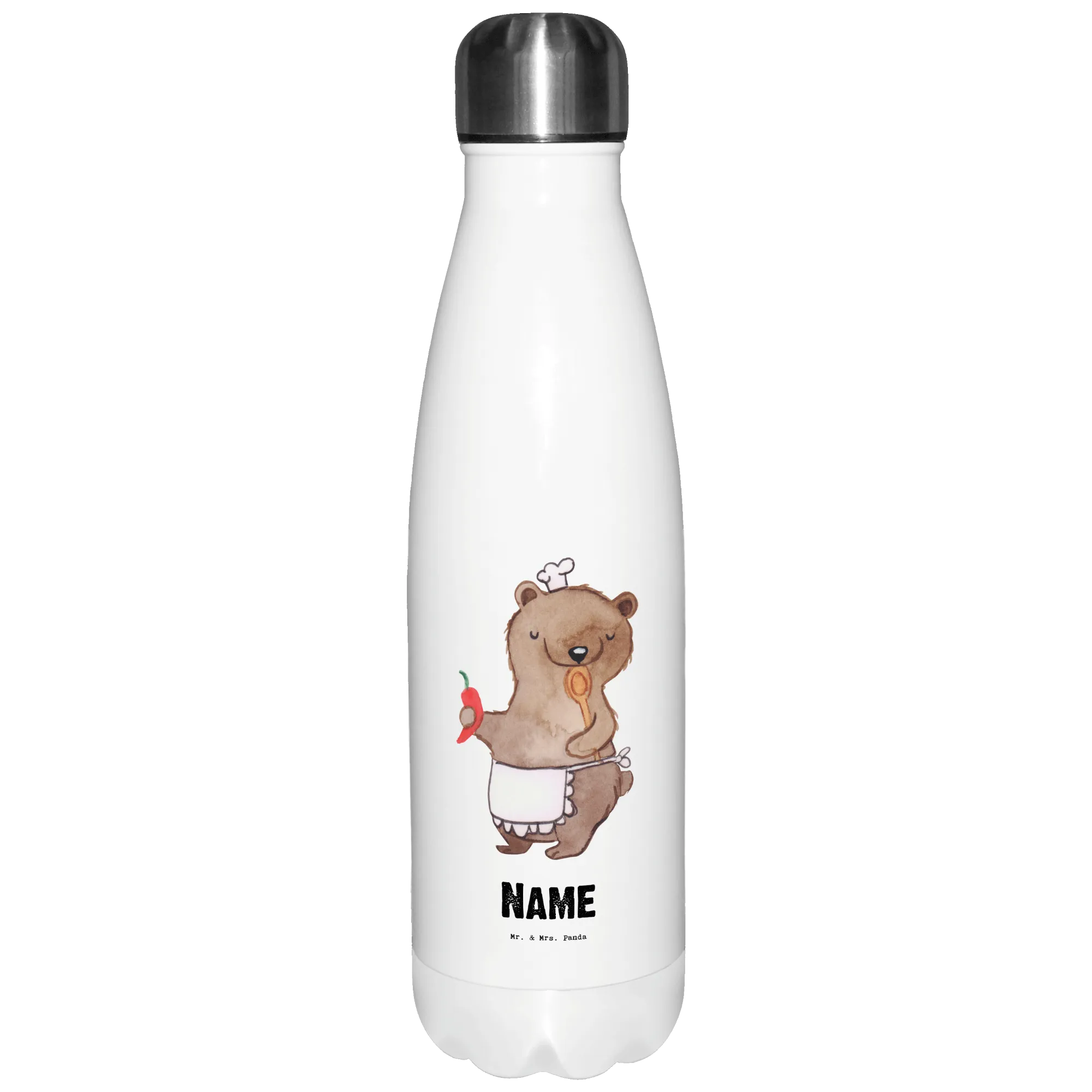 Die personalisierte Thermosflasche "Pizzabäcker mit Herz" aus der einzigartigen Berufe-Kollektion von Mr. & Mrs. Panda ist das perfekte Geschenk für alle, die in der Gastronomie arbeiten oder einfach Pizza lieben. Mit ihrem süßen Design eines kleinen Bären, der eine Kochschürze trägt und in der einen Hand einen Kochlöffel und in der anderen eine Chili hält, bringt sie Humor und Freude in den Alltag.