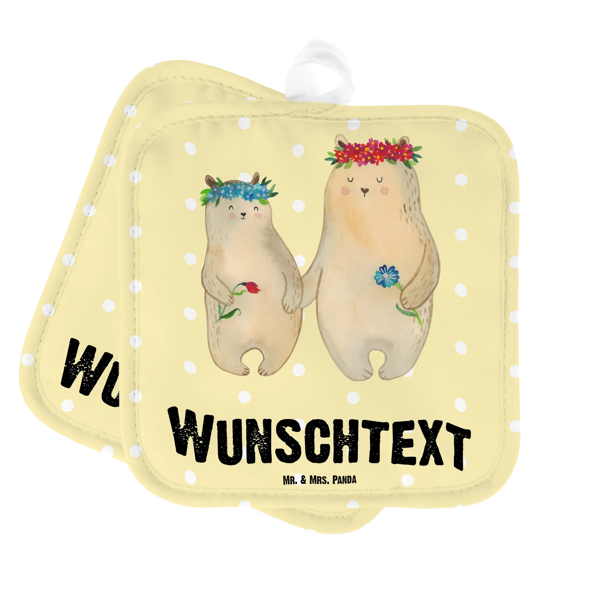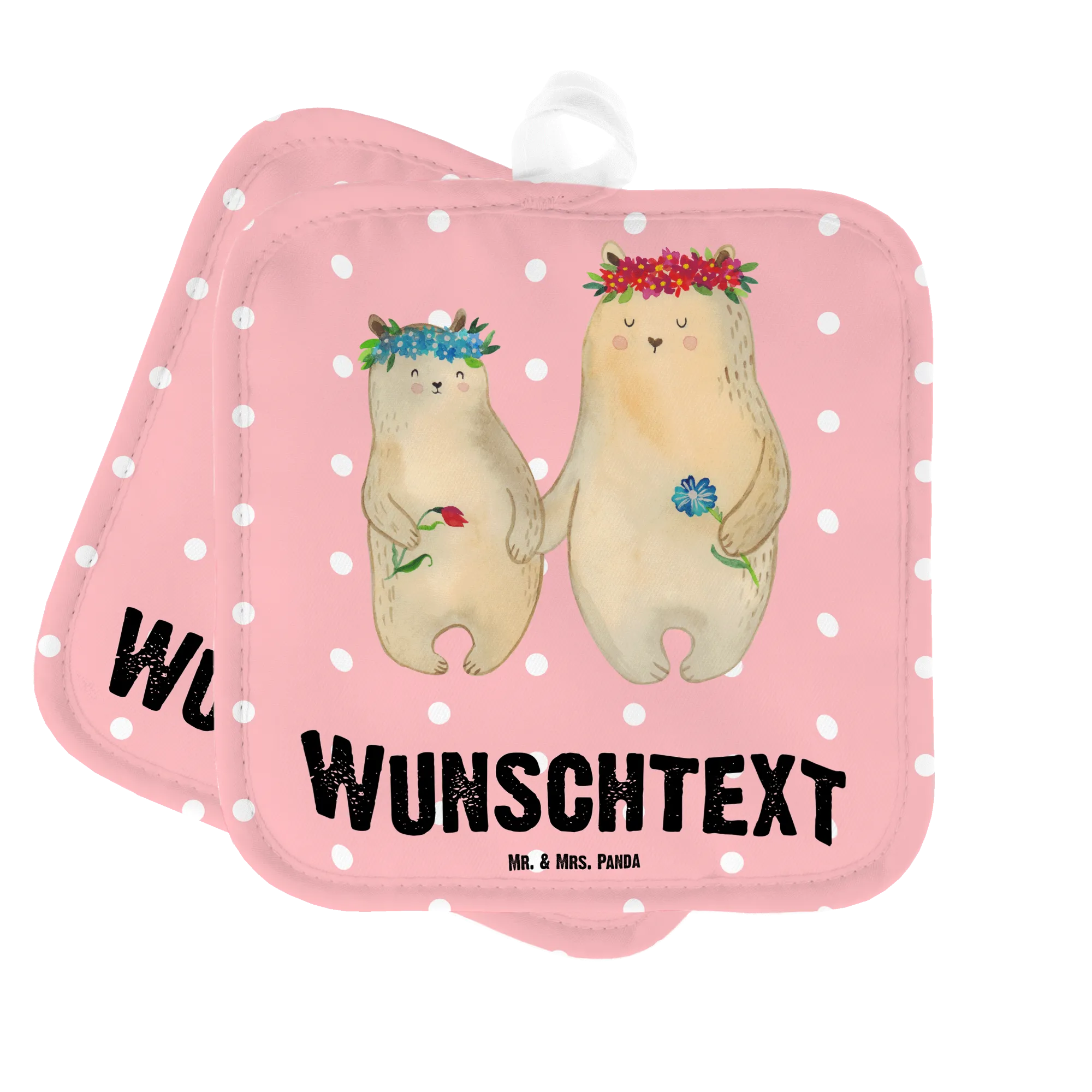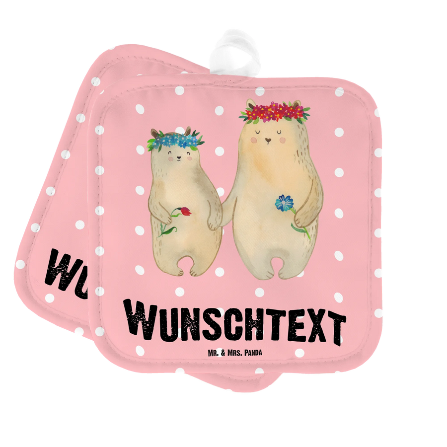Zwei personalisierte Topflappen „Bären mit Blumenkranz“ von Mr. & Mrs. Panda – liebevoll illustriert aus unserer Familien-Kollektion. Die beiden lächelnden Bären mit ihren bunten Blumenkränzen vermitteln Wärme, Zuneigung und pure Herzlichkeit. ❤️🐻🌸