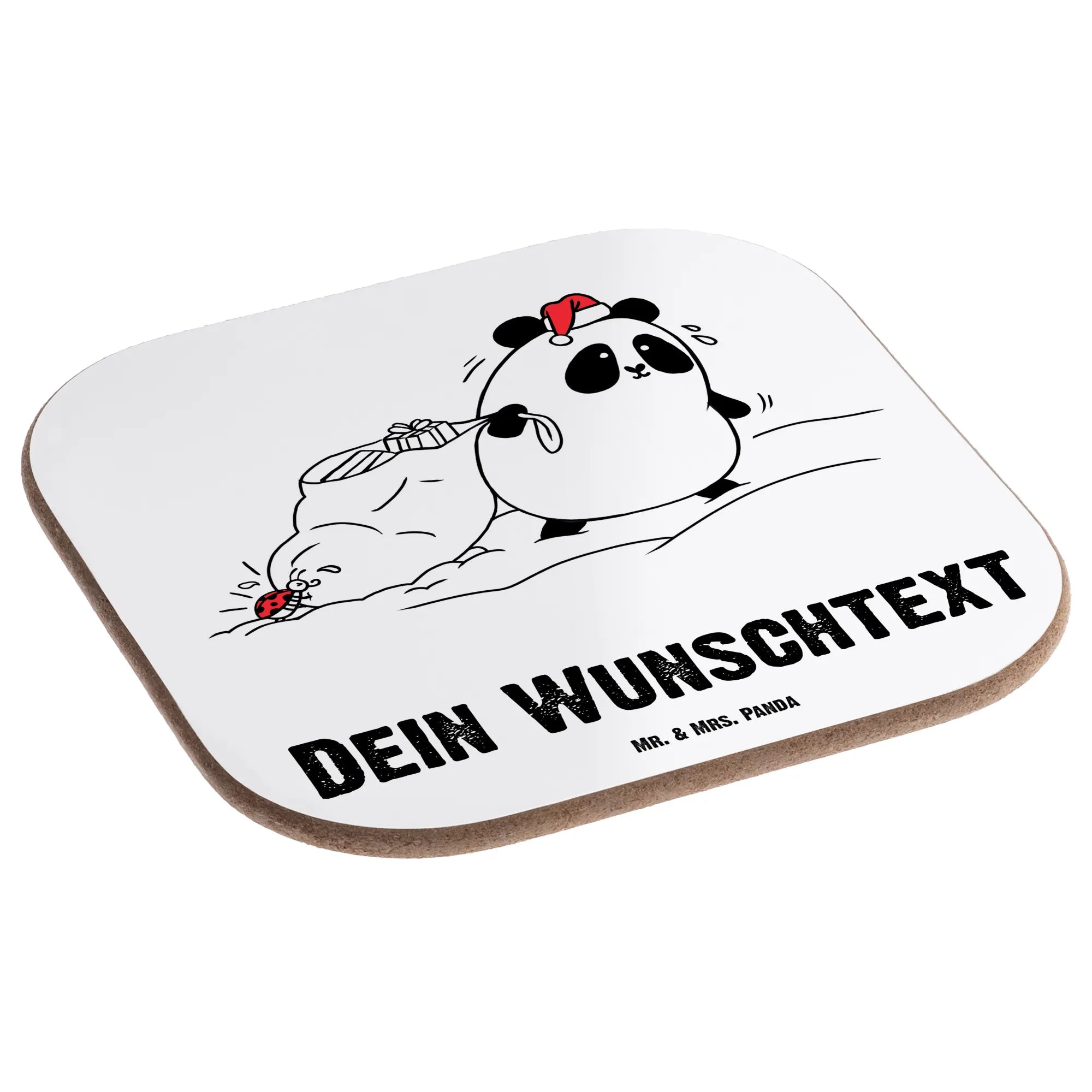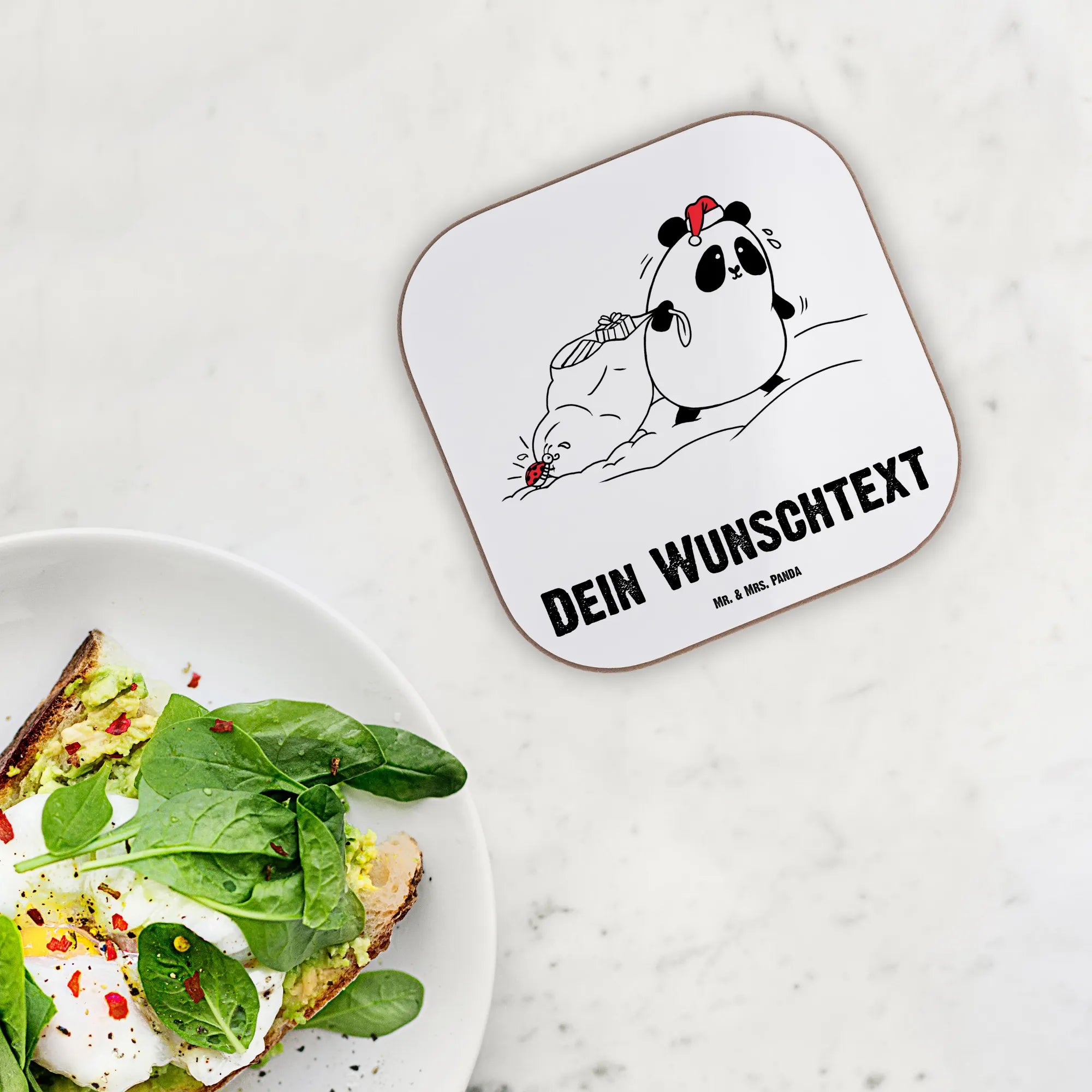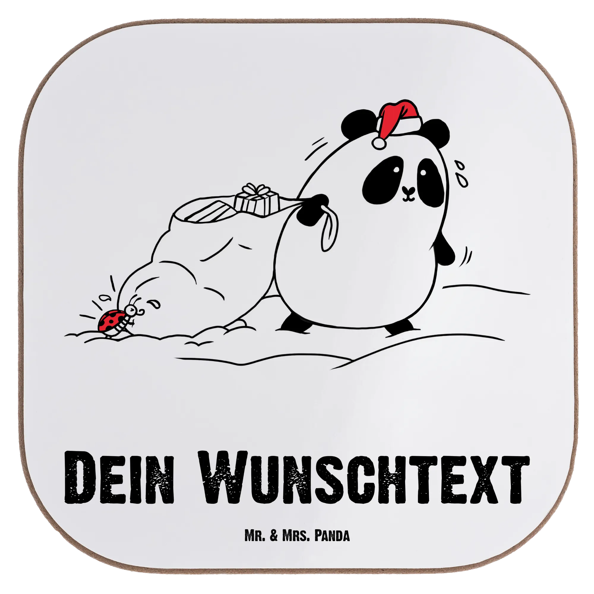 Der personalisierte Untersetzer "Easy & Peasy Frohe Weihnachten" von Mr. & Mrs. Panda ist ein absoluter Hingucker und die perfekte Geschenkidee für die festliche Saison! Mit einem liebevollen Motiv, das einen süßen Panda zeigt, der sich als Nikolaus verkleidet hat und einen Sack voller Geschenke hinterherzieht, verleiht dieser Untersetzer jedem Weihnachtstisch einen besonderen Charme. Zusätzlich wird er mit dem Spruch "Frohe Weihnachten und viel Glück!" personalisiert, was ihn zu einem einzigartigen und persönlichen Geschenk macht.