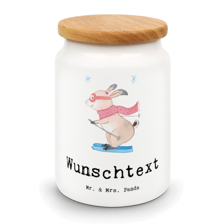 Bist du auf der Suche nach dem perfekten Geschenk für einen Ski-Liebhaber? Dann ist unsere personalisierte Vorratsdose "Bär Skifahren Tage" aus der liebevollen Kollektion Hobby & Sport von Mr. & Mrs. Panda genau das Richtige für dich! Mit ihrem süßen Motiv eines Bären, der fröhlich auf Skiern den Hang hinunterfährt, zaubert sie jedem ein Lächeln ins Gesicht. Egal, ob als Dankeschön für einen begeisterten Sportler, als besonderes Geschenk für einen Freund oder als Belohnung für einen Skisportler nach einem Wettkampf – diese individuelle Keramikdose wird mit deinem persönlichen Wunschtext zu einem ganz besonderen Highlight.