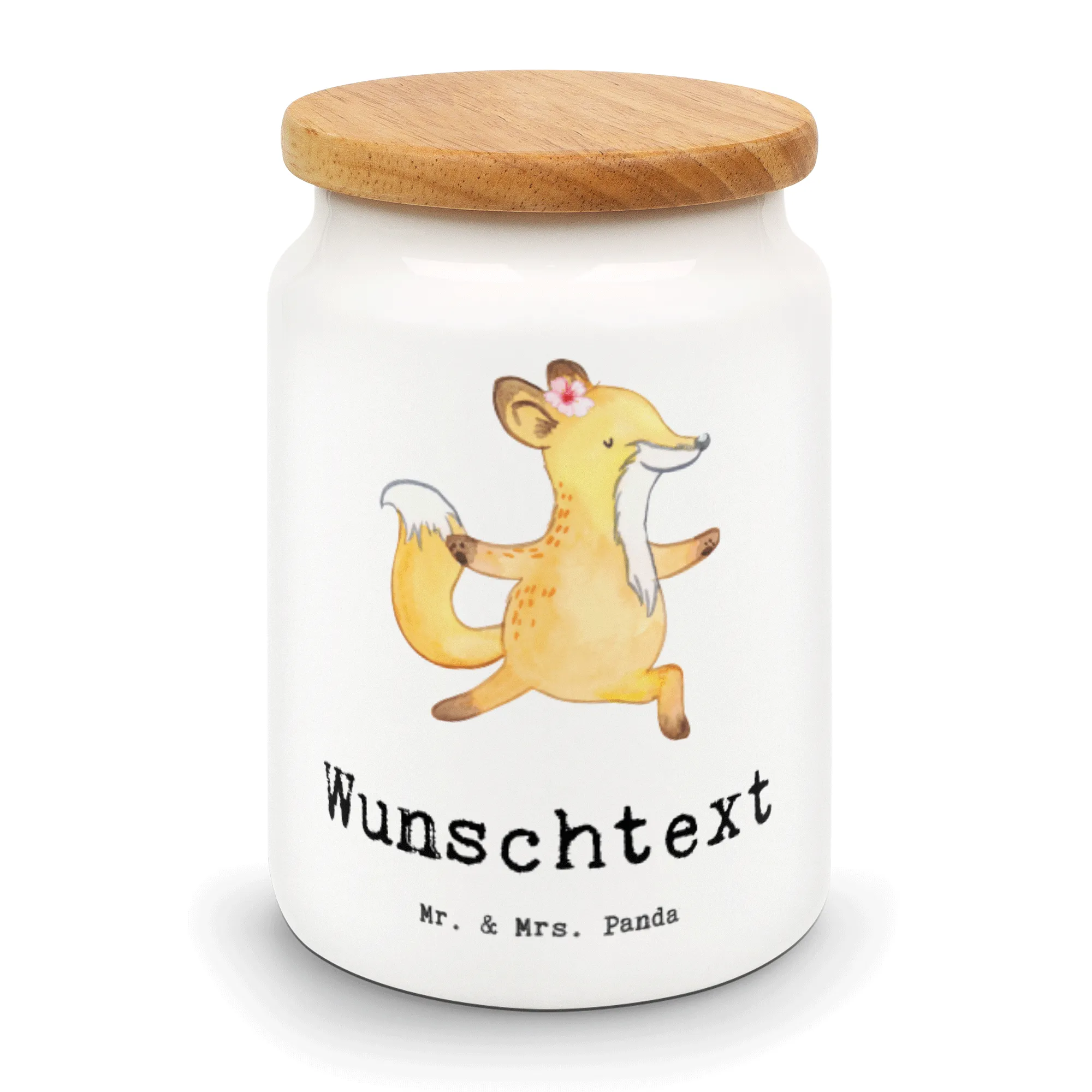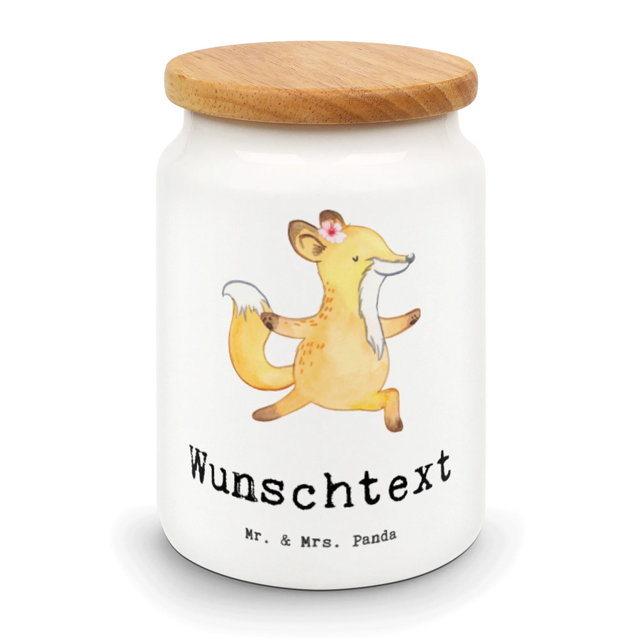 Der niedliche, weibliche Fuchs in der Yoga-Stellung des Kriegers vermittelt auf charmante Art und Weise die Freude an Bewegung und Entspannung. Du kannst diese Vorratsdose mit einem persönlichen Namen oder Wunschtext versehen, um sie noch individueller zu gestalten.