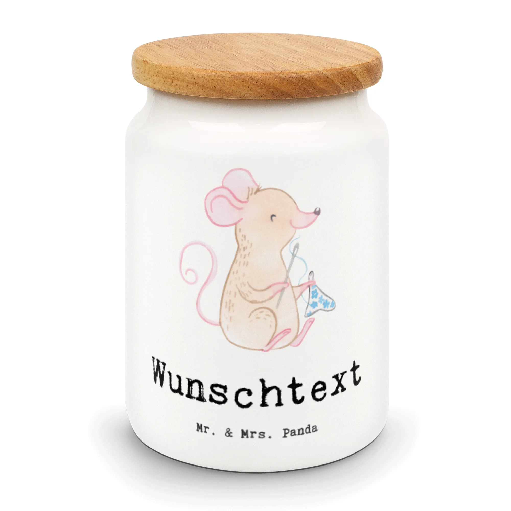 Die personalisierte Vorratsdose Maus Nähen Tage aus der Kollektion Hobby & Sport von Mr. & Mrs. Panda ist das perfekte Geschenk für Nähbegeisterte! Ob für dich selbst oder als liebevolles Präsent für Freunde, Familie oder Kollegen – diese wundervolle Keramikdose wird mit einem süßen Motiv einer kleinen Maus, die mit Nadel und Faden zaubert, verziert. Der Spruch "Es gibt schlechte Tage, und es gibt Tage, an denen ich nähe." bringt die Begeisterung fürs Nähen auf den Punkt.