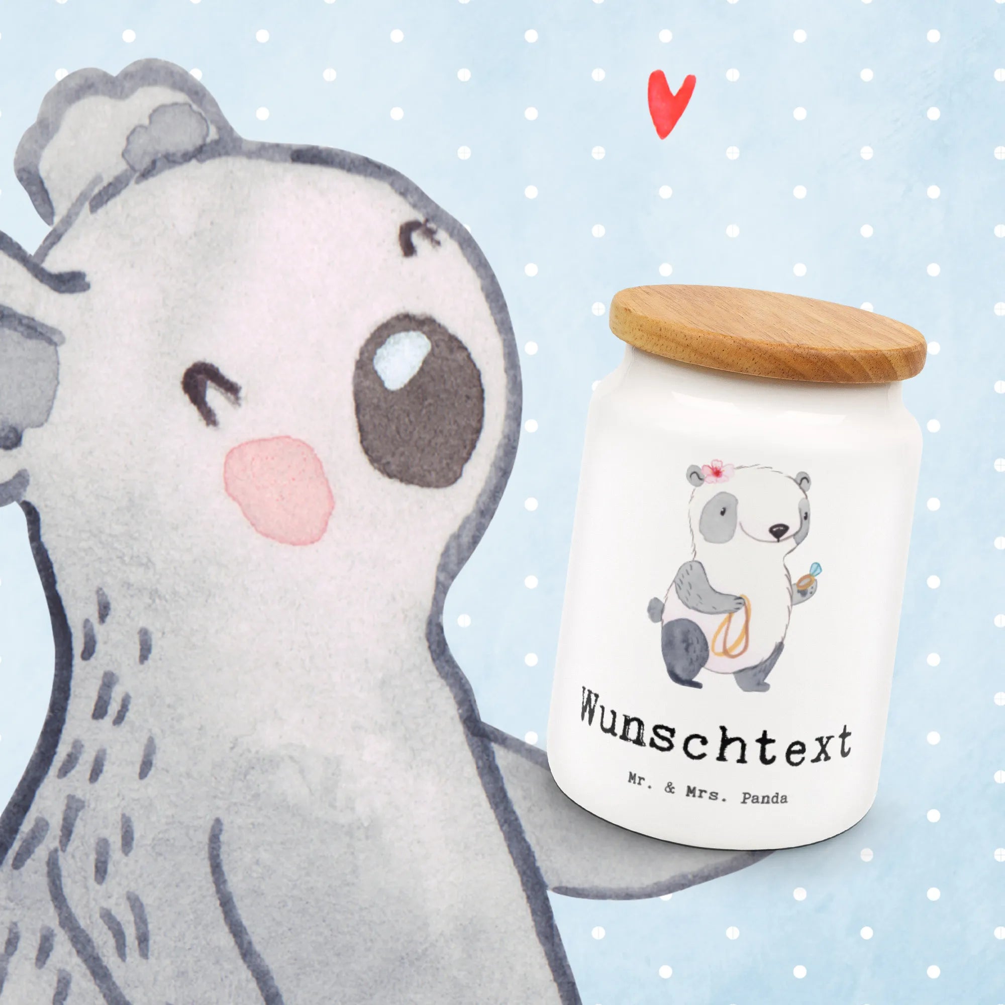 Die maßgeschneiderte Aufbewahrungslösung zeigt, wie besonders und geschätzt die Schmuckverkäuferin in deinem Leben ist. Auf der Vorratsdose kannst du einen Namen oder einen persönlichen Text hinzufügen, was sie zu einem ganz individuellen Geschenk macht. Das Motiv mit dem süßen Panda, der stolz seinen Goldschmuck präsentiert, verleiht der Dose zusätzlich Charme und Persönlichkeit.