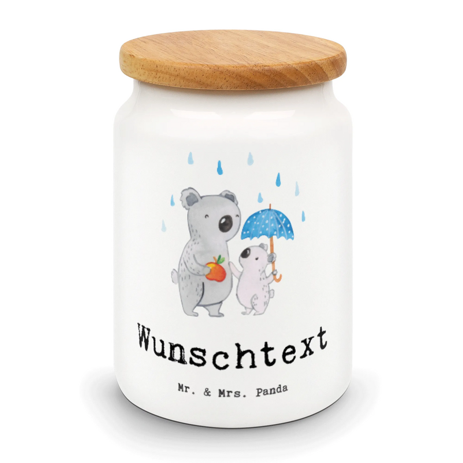Die personalisierte Vorratsdose "Tagesvater mit Herz" aus der kreativen Berufe Kollektion von Mr. & Mrs. Panda ist das perfekte Geschenk für all die wunderbaren Tagesväter da draußen! Mit einer liebevollen Illustration eines süßen Koalas und seines kleinen Koala-Kindes, die unter einem Regenschirm stehen, bringt diese Dose nicht nur Freude, sondern auch Funktionalität in die Küche oder das Kinderzimmer.