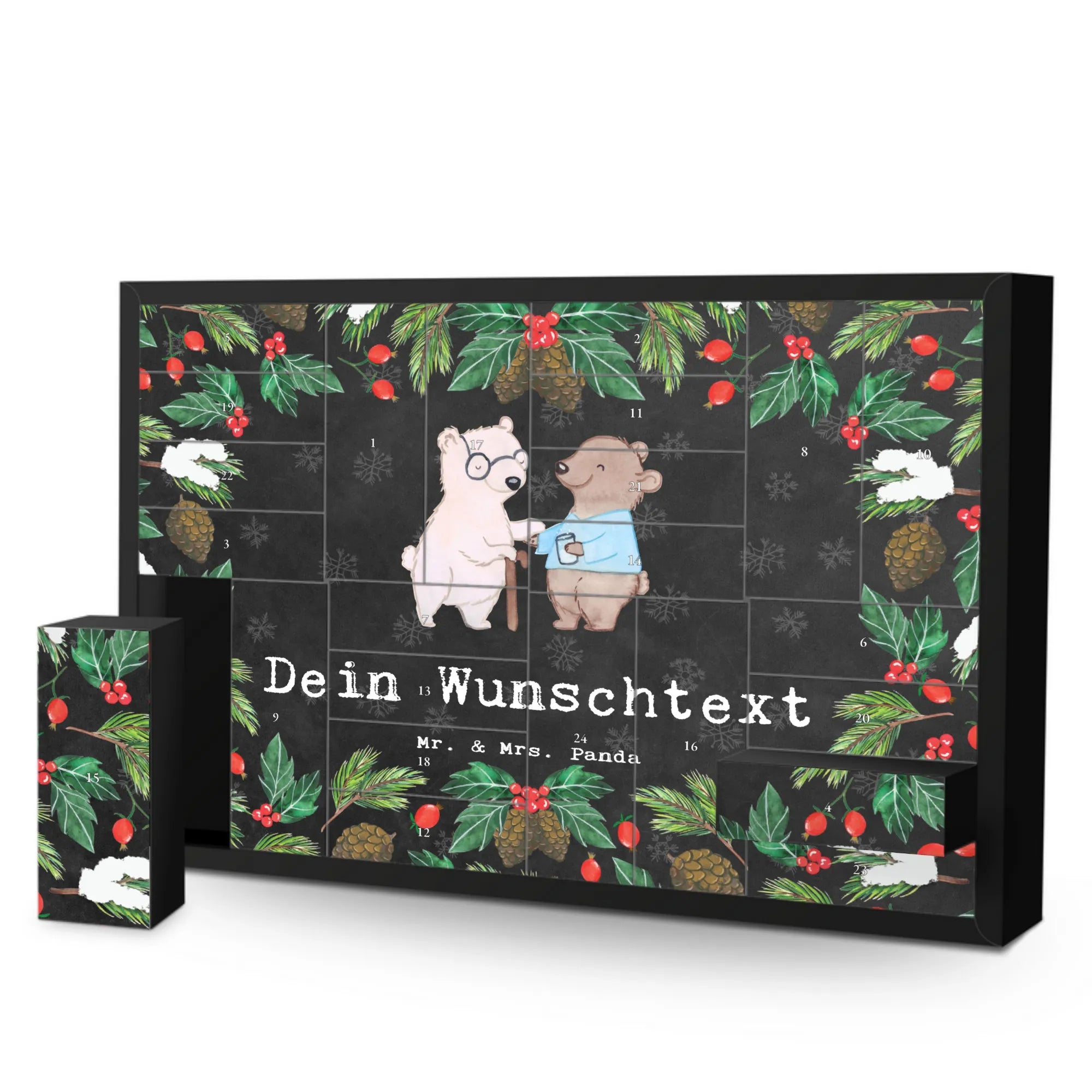 Der personalisierte befüllbare Adventskalender "Altenpfleger aus Leidenschaft" von Mr. & Mrs. Panda ist das perfekte Geschenk für alle, die in der Pflege arbeiten oder eine Ausbildung in der Altenpflege absolviert haben. Mit seiner liebevollen Illustration, die von Mrs. Panda handgezeichnet wurde, bringt dieser Adventskalender nicht nur Freude, sondern auch eine persönliche Note in die Vorweihnachtszeit.