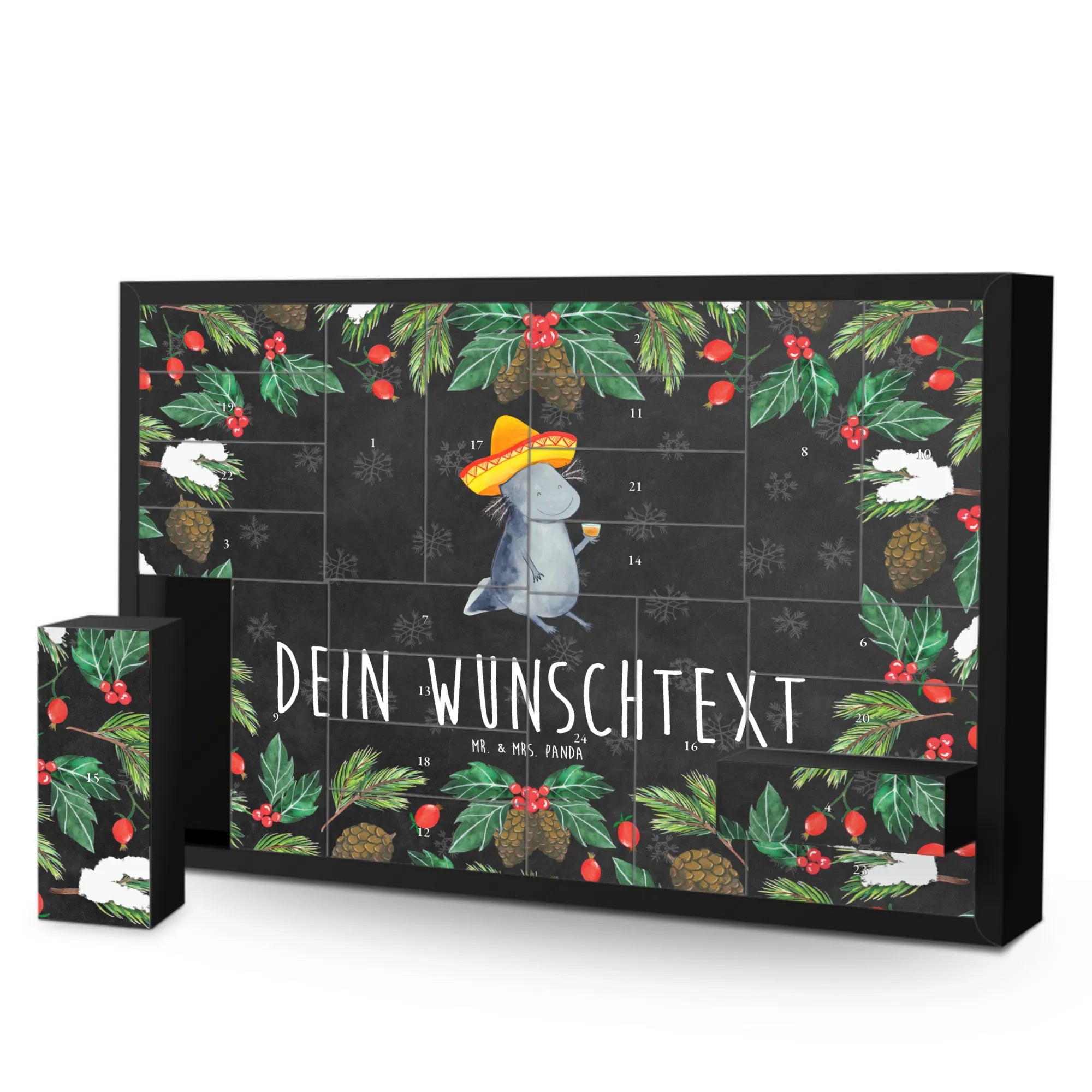Der personalisierte befüllbare Adventskalender mit dem Axolotl Tequila Motiv von Mr. & Mrs. Panda ist das perfekte Geschenk, um in der Adventszeit etwas ganz Besonderes zu verschenken. Egal, ob für deine Freunde, die Familie oder sogar für dich selbst – dieser Adventskalender begeistert jeden, der die süßen Axolotl und die mexikanische Lebensfreude liebt.