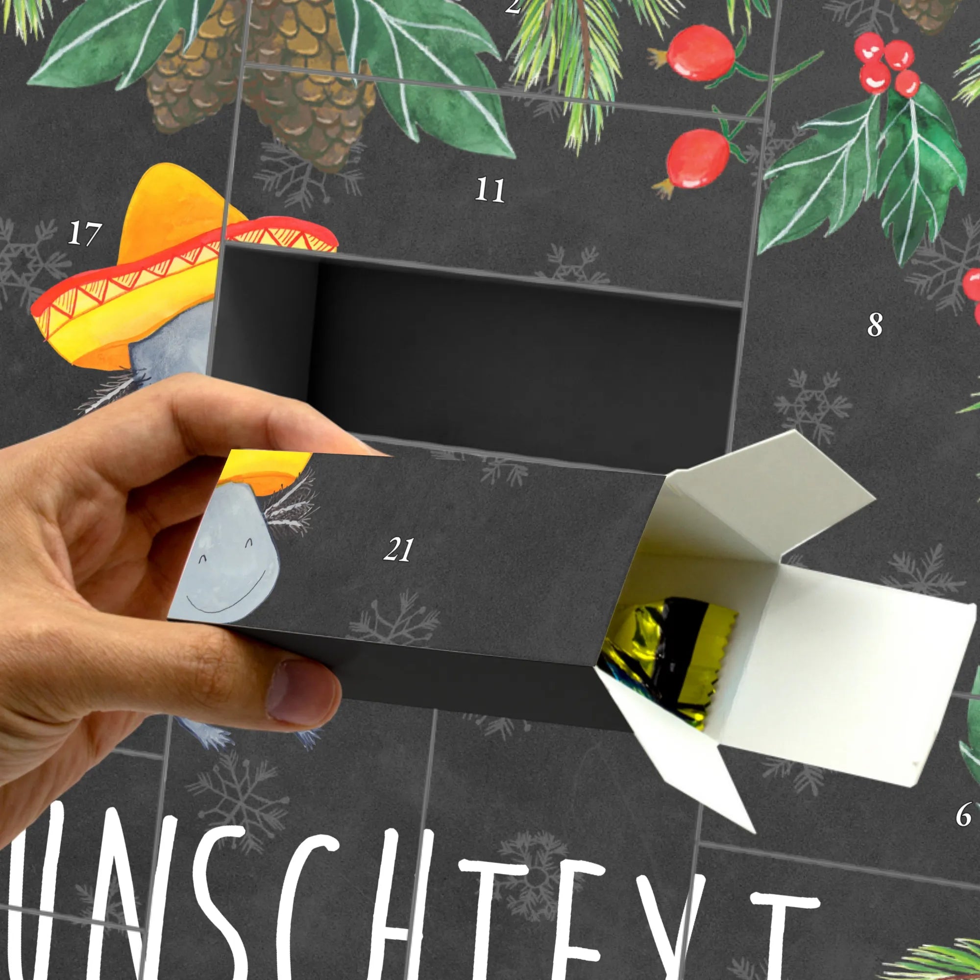 Ob zur Adventszeit, einem Geburtstag oder einfach nur so, um jemandem eine Freude zu machen – mit diesem liebevoll gestalteten Adventskalender sorgst du mit Sicherheit für leuchtende Augen. Die Axolotl-Kollektion von Mr. & Mrs. Panda ist eine farbenfrohe Sammlung voller Freude, Spaß und Lebensfreude. Hol dir das Lebensgefühl von Mexiko in dein Zuhause und erfreue dich an diesem einzigartigen Stück. Der Kalender ist nicht nur eine schöne Deko in der Adventszeit, sondern auch ein tolles Geschenk, das wahre Freude in die Herzen deiner Liebsten trägt.