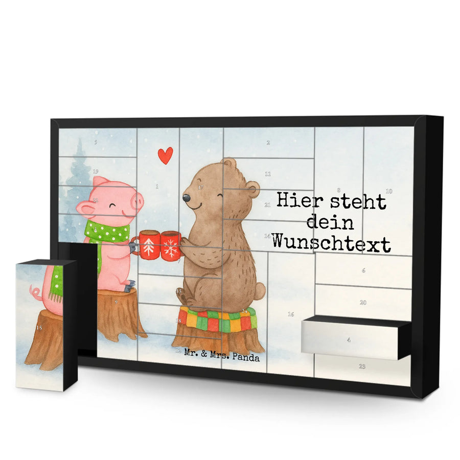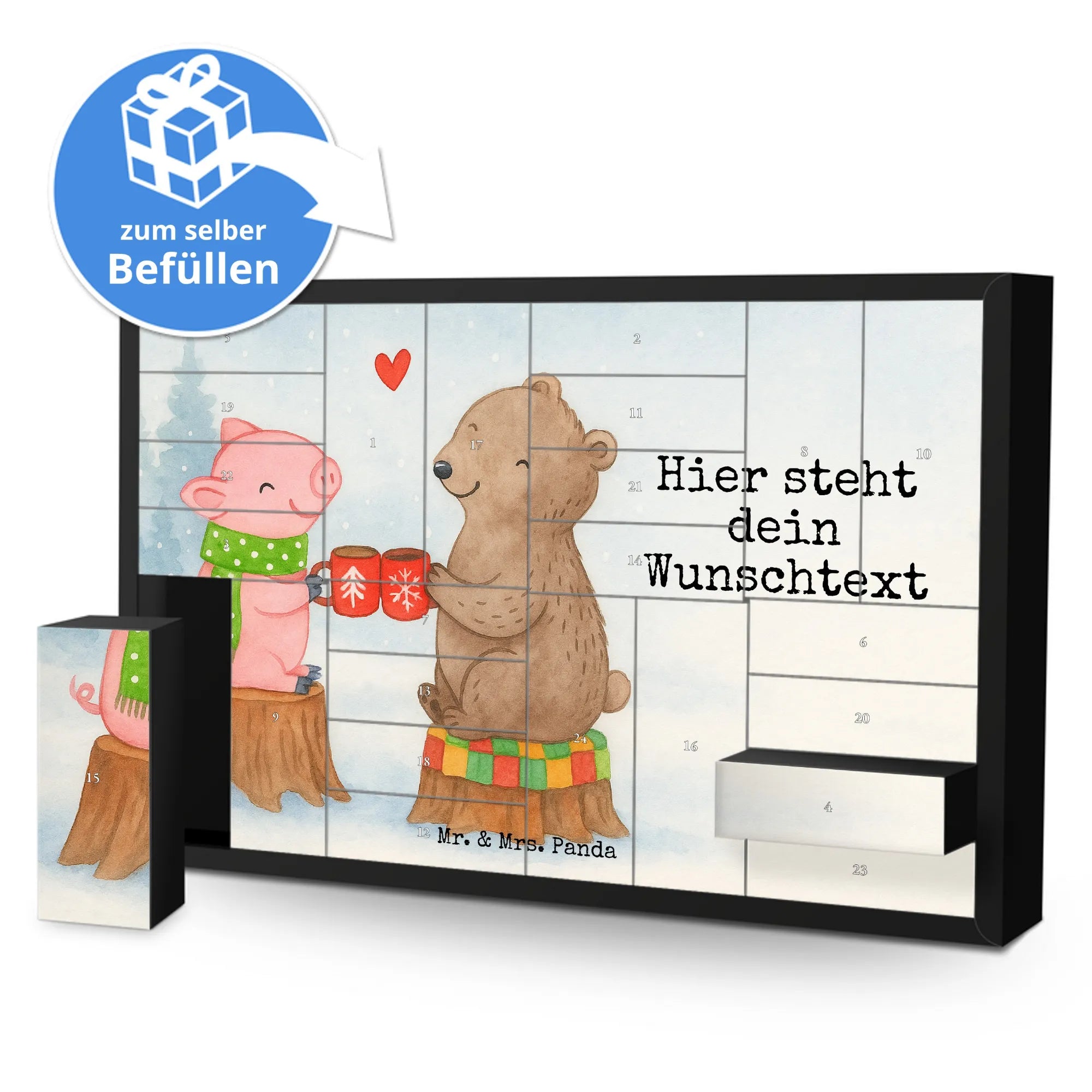 Personalisierter Befüllbarer Adventskalender von Mr. & Mrs. Panda – dein perfekter Begleiter durch die Vorweihnachtszeit! Dieser liebevoll gestaltete Adventskalender ist bedruckt mit wunderschönen Sprüchen und Motiven von Mr. & Mrs. Panda und lässt sich ganz nach deinem Geschmack personalisieren: Trage deinen Wunschnamen oder Wunschtext ein, und wir drucken ihn auf die Vorderseite. Auf der Frontseite findest du eine zauberhafte Zeichnung von Mrs. Panda, die dem Kalender einen warmen, persönlichen Touch verleiht. Der Kalender verfügt über 24 praktische Schachteln zum Selbstbefüllen, ideal für kleine Überraschungen, Süßigkeiten oder liebe Botschaften. Material: stabiler Adventskalender Karton mit brillanter Druckqualität und seidenmatter Oberfläche für eine hochwertige Optik. Besonderheit: inklusive Aufstellvorrichtung, sodass du den Kalender überall dekorativ platzieren kannst. Besonderer Hinweis: wird ohne Füllung geliefert – so kannst du ihn individuell bestücken. Maße: Breite: 619 mm, Höhe: 405 mm, Tiefe: 50 mm. Ein tolles Geschenk für Familie, Freunde oder als persönliche Deko für dein Zuhause. Bestelle jetzt deinen personalisierten Adventskalender und erfreue deine Liebsten jeden Tag im Dezember mit kleinen Überraschungen!