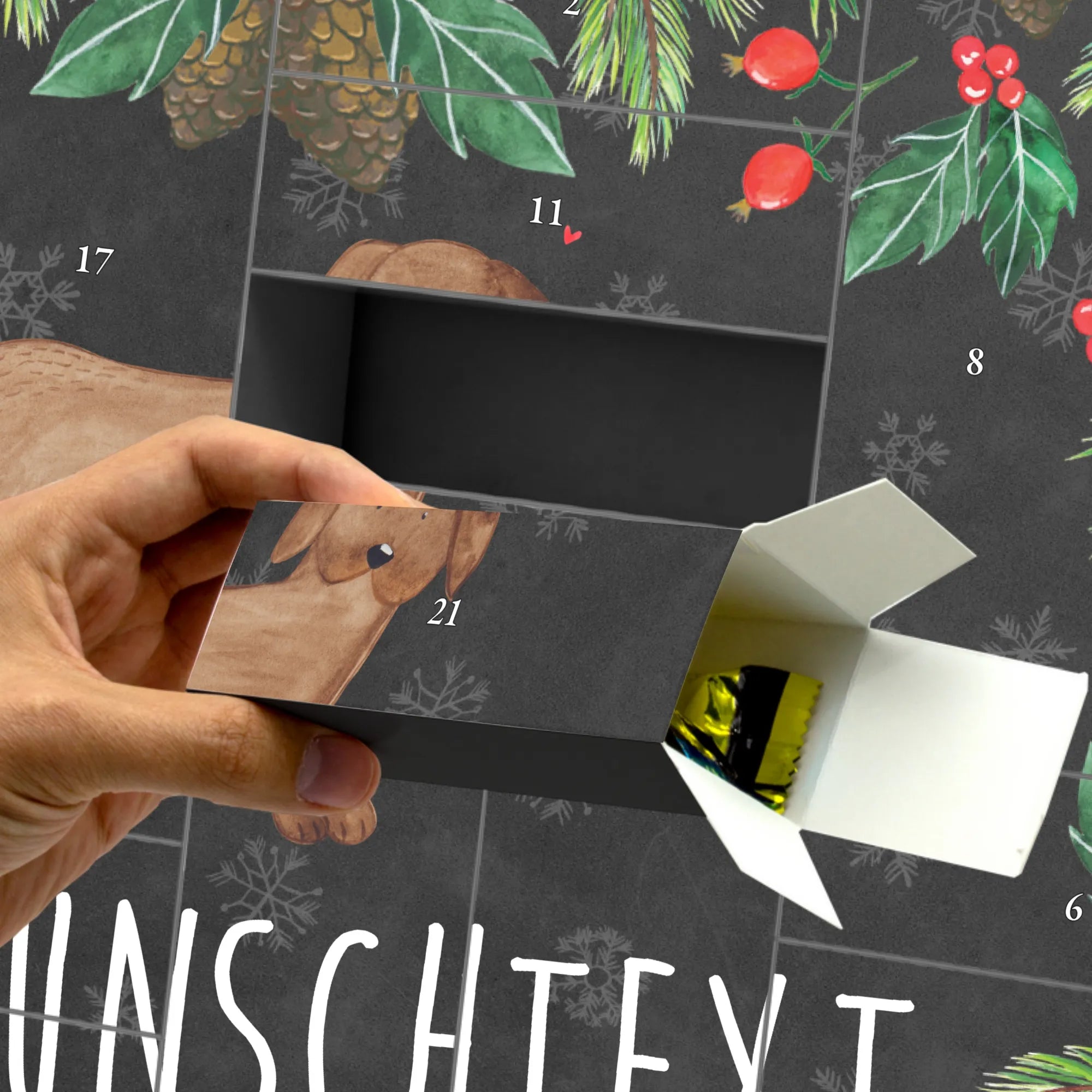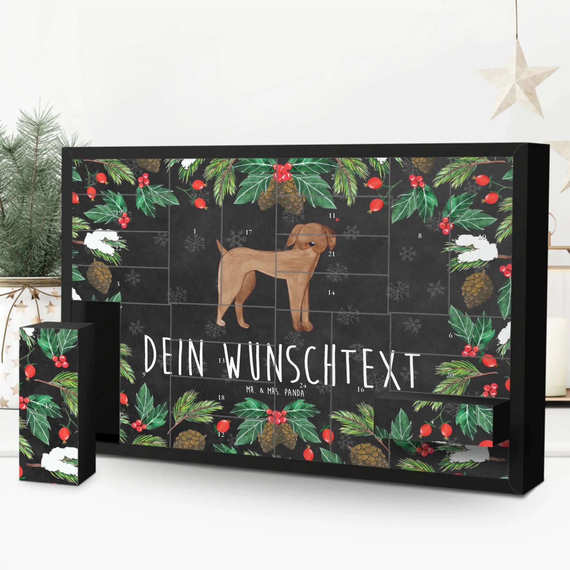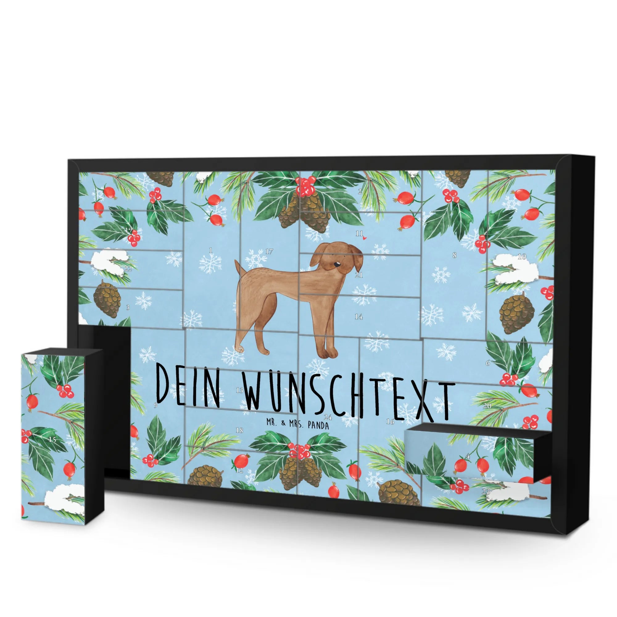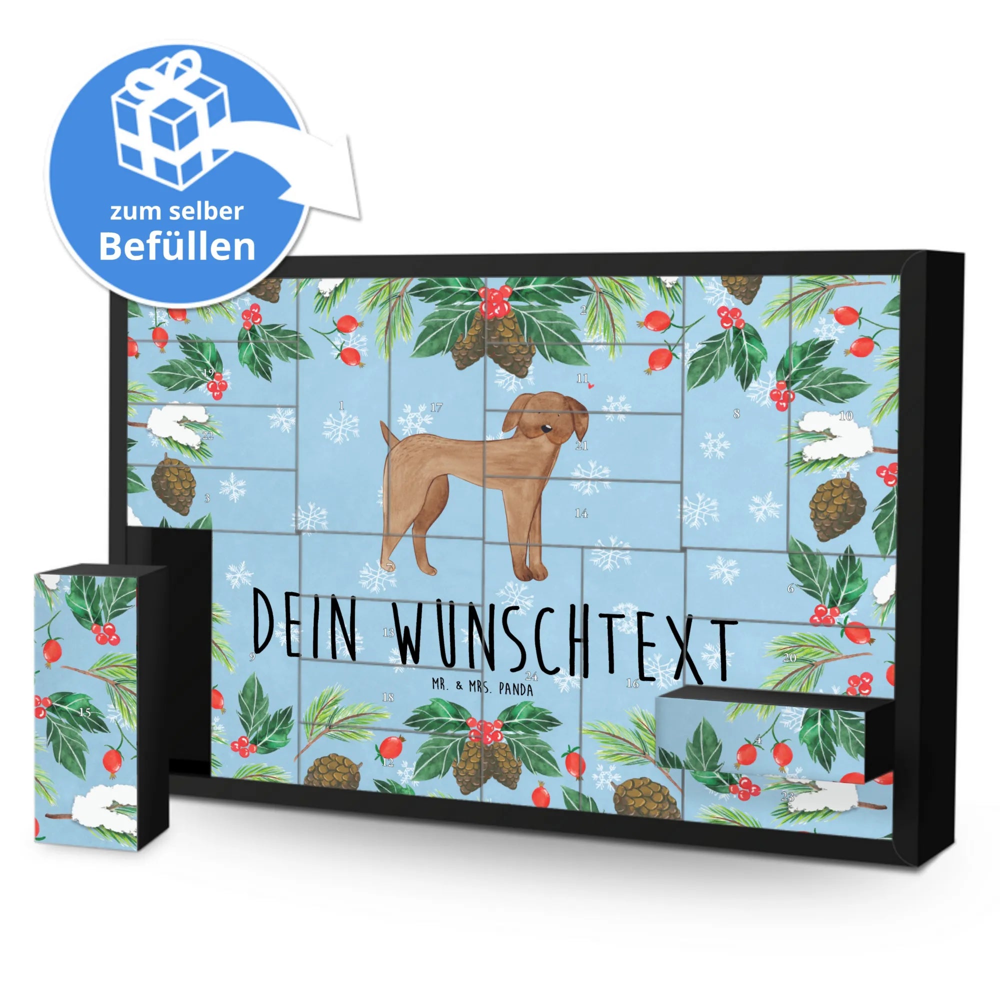 Der personalisierte befüllbare Adventskalender mit dem wunderschönen Motiv der Deutschen Dogge aus der Hunde Kollektion von Mr. & Mrs. Panda ist das perfekte Geschenk für alle Hundeliebhaber. Wenn du nach einer besonderen Überraschung suchst, die das Adventsgefühl zaubert und gleichzeitig deine Liebe zu Hunden ausdrückt, dann hast du mit diesem Adventskalender genau das Richtige gefunden!