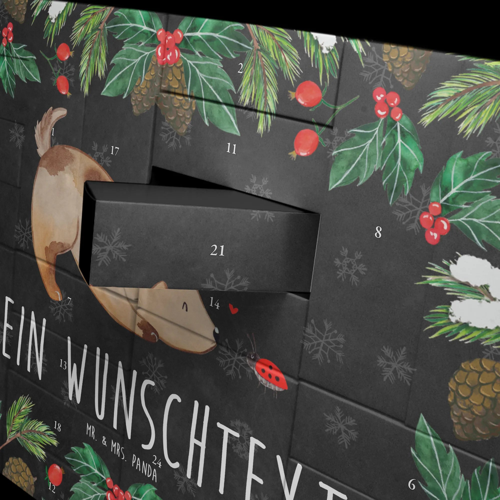 Der niedliche Hund, der vor einem kleinen Marienkäfer sitzt, verleiht diesem Adventskalender eine ganz besondere Note und macht ihn zu einem tollen Highlight in jeder Wohnung. Die liebevolle Zeichnung von Mrs. Panda zieht nicht nur die Blicke auf sich, sondern breitet auch eine warmherzige Atmosphäre aus. Und mit dem inspirierenden Slogan "Glaube an Wunder, habe Tagträume..." ermutigt dieser Kalender jeden, die Magie der Weihnachtszeit zu spüren.