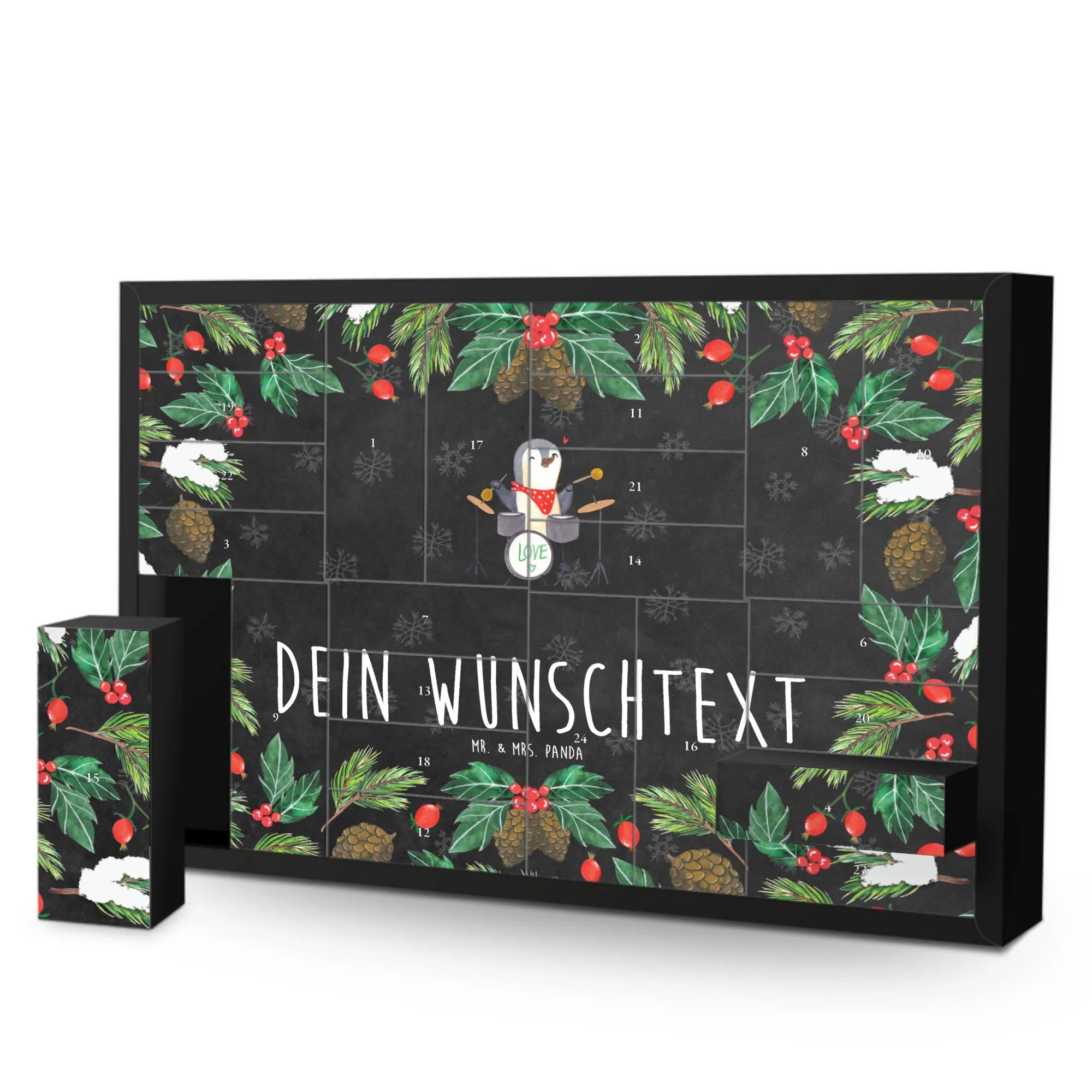 Der personalisierte, befüllbare Adventskalender mit dem fröhlichen Pinguin Schlagzeug-Motiv von Mr. & Mrs. Panda ist die perfekte Überraschung für Musikliebhaber und Musiker. Lass die Vorfreude auf Weihnachten mit einem Kalender steigen, der nicht nur schön aussieht, sondern auch von Herzen kommt.