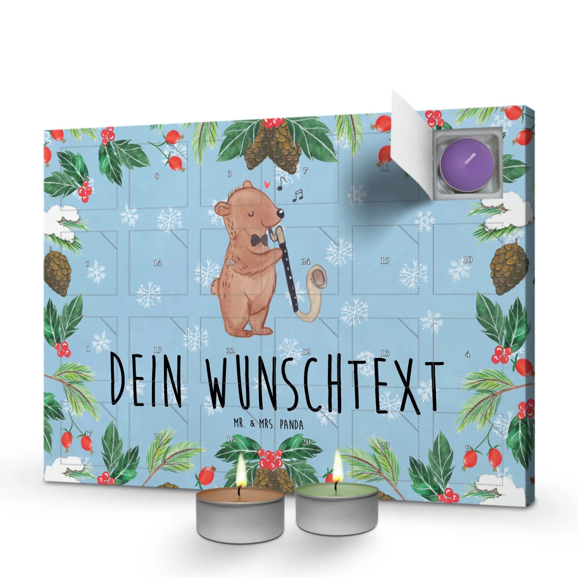 Der personalisierte Duftkerzen Adventskalender von Mr. & Mrs. Panda ist das perfekte Geschenk für Musikliebhaber und Musiker. Mit einem bezaubernden Motiv eines Bären, der auf einem Bassethorn spielt, bringt dieser Adventskalender weihnachtliche Stimmung in jedes Zuhause. Auf der Frontseite ist eine liebevolle Zeichnung von Mrs. Panda abgebildet, die den Bären in voller musikalischer Entfaltung zeigt, umgeben von Noten und einem Herz.