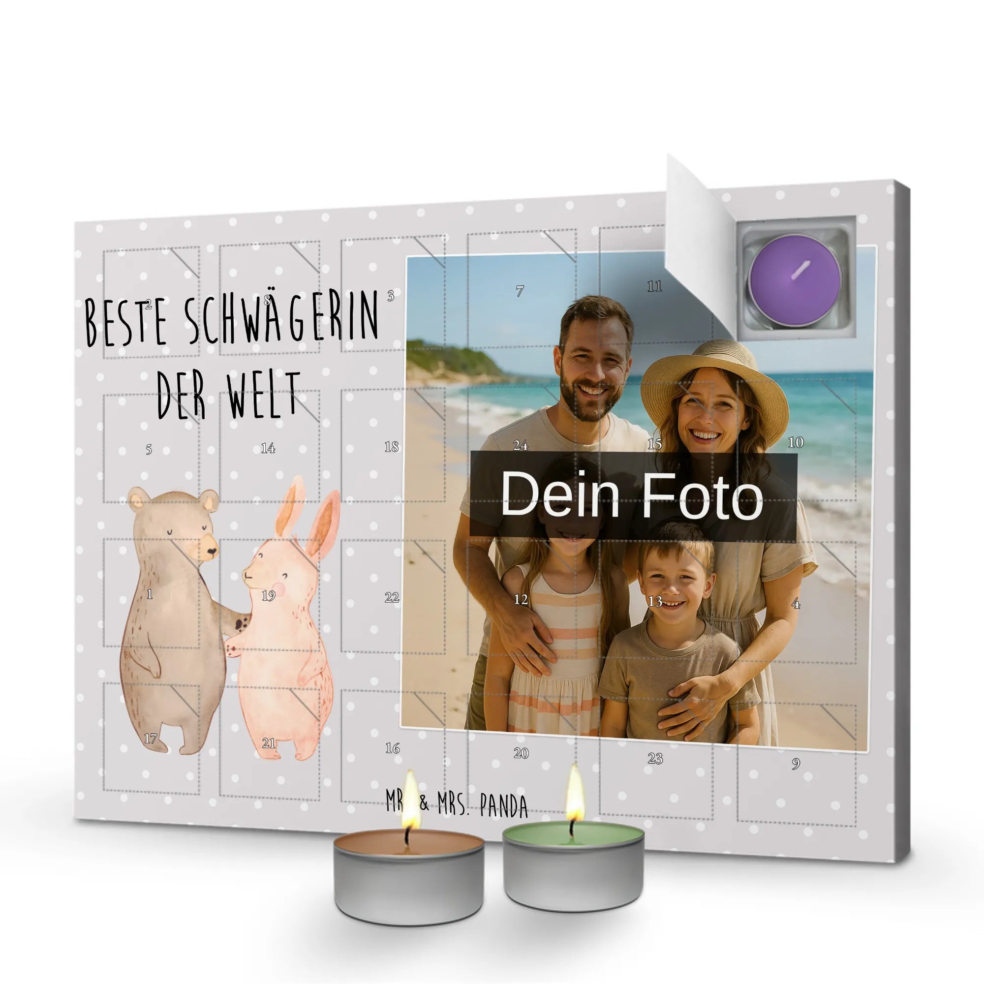 Der personalisierte Duftkerzen Foto Adventskalender "Hase Beste Schwägerin der Welt" ist das perfekte Geschenk für deine Schwägerin! Ob zum Geburtstag, zu Weihnachten oder einfach als Dankeschön - dieser Kalender zaubert ein Lächeln auf ihr Gesicht.