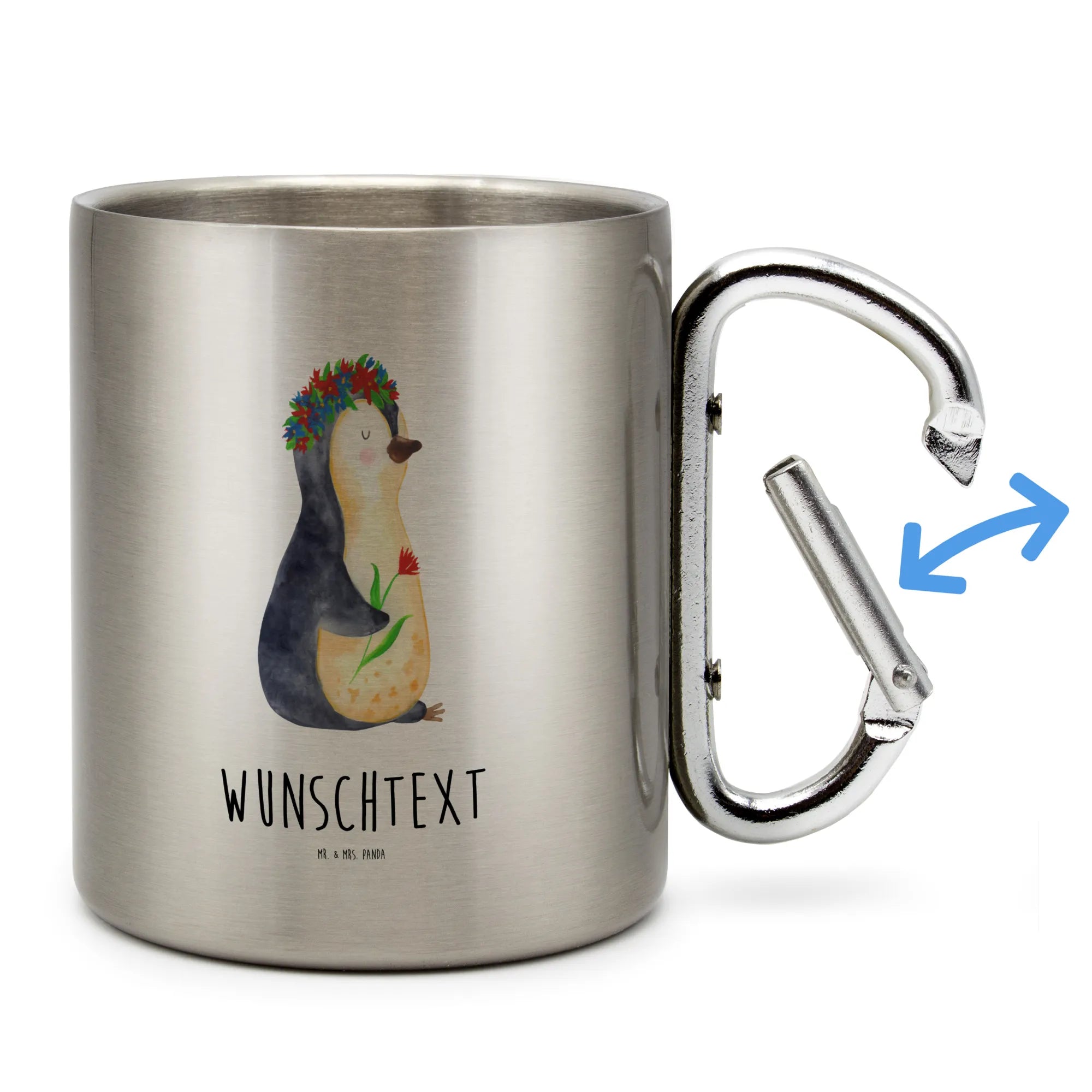 Personalisierter Edelstahlbecher Pinguin Blumenkranz