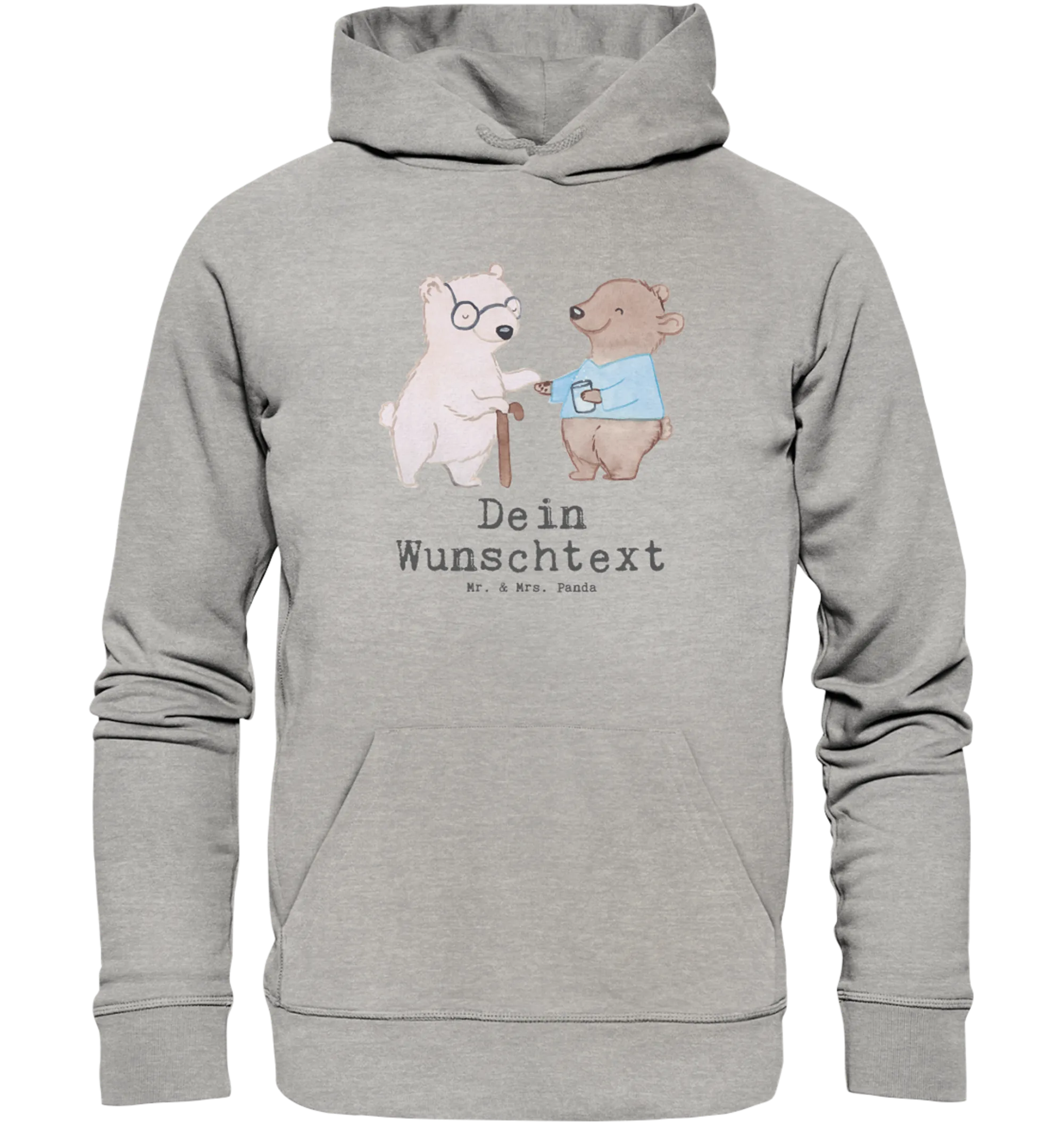 Der personalisierte Hoodie "Altenpfleger mit Herz" von Mr. & Mrs. Panda ist das perfekte Geschenk für jeden Altenpfleger. Mit einem niedlichen Motiv eines Bären, der einem älteren Bären mit Krückstock hilft, und dem Spruch "Du bist nur ein halber Mensch, wenn du kein Altenpfleger bist!", bringt dieser Hoodie ein Lächeln auf die Gesichter. Er ist nicht nur stylisch, sondern auch aus besonders weicher Bio-Baumwolle gefertigt und damit äußerst angenehm zu tragen.