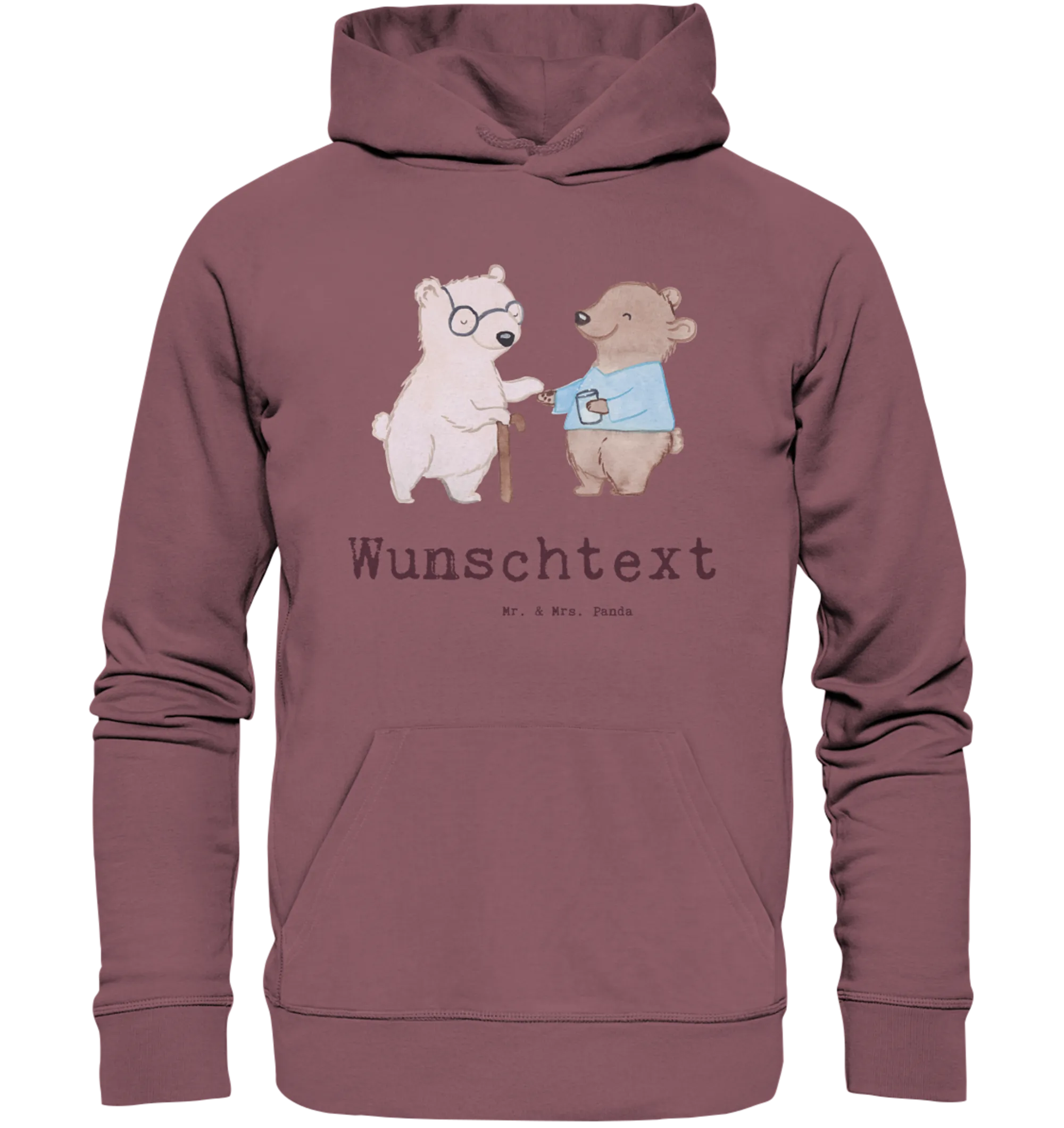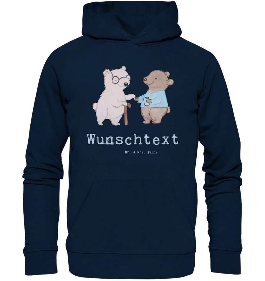 Personalisierter Hoodie „Altenpfleger mit Herz“ – das liebevolle Geschenk für alle, die in der Pflege ihr Herz verschenken. Unser Bio Hoodie mit Namen zeigt ein zärtliches Motiv: Ein kleiner Bär reicht einem älteren Bären mit Krückstock die Hand. Der ergänzende Spruch „Du bist nur ein halber Mensch, wenn du kein Altenpfleger bist.“ macht dieses Teil zu einer herzlichen Anerkennung für Pflegerinnen und Pfleger.