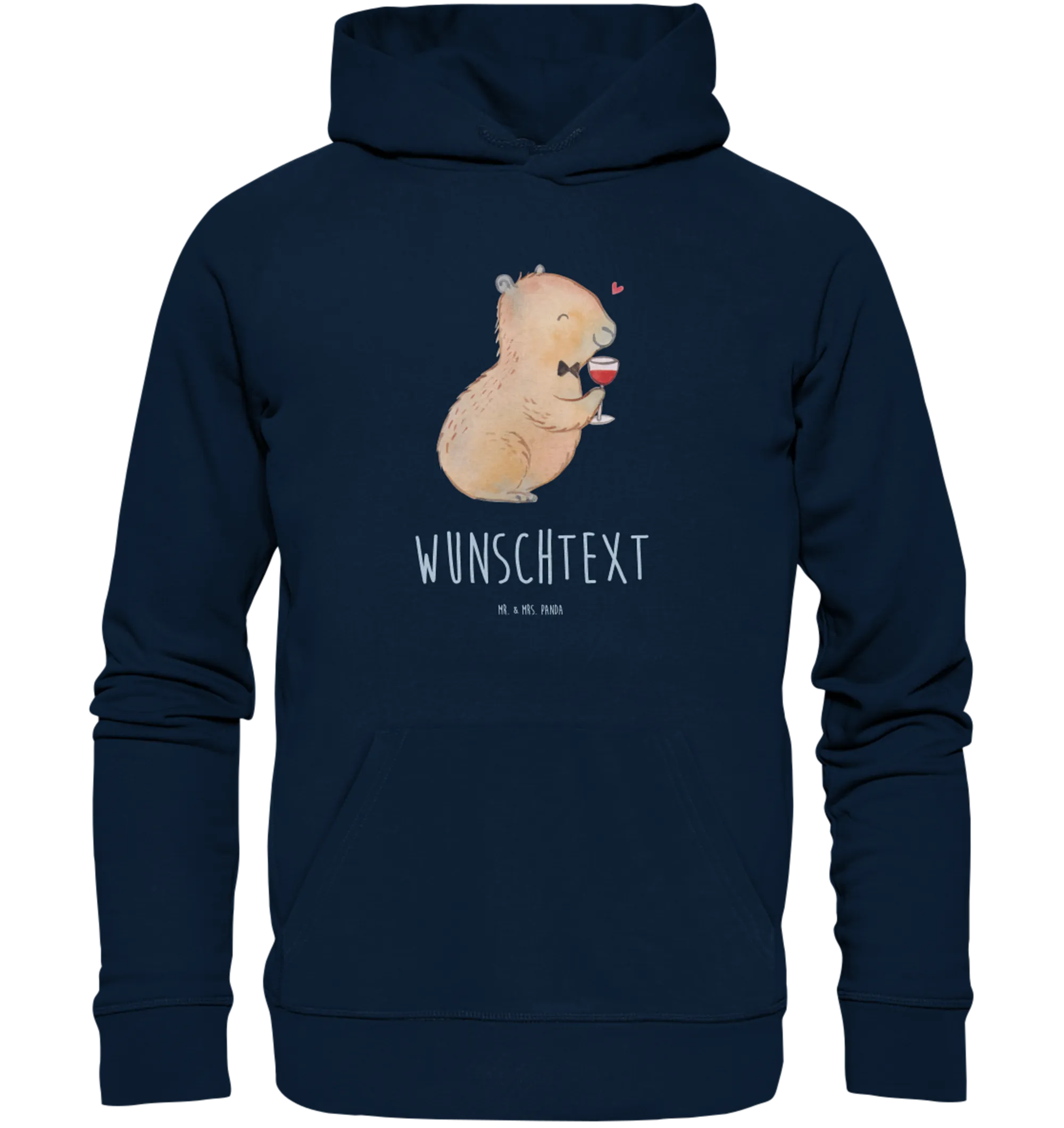 Du suchst das perfekte Geschenk für einen Weinliebhaber? Unser personalisierten Hoodie mit dem charmanten Capybara Wein Motiv aus der Small World Kollektion von Mr. & Mrs. Panda ist die ideale Wahl!