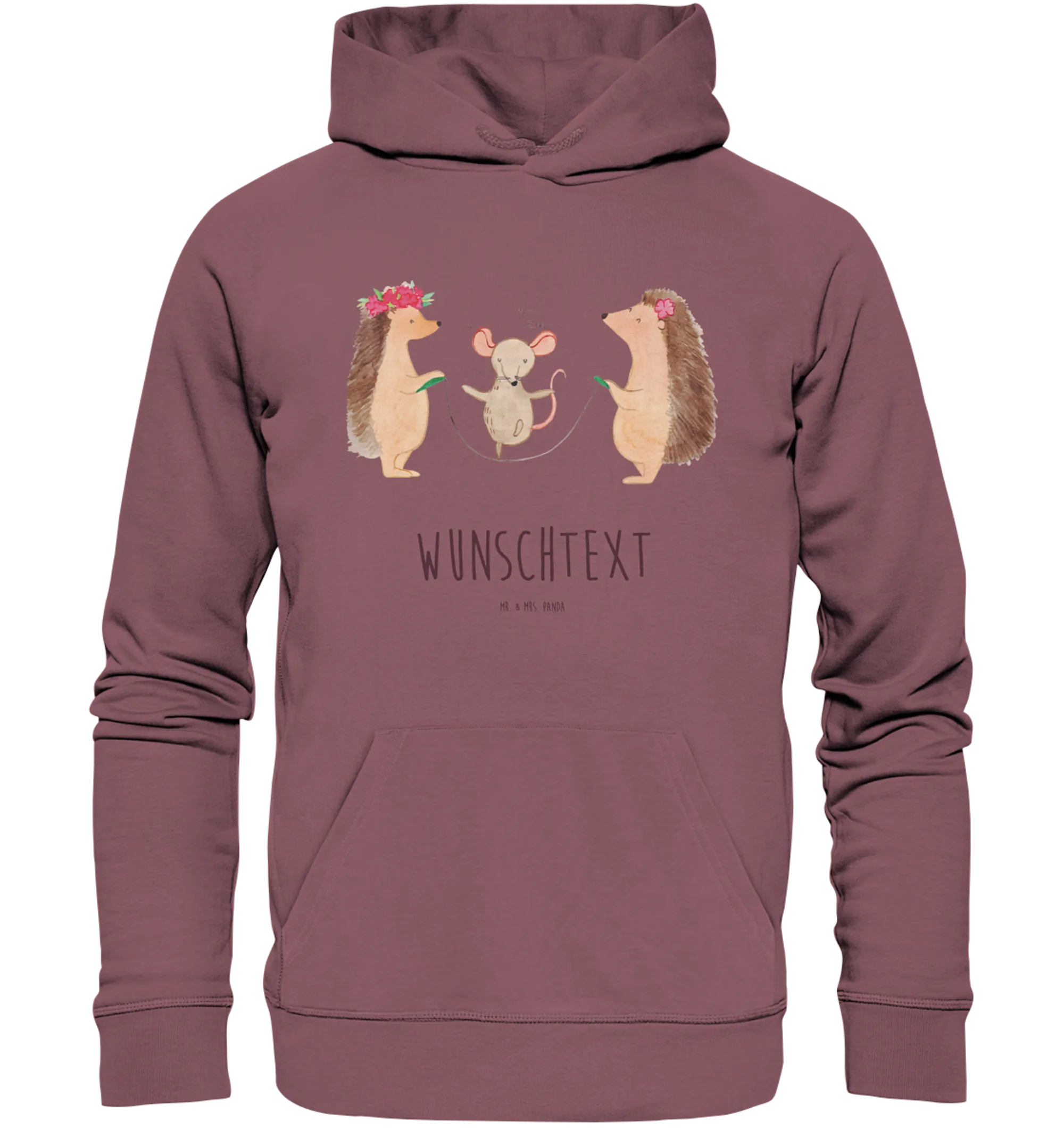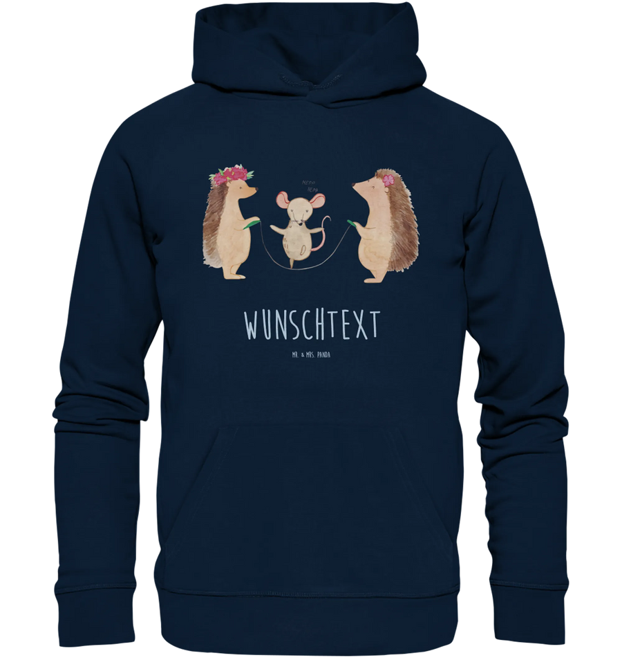 Unser Bio Hoodie mit Namen kombiniert zauberhafte Illustration, Nachhaltigkeit und persönliche Note. Das handgezeichnete Motiv zeigt zwei fröhliche Igel und eine kleine Maus beim Seilspringen – eine Szene voller Lebensfreude, Zusammenhalt und guter Laune. Der liebevolle Slogan „Jeder hat diese Freunde, die man schon ewig kennt, die alle deine Geheimnisse kennen, wissen wie verrückt du bist und dich trotzdem lieben.“ macht den Hoodie zu einem emotionalen Lieblingsstück.