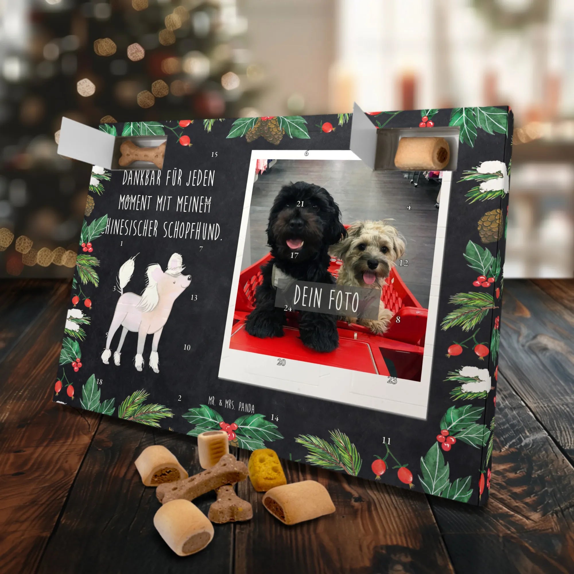 Der personalisierte Hunde Foto Adventskalender mit dem Motiv "Chinesischer Schopfhund" von Mr. & Mrs. Panda ist das perfekte Geschenk für jeden Hundeliebhaber. Dieser Adventskalender ist nicht nur ein einfacher Kalender, sondern ein liebevoll gestaltetes Stück, das dabei hilft, die Vorfreude auf die besinnliche Zeit des Jahres zu steigern. Mit 24 kleinen Fächern, gefüllt mit köstlichen Hundekeksen, sorgt er für große Freude bei deinem Vierbeiner und lässt ihn jeden Tag aufs Neue schmunzeln.