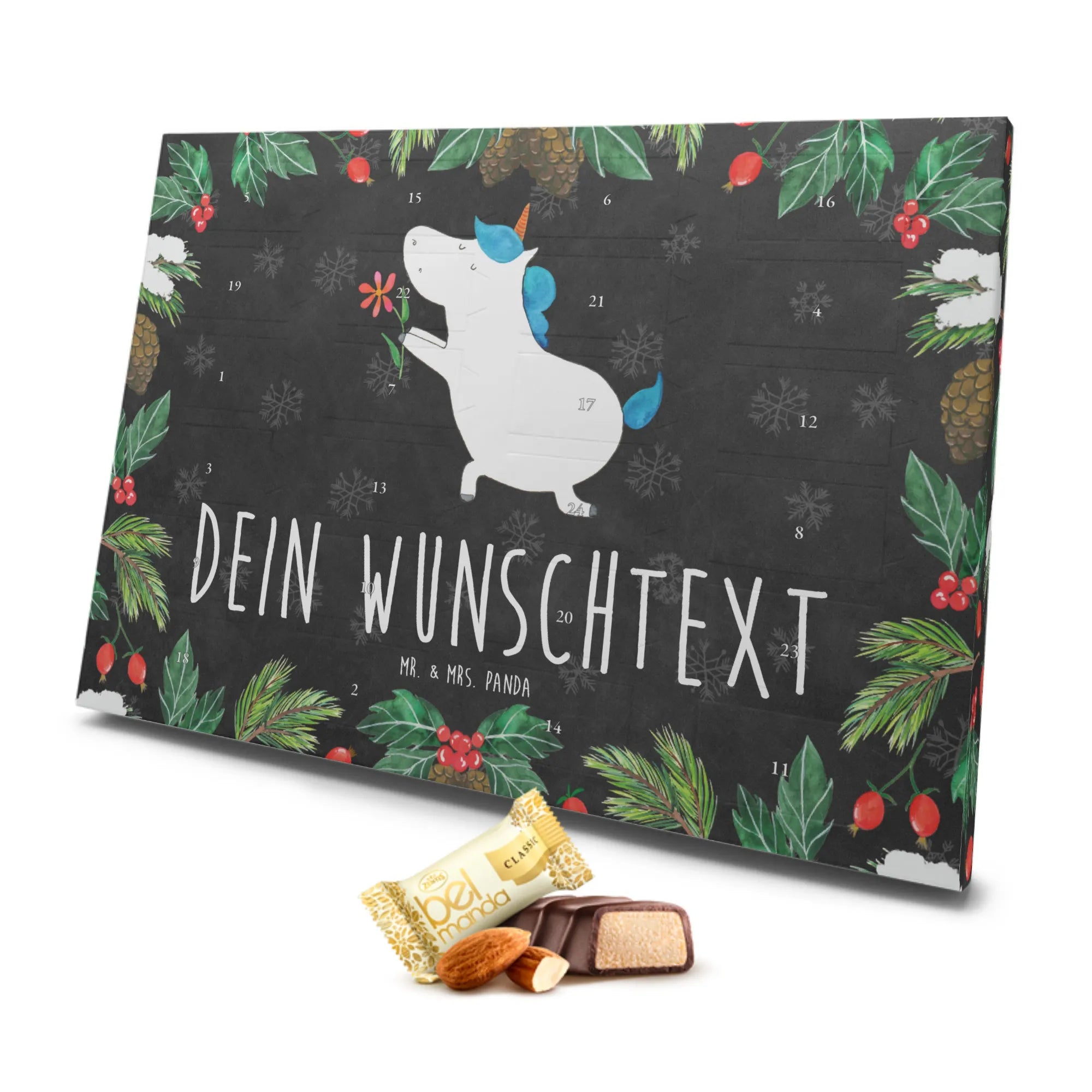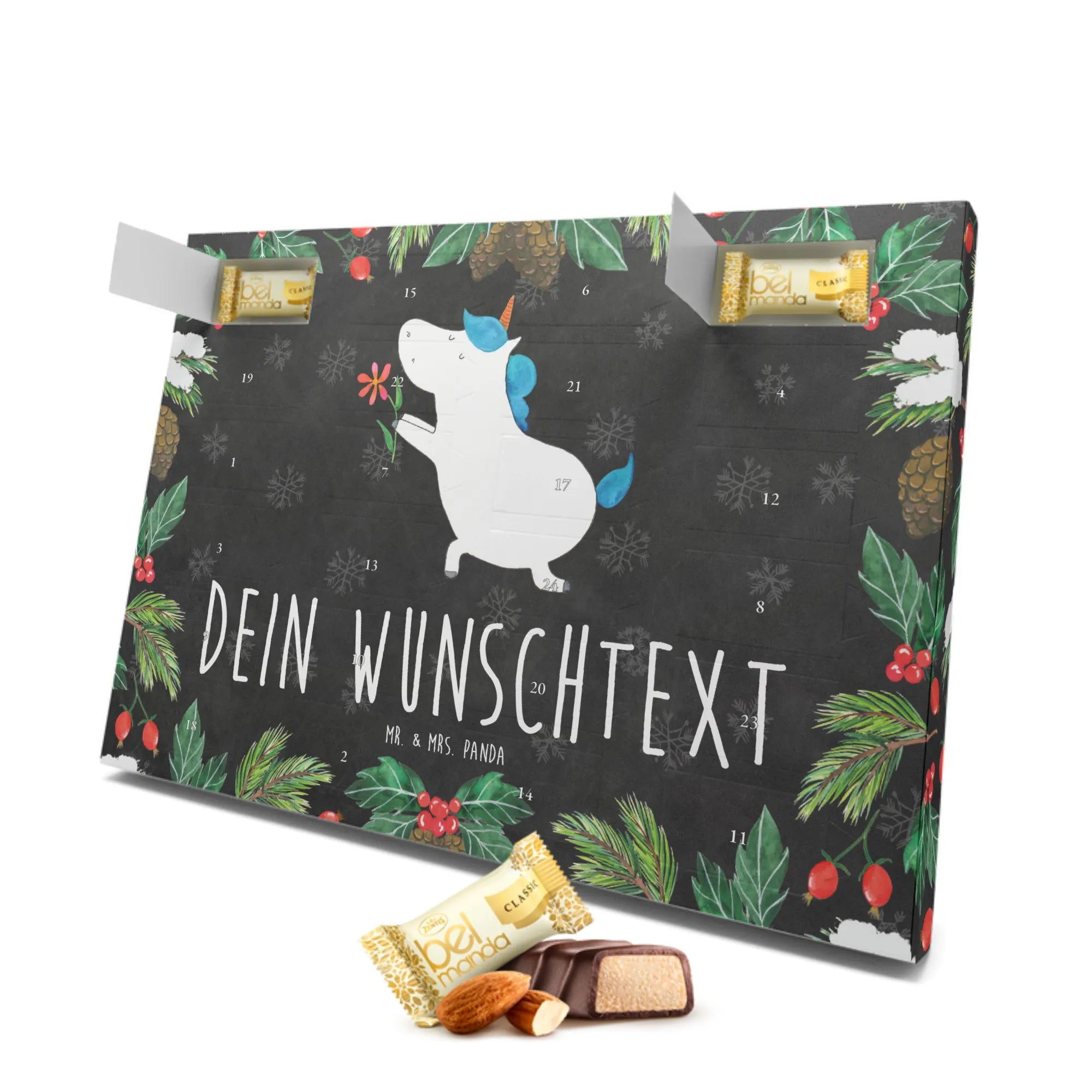 Der personalisierte Marzipan Adventskalender von Mr. & Mrs. Panda ist nicht nur ein Fest für die Sinne, sondern auch das perfekte Geschenk für alle Einhorn-Liebhaber! Mit dem zauberhaften Motiv 'Einhorn Blume' aus unserer speziellen Einhorn-Kollektion wird jeder Adventstag zum Erlebnis.