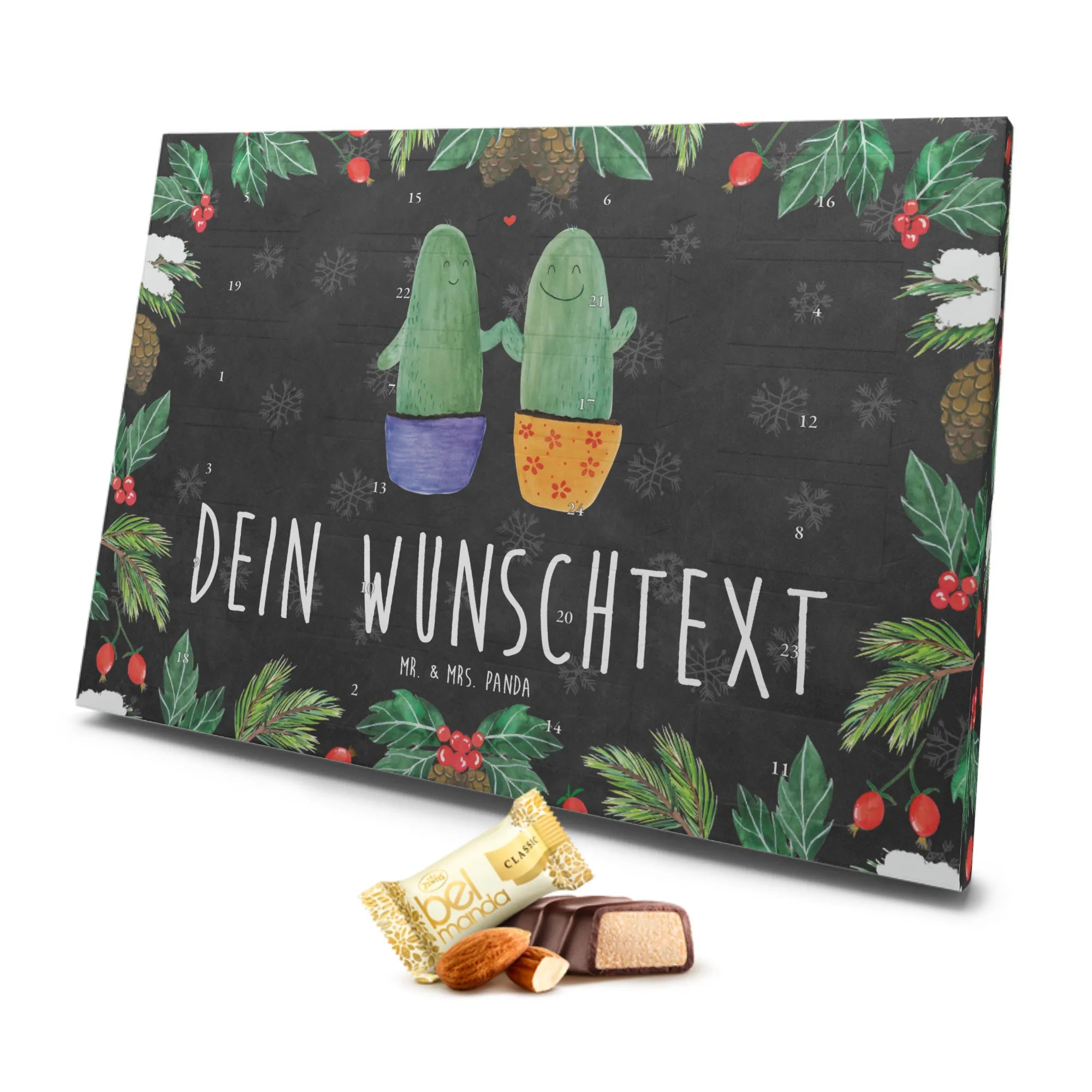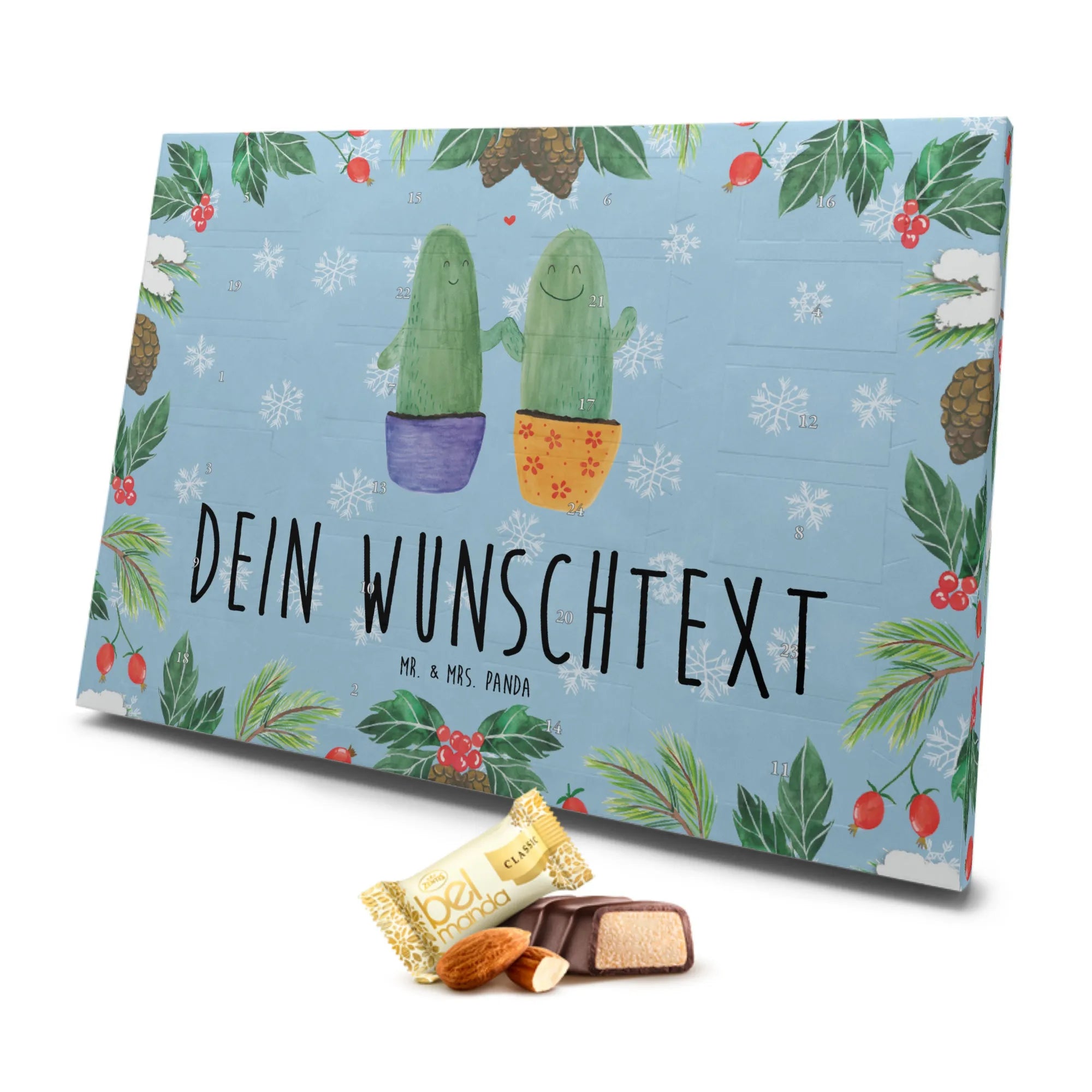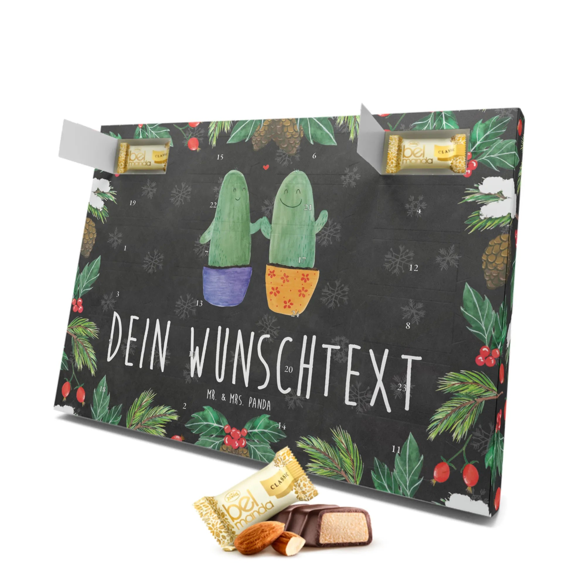 Der personalisierte Marzipan Adventskalender Kaktus Liebe von Mr. & Mrs. Panda ist das perfekte Geschenk für all diejenigen, die das Besondere schätzen und gerne ihre Liebe auf kreative Art und Weise zeigen möchten. Diese wundervolle Geschenkidee vereint die süßesten Kaktus-Motive mit zartem Marzipan und sorgt für eine festliche Stimmung in der Vorweihnachtszeit.