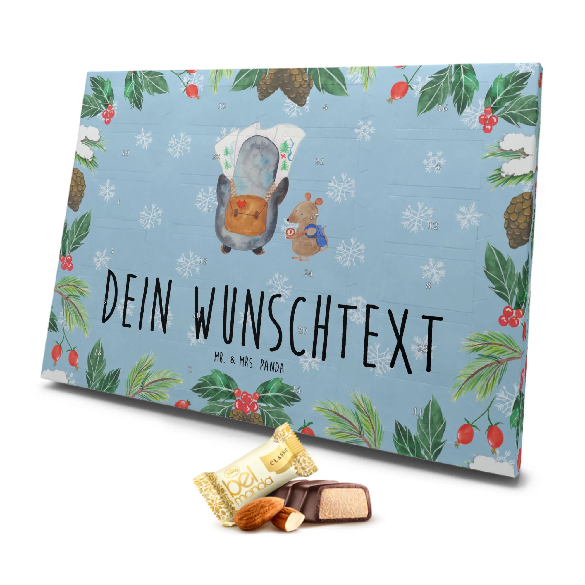 Der personalisierte Marzipan Adventskalender Pinguin & Maus Wanderer ist das perfekte Geschenk für alle, die Abenteuer und die süßen Seiten des Lebens lieben. Dieses einzigartige Produkt aus der Pinguin-Kollektion bietet dir die Möglichkeit, deinen Advent mit einem Hauch von Kreativität und Individualität zu bereichern. Die bezaubernden Motive von Mr. & Mrs. Panda bringen die unbeschwerte Freude der winterlichen Adventszeit direkt zu dir nach Hause.